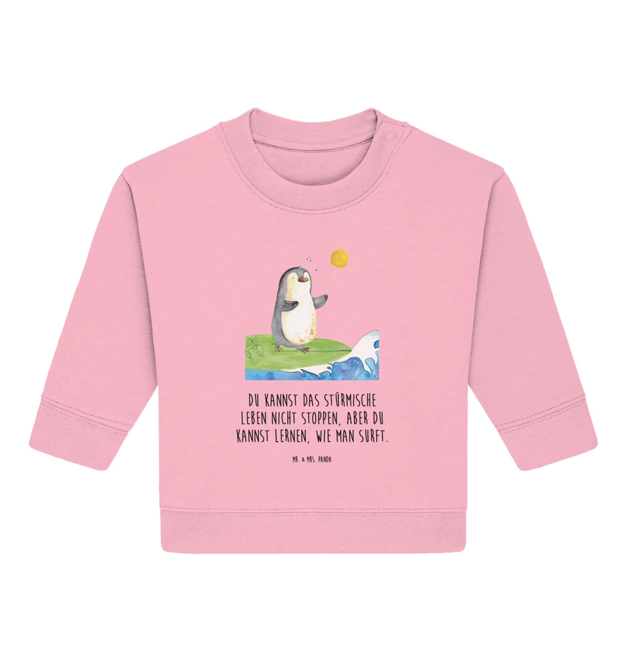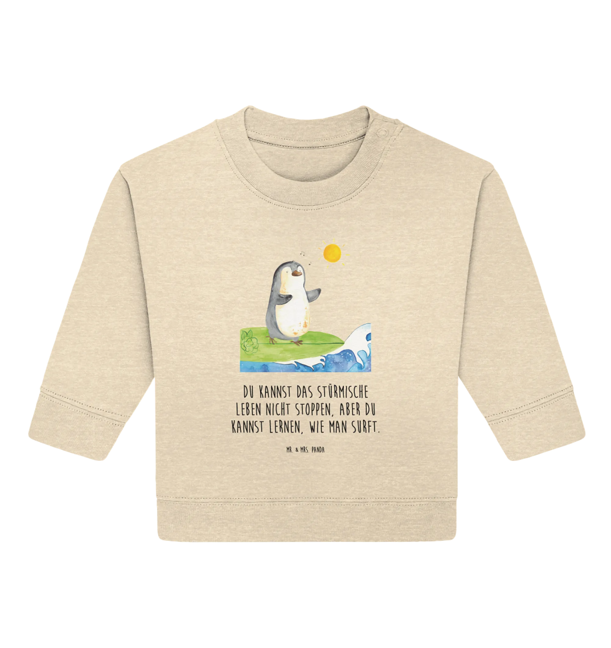 Entdecke den bezaubernden Organic Baby Pullover mit dem süßen Pinguin Surfer Motiv aus der exklusiven Pinguin - Kollektion von Mr. & Mrs. Panda! Dieser Baby Sweatshirt ist perfekt für kleine Abenteurer, die das Leben am Meer lieben. Der Pinguin, der mit seiner coolen Sonnenbrille auf dem Surfbrett sitzt, inspiriert deinen kleinen Schatz dazu, das stürmische Leben mit einem Lächeln zu meistern. Der Pullover kombiniert eine hochwertige Verarbeitung mit nachhaltigen Materialien – aus 100% ökologischer Baumwolle. Damit bleibt dein Baby nicht nur warm, sondern tut auch der Umwelt etwas Gutes!