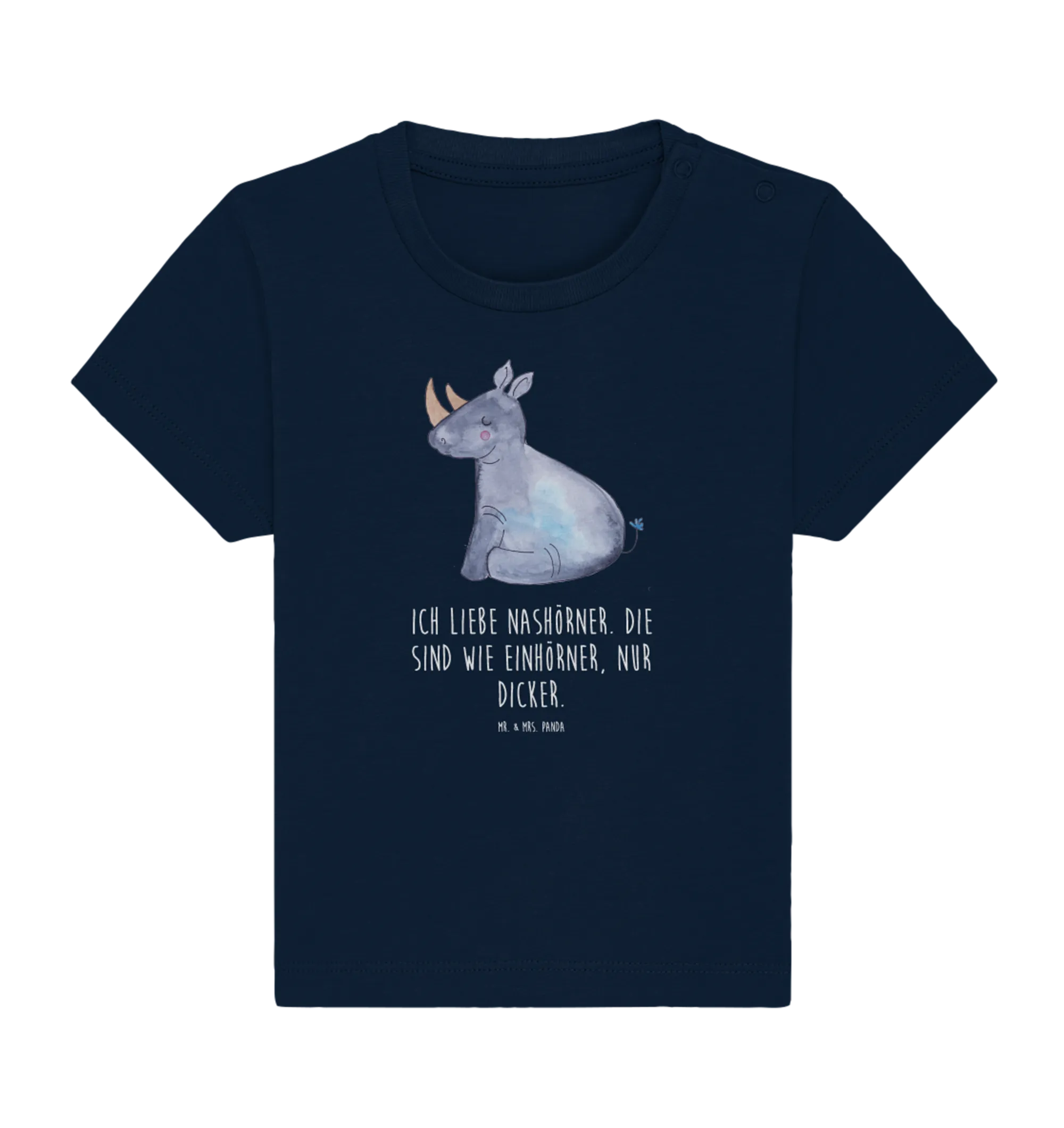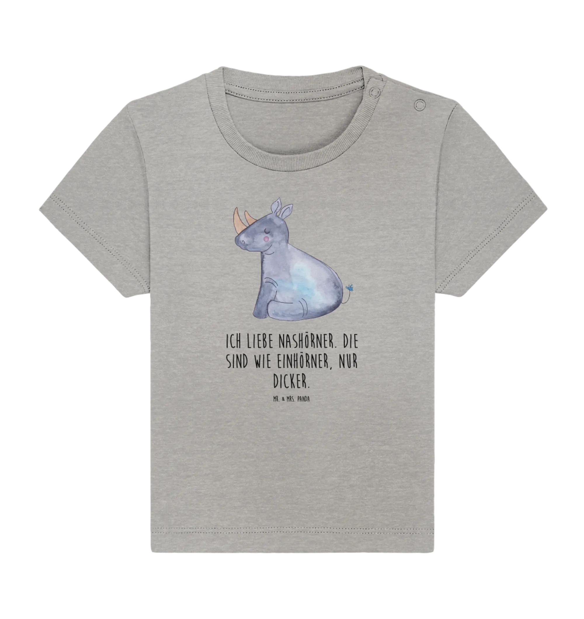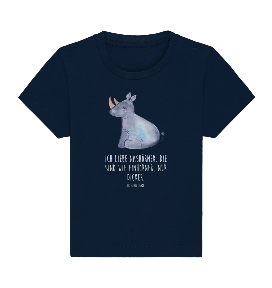 Das liebevoll handgezeichnete Design von Mrs. Panda bringt das witzige Nashorn zusammen mit dem magischen Einhorn in einem harmonischen Motiv zur Geltung. Mit dem Slogan "Ich liebe Nashörner. Die sind wie Einhörner, nur dicker." ist dieses Shirt ein richtiger Hingucker und bringt sicher viele liebevolle Komplimente. Es eignet sich hervorragend als Geschenk zur Geburt, für das erste Babyfest oder einfach als Überraschung für den eigenen kleinen Liebling.