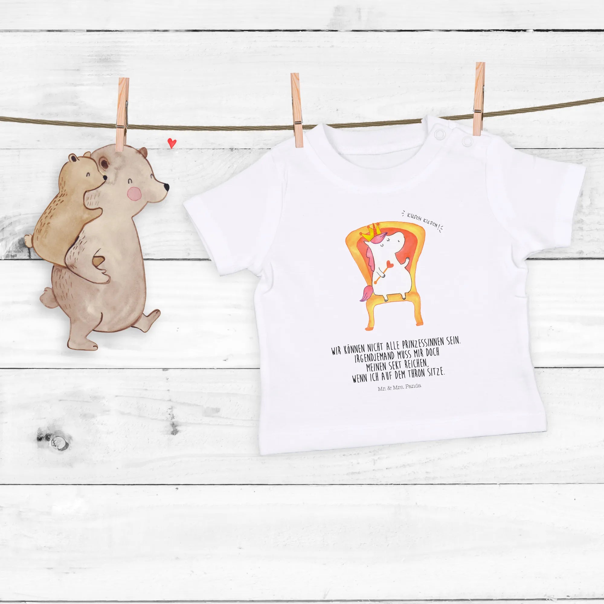 Geboren aus der kreativen Feder von Mrs. Panda, besticht das Design mit einem niedlichen Einhorn, das voller Anmut auf einem Thron sitzt und seine glitzernde Krone stolz trägt. Die Kombination aus unendlicher Fantasie und einem Hauch von Prinzessinnen-Zauber macht dieses Shirt zu einem besonderen Kleidungsstück, das jedes Baby strahlen lässt.
