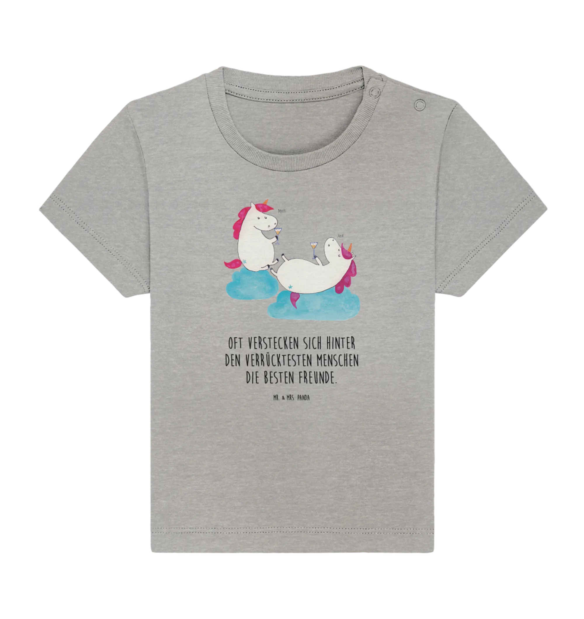 Mit einem Baby-Shirt, auf dem zwei fröhliche Einhörner mit einem Glas Sekt zu sehen sind, machst Du jede Feier zu einem besonderen Anlass. Überrasche die frischgebackene Mama und ihre Freunde mit diesem originellen Geschenk – es bringt garantiert ein Lächeln in jedes Gesicht und sorgt für Gespräche voller Spaß und Freude. Die Einhorn-Motive sind in einer zarten Heather Grey Farbe gehalten, die sowohl für Jungen als auch für Mädchen geeignet ist. Hol Dir etwas Einhorn-Magie in den Alltag!
