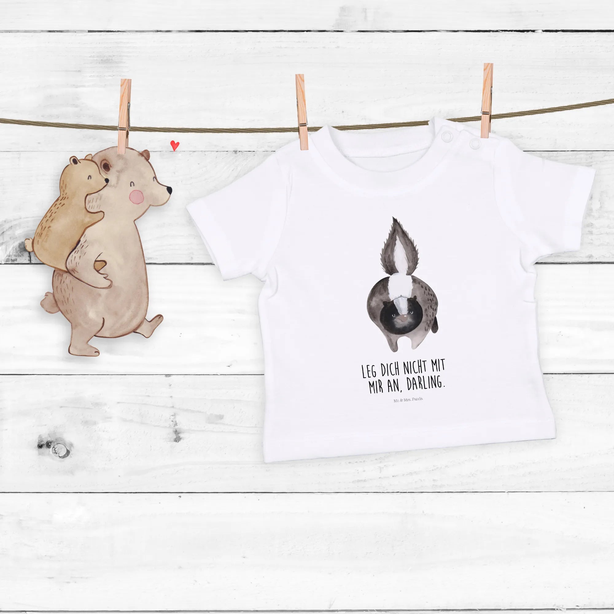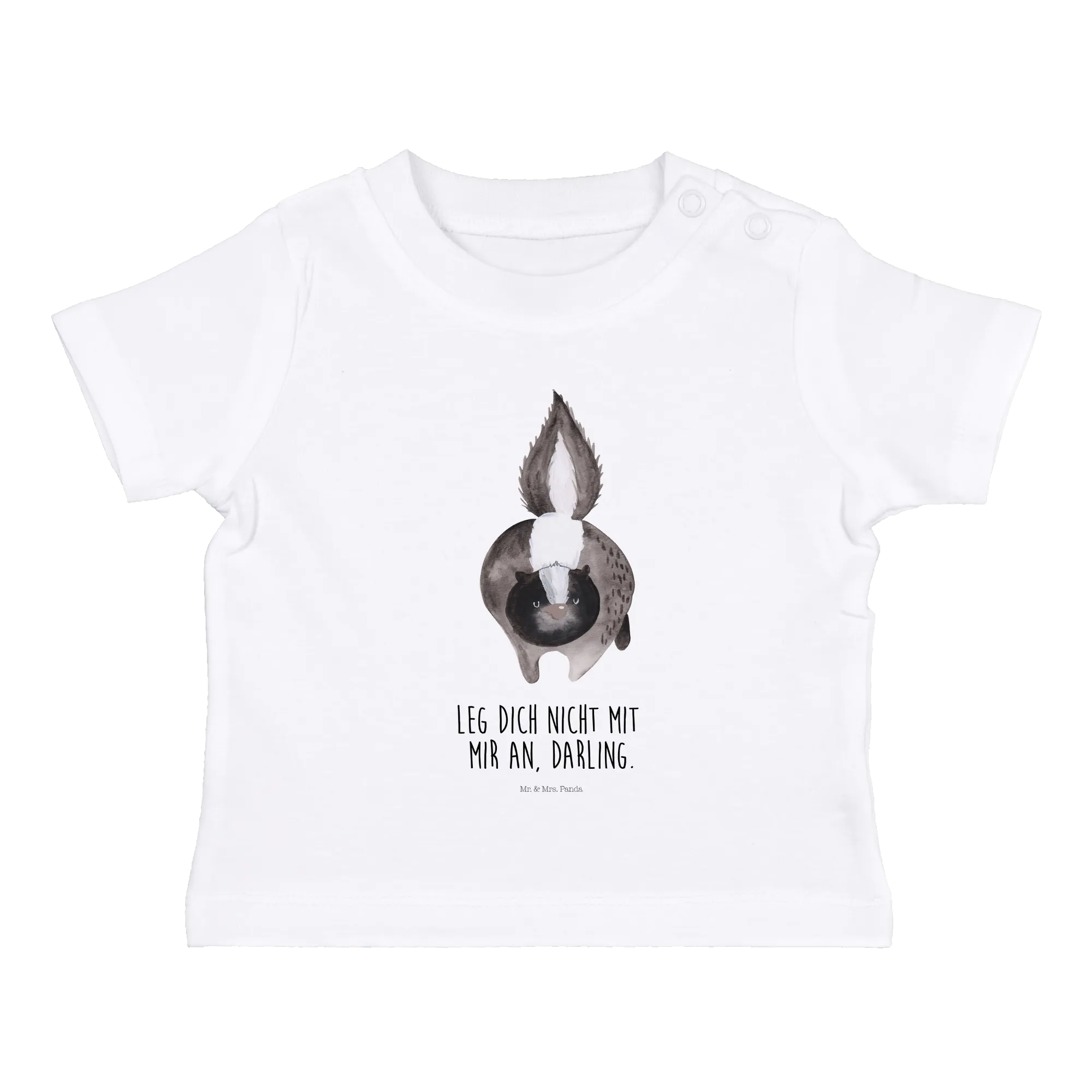 Das liebevoll gestaltete Motiv zeigt ein Stinktier, das sich mutig aufbaut und seinen buschigen Schwanz hochhält. Der dazugehörige Spruch 'Leg dich nicht mit mir an, Darling.' bringt garantiert jedes Lächeln hervor. Hergestellt aus hochwertiger, nachhaltiger Baumwolle, ist es sanft zur Babyhaut und bietet höchsten Tragekomfort.