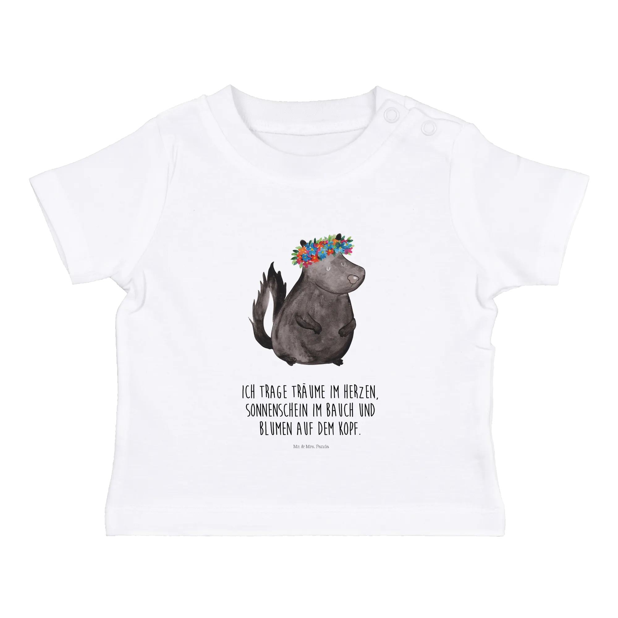 Das liebevoll gestaltete Motiv zeigt ein niedliches Stinktier, das mit einem bunten Blumenkranz geschmückt ist. Es ist nicht nur eine Freude für die Augen, sondern vermittelt auch ein positives Lebensgefühl: 'Ich trage Träume im Herzen, Sonnenschein im Bauch und Blumen auf dem Kopf.' Mit diesem Shirt zieht dein Baby alle Blicke auf sich!