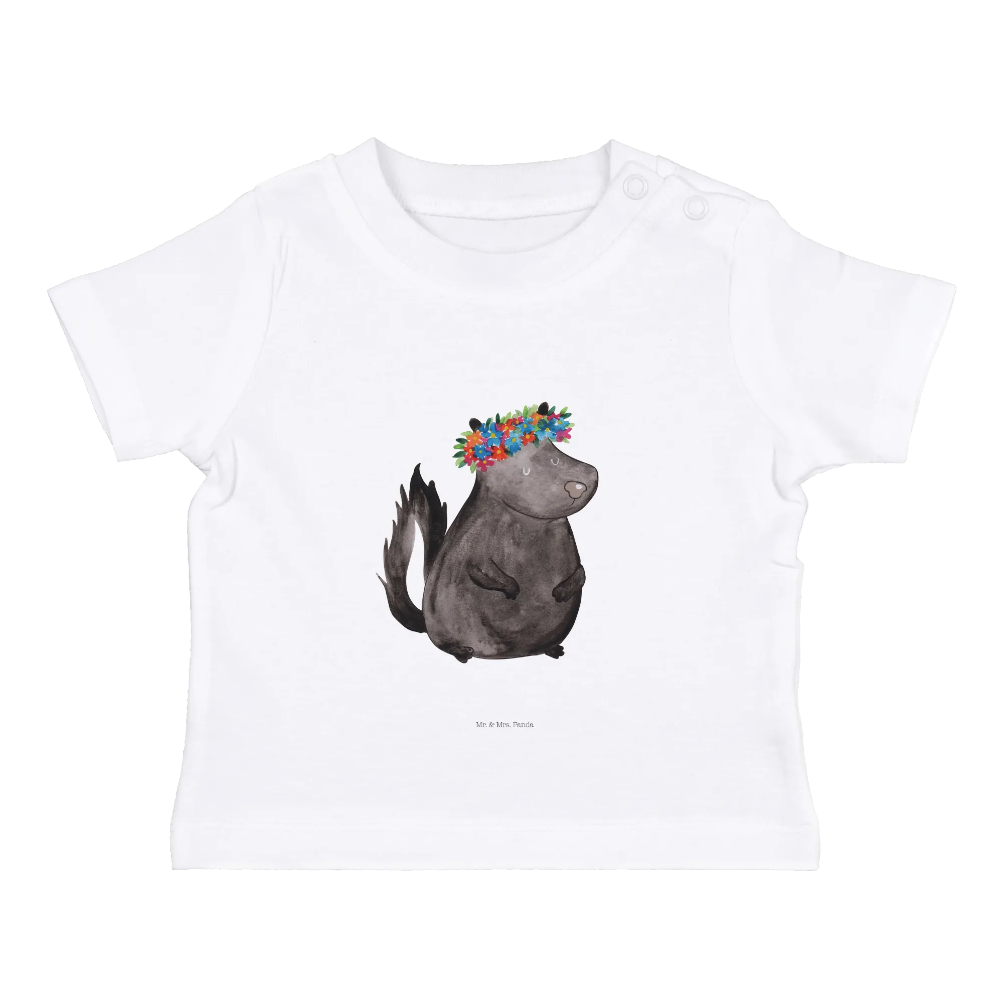 Das Organic Baby Shirt Stinktier Blumenmädchen aus der Stinktier-Kollektion von Mr. & Mrs. Panda ist das perfekte Geschenk für kleine Abenteurer und ihre Eltern. Mit einem süßen, handgezeichneten Aquarellmotiv eines Stinktieres, das einen bunten Blumenkranz trägt, bringt dieses Shirt Freude und Farbe in den Alltag.