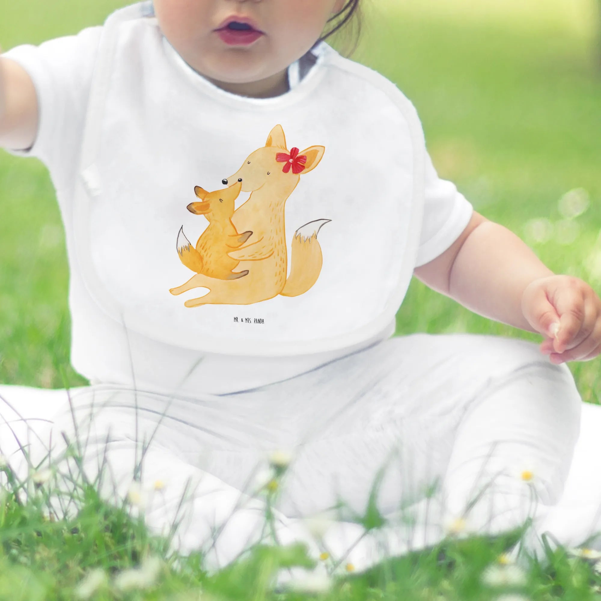 Die bezaubernde Zeichnung von Mama-Fuchs und ihrem kleinen Fuchs, die sich liebevoll umarmen, strahlt Geborgenheit und Fürsorge aus. Das warme, gelb-orange Farbschema mit der roten Blume hinter dem Ohr der Füchsin verleiht dem Lätzchen eine freundliche Note und macht es zu einem wahren Hingucker.