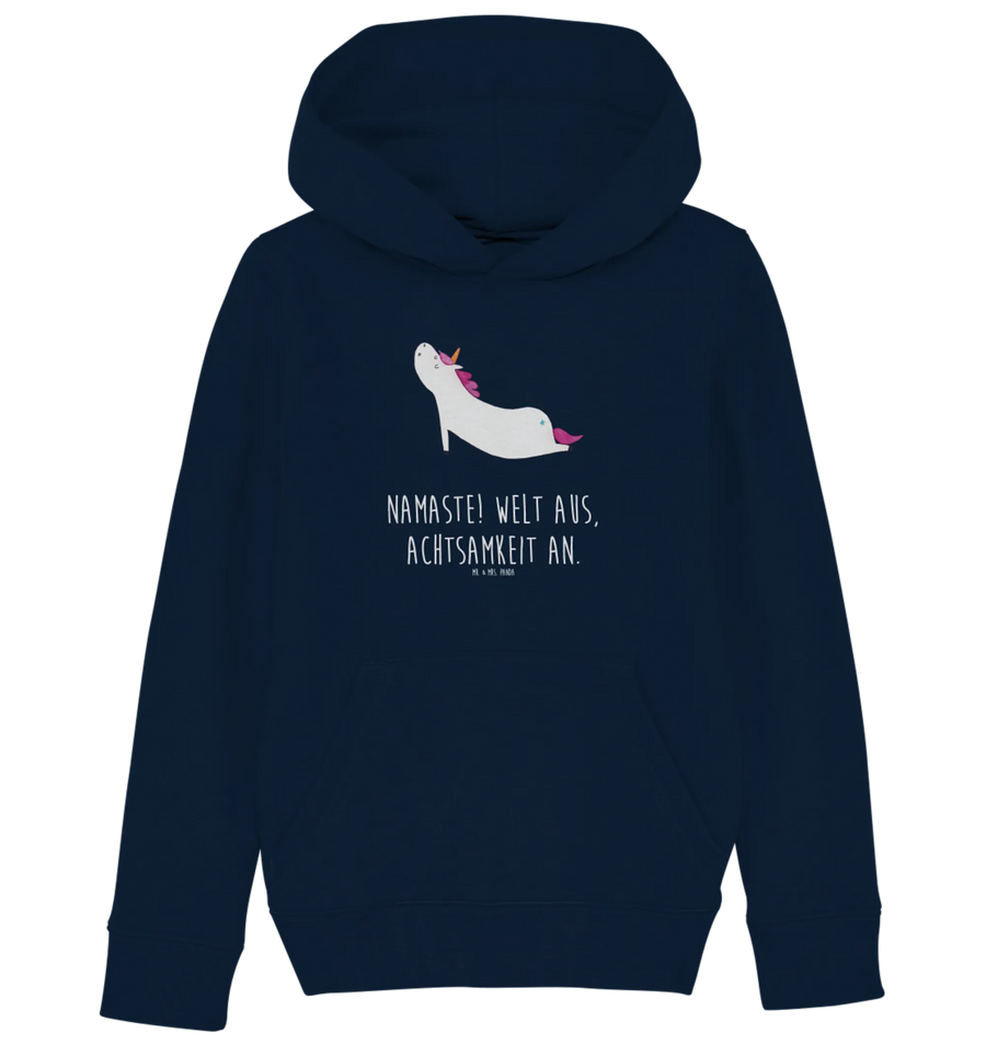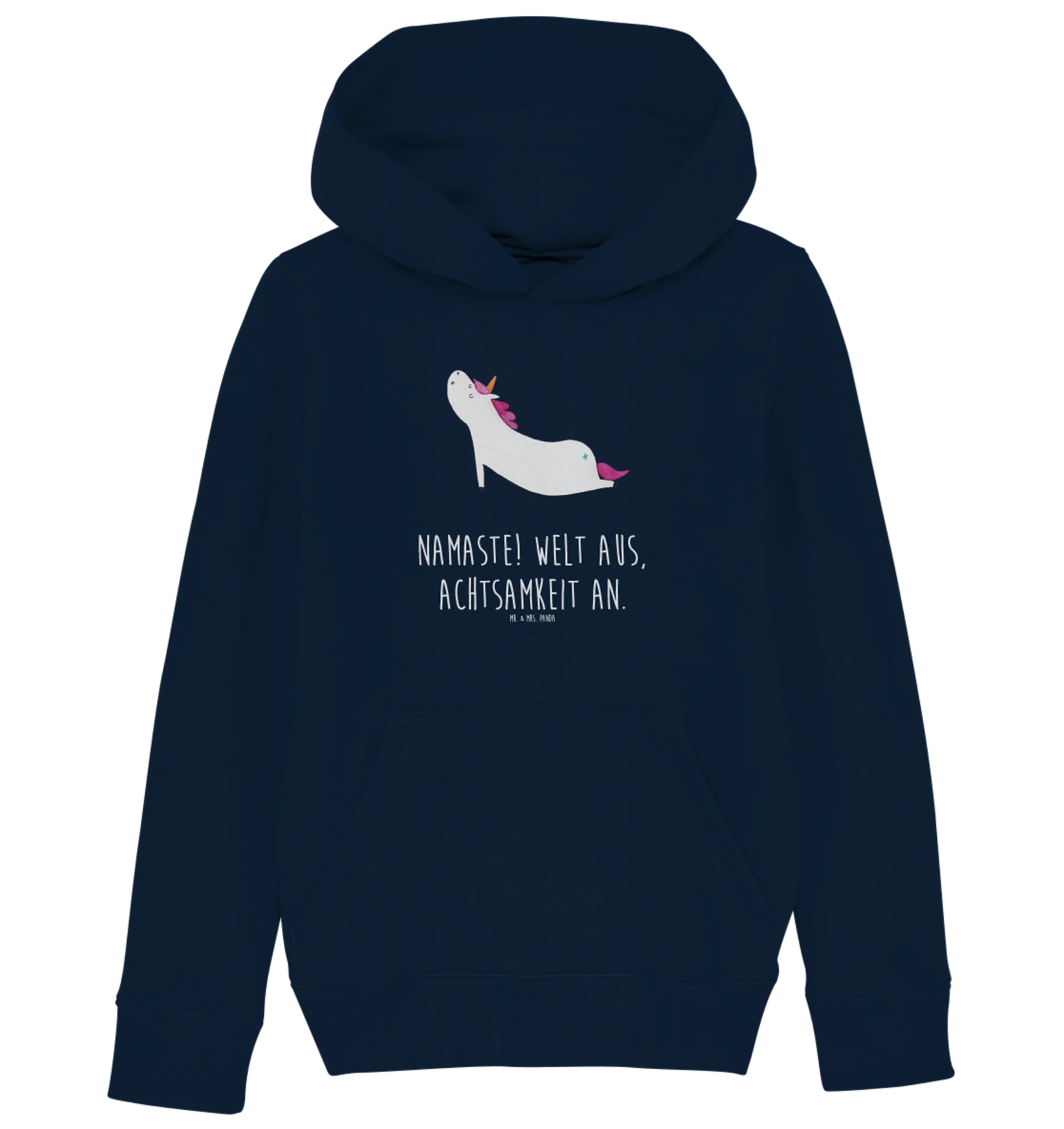 Das Motiv zeigt ein freundliches Einhorn in verschiedenen Yoga-Posen und bringt damit nicht nur Freude, sondern auch das Bewusstsein für Achtsamkeit in den Alltag. Mit Sprüchen wie "Namaste! Welt aus, Achtsamkeit an." wird dieser Hoodie zum perfekten Begleiter für Kinder, die gerne ihre innere Ruhe finden und dabei auch noch stylisch aussehen möchten.