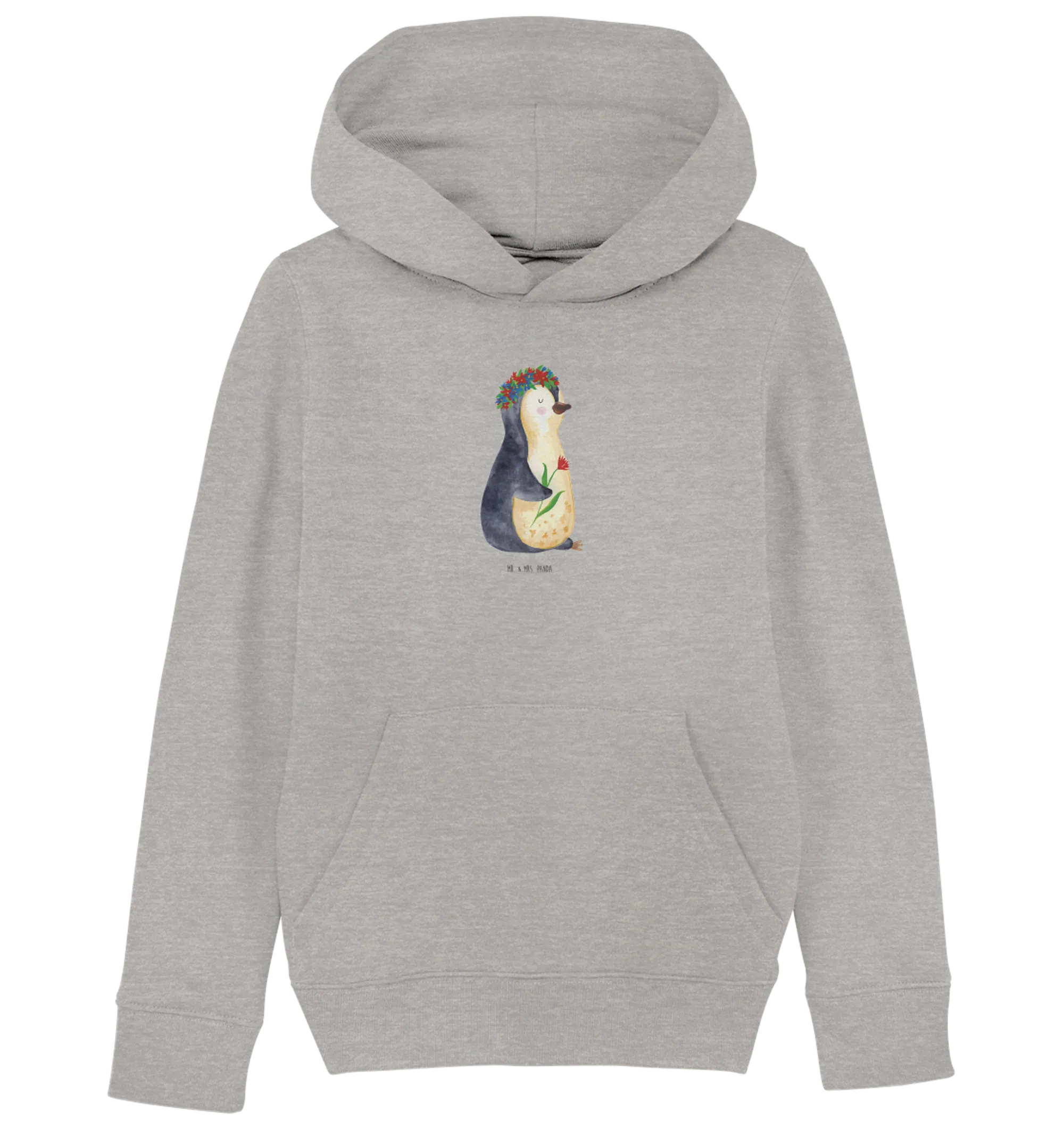Der Hoodie in einem zeitlosen Heather Grey bietet optimalen Tragekomfort, egal ob beim Spielen im Freien oder beim entspannten Kuscheln auf der Couch. Ein liebevoll handgezeichneter Pinguin mit einem wunderschönen Blumenkranz auf dem Kopf sorgt für einen fröhlichen Look, der sofort gute Laune verbreitet.
