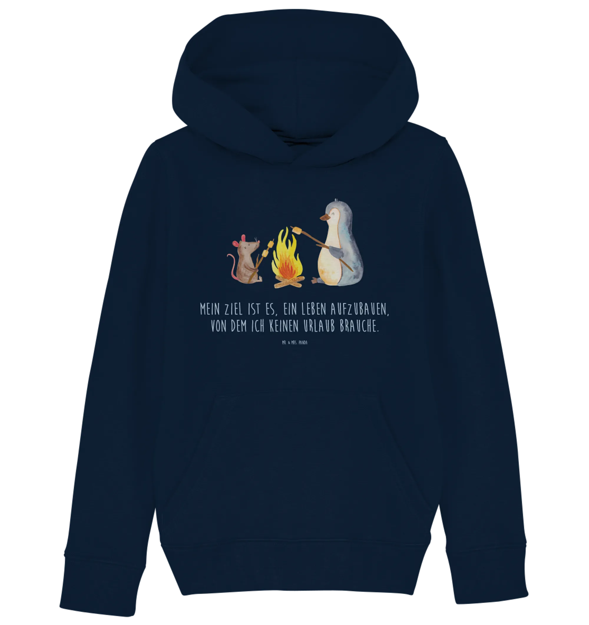 Mit einem süßen Pinguin und einer fröhlichen Maus, die gemeinsam am Lagerfeuer Marshmallows rösten, strahlt das Design eine liebevolle Gemütlichkeit aus. Kinder können die Magie der Natur spüren und sich in die kleinen Details verlieben. Der Hoodie eignet sich hervorragend für die kälteren Monate oder entspannte Ausflüge in die Natur.