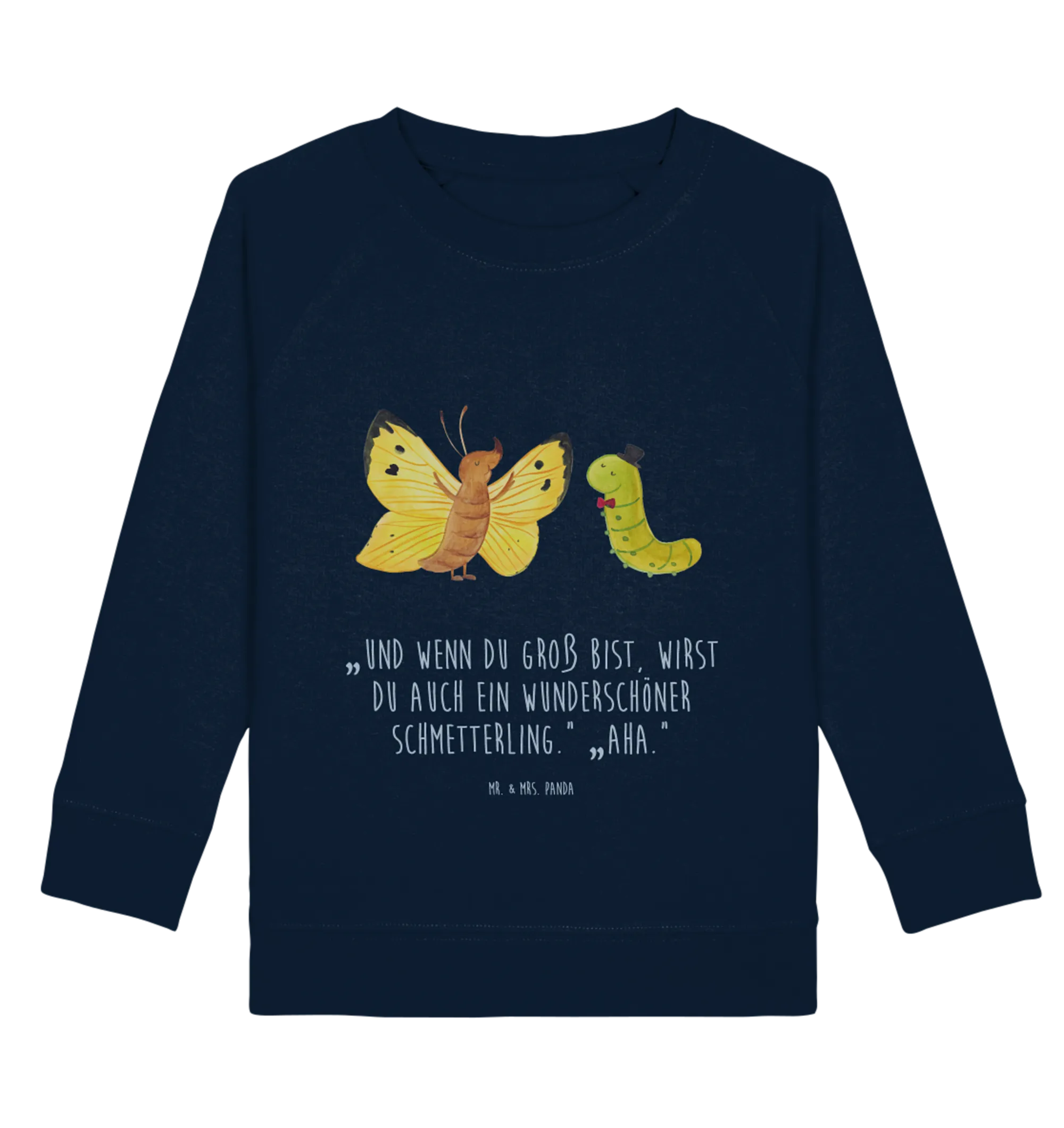 Entdecke den zauberhaften Organic Kinder Pullover mit dem liebevollen Motiv von der Raupe & dem Schmetterling aus der wundervollen Small World Kollektion von Mr. & Mrs. Panda!
