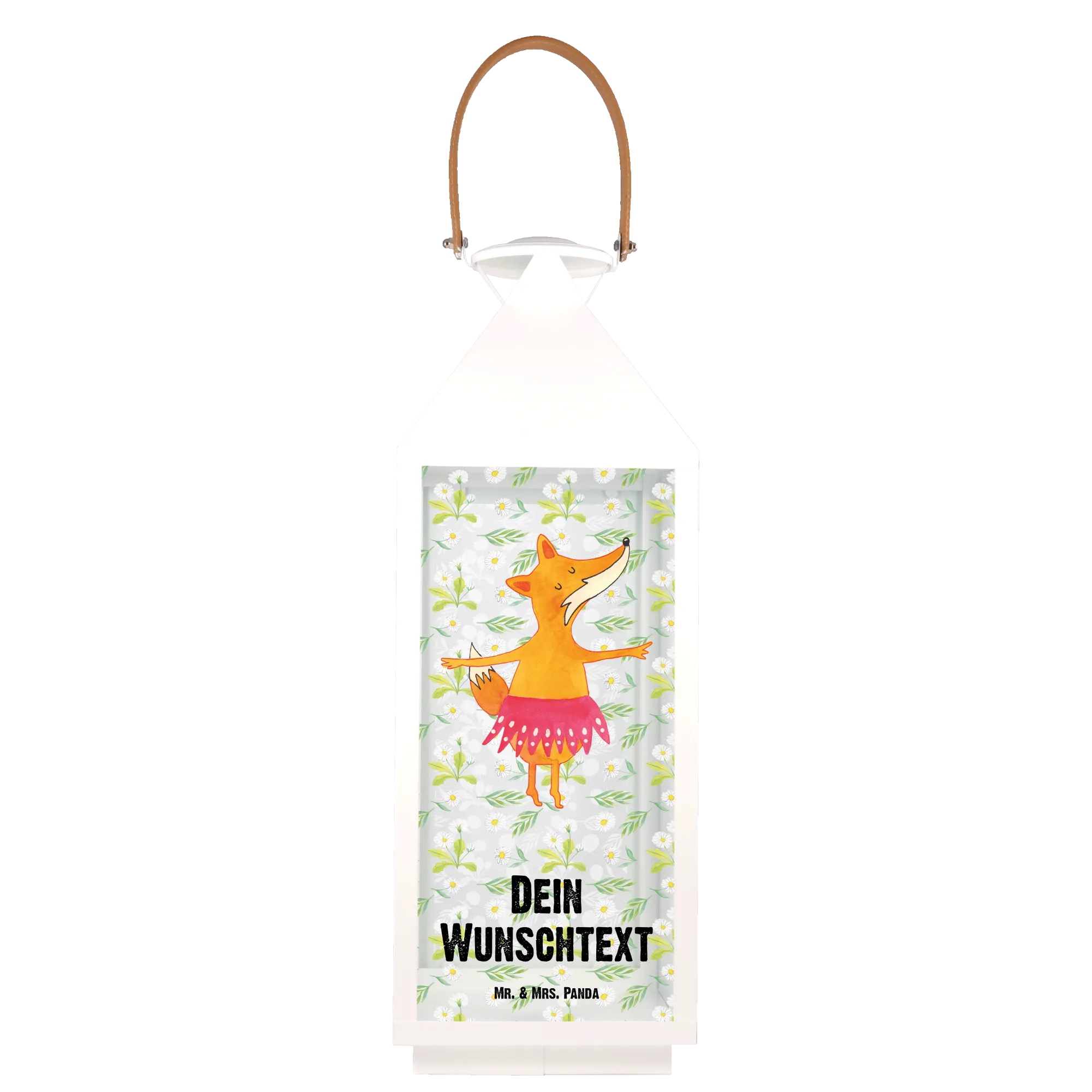 Die Laterne ist aus hochwertigem, weiß lackiertem Metall gefertigt und bietet Platz für Kerzen oder Lichterketten, wodurch sie sowohl drinnen als auch draußen eine gemütliche Atmosphäre schafft. Das süße Fuchs Ballerina-Motiv, das von der talentierten Mrs. Panda handgezeichnet wurde, vermittelt Freude und einen Sinn für Freiheit.