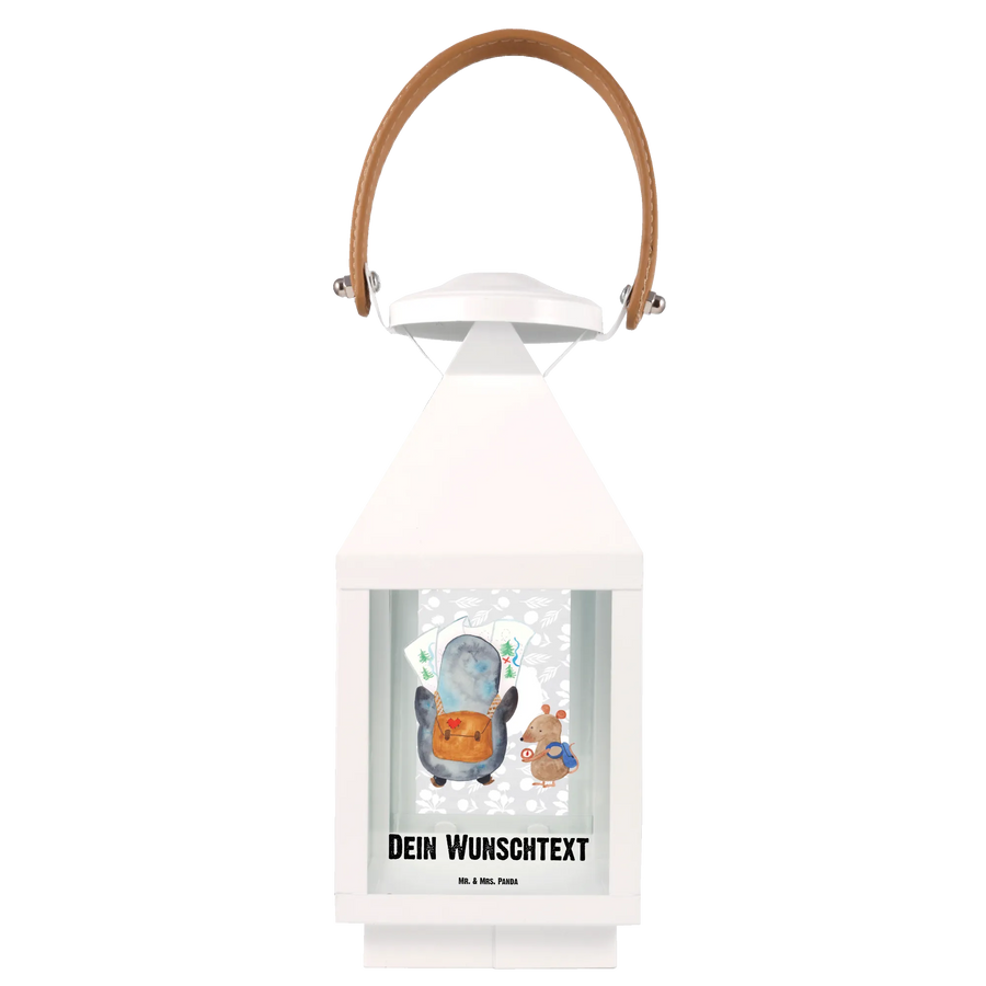 Die personalisierte Deko Laterne "Pinguin & Maus Wanderer" aus der Pinguin-Kollektion von Mr. & Mrs. Panda ist das perfekte Geschenk für alle Abenteuerliebhaber und Gartenenthusiasten.
