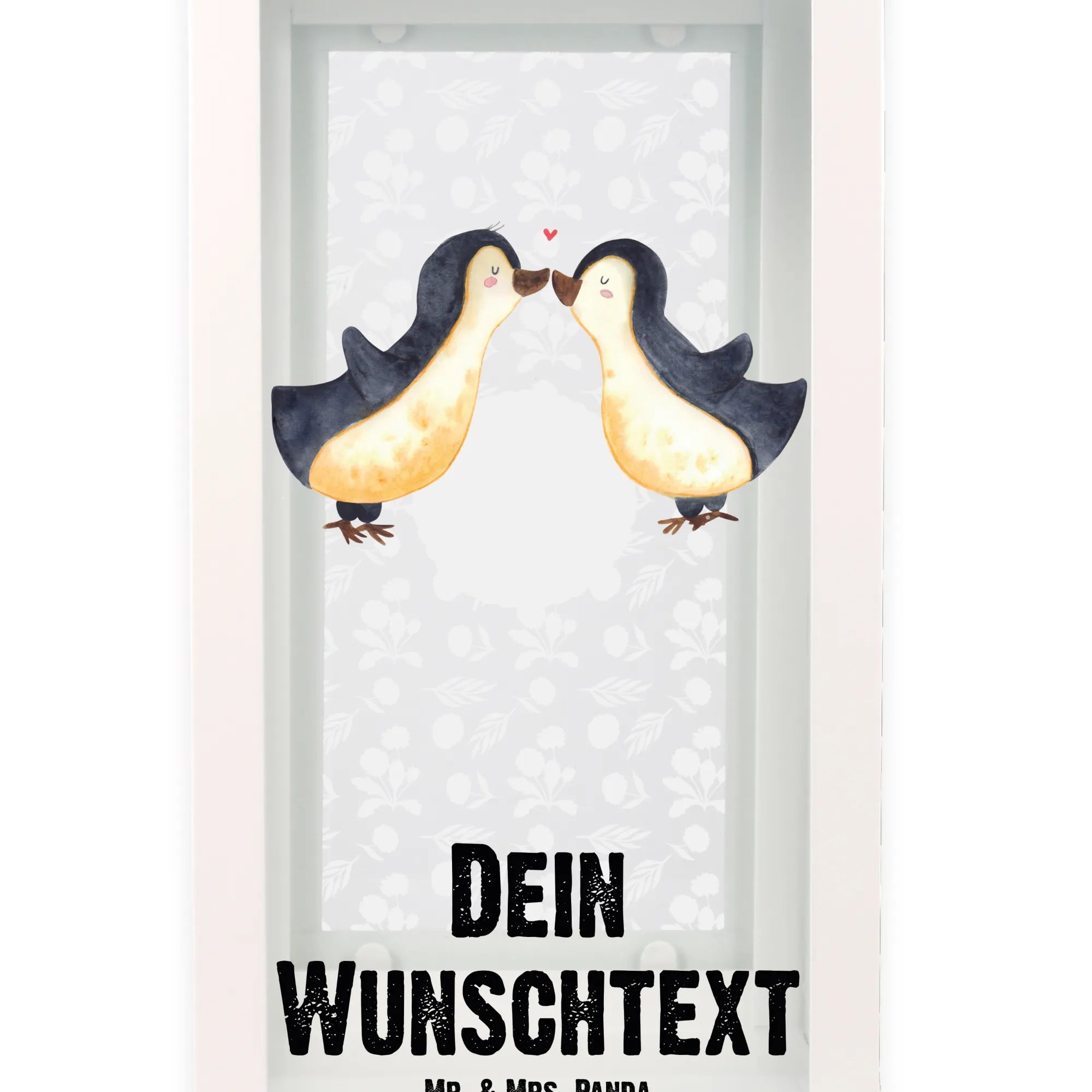 Auf den ersten Blick verzaubert das charmante Design: Zwei Pinguine, die sich zärtlich küssen, umgeben von einem kleinen Herz, strahlen pure Zuneigung aus. Diese Laterne ist nicht nur eine Augenweide, sondern auch ein Wahrzeichen deiner Liebe. Du kannst sie individuell mit deinem Wunschnamen oder Wunschtext personalisieren. Das macht das Geschenk besonders und einzigartig.