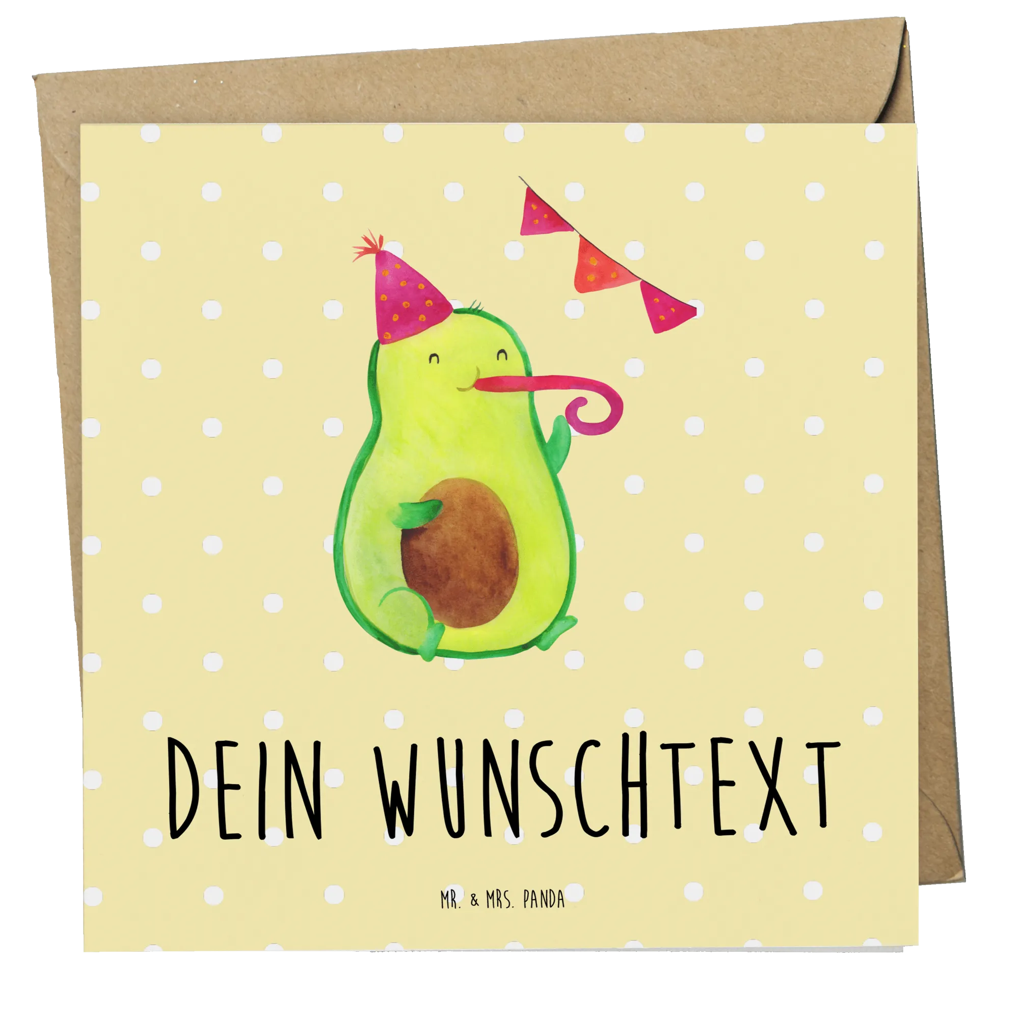 Entdecke die perfekte personalisierte Deluxe Karte aus der bezaubernden Avocado Kollektion von Mr. & Mrs. Panda! Diese süße, quadratische Karte mit dem niedlichen Motiv einer Avocado, die einen Partyhut trägt und in eine Partypfeife pustet, bringt Freude in jedes Herz. Ob für Einladungen zu feierlichen Anlässen oder als liebevolle Glückwunschkarte, sie ist die ideale Wahl!