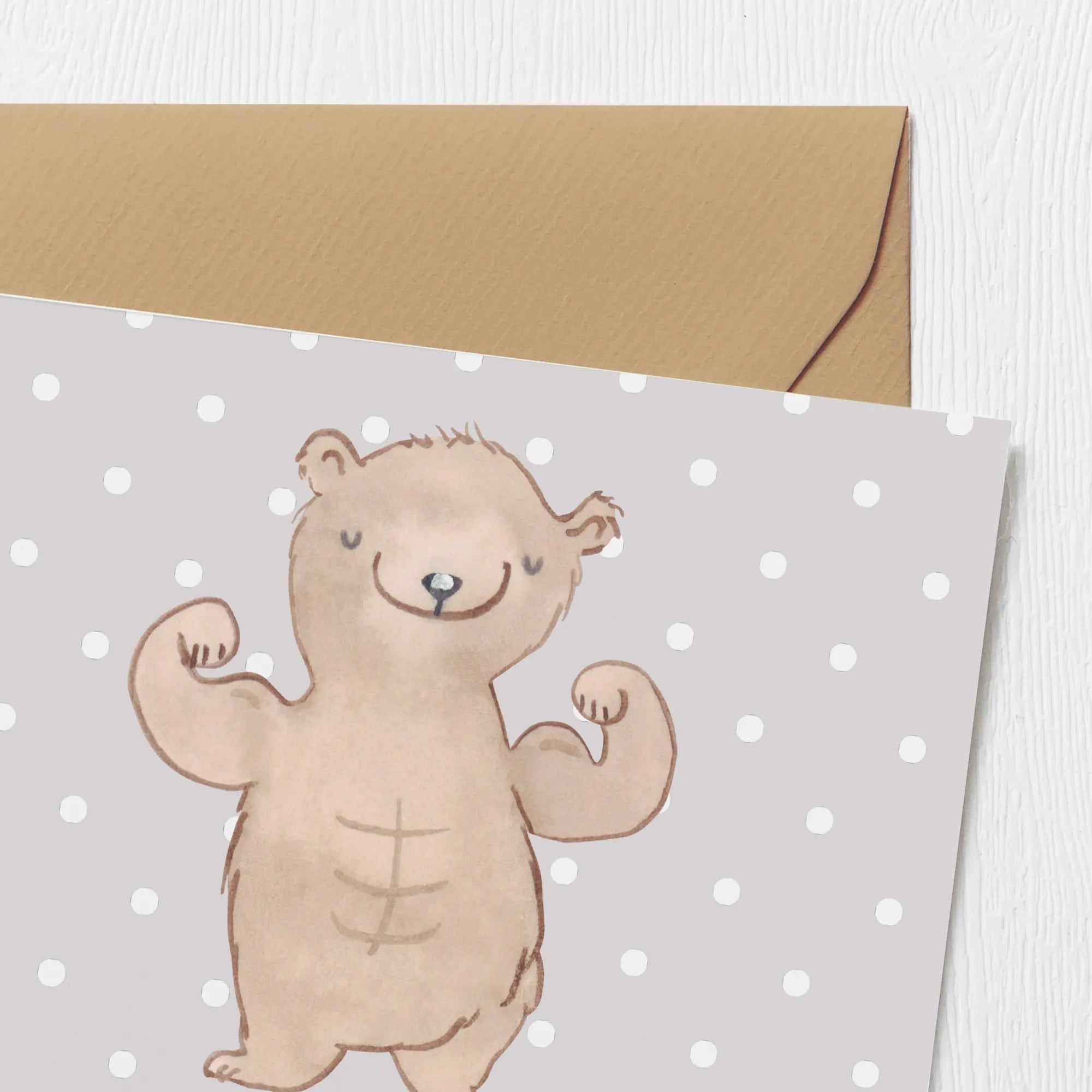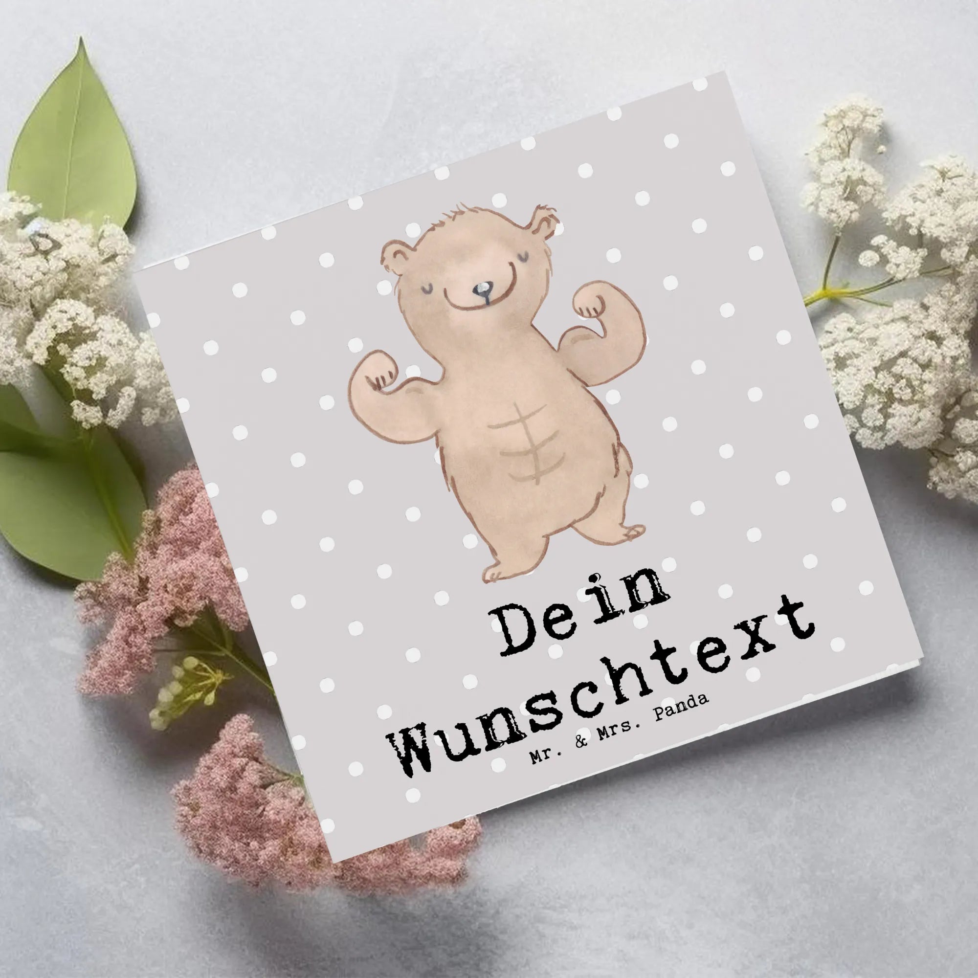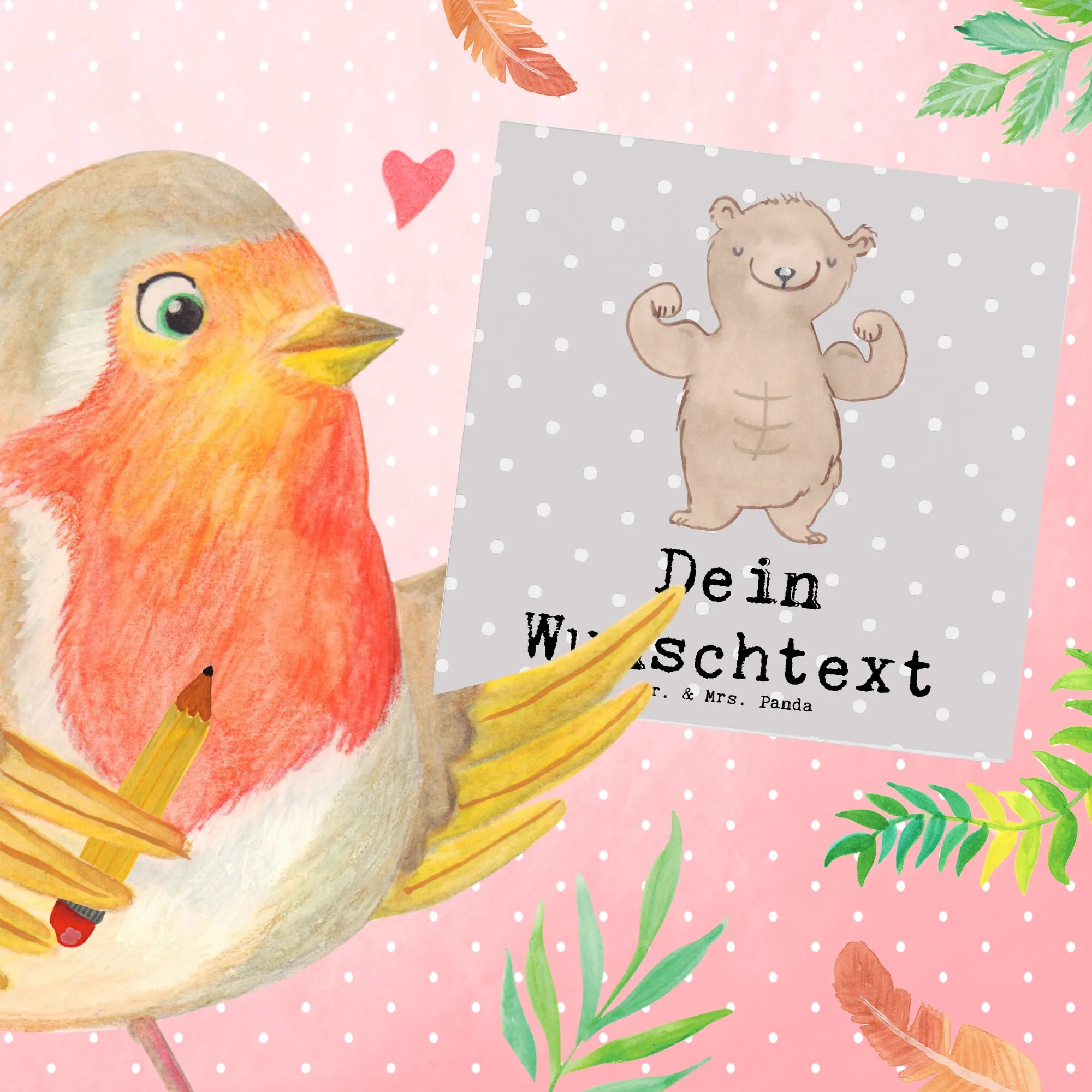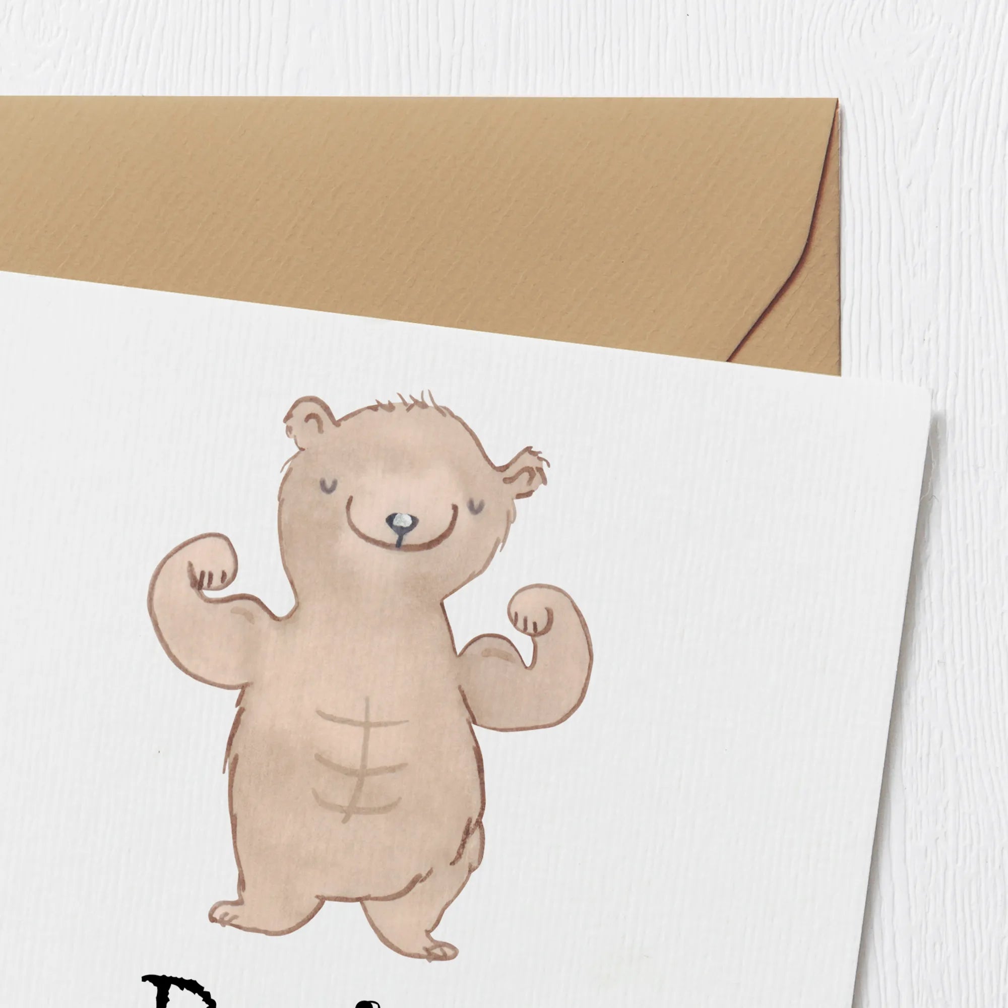 Die personalisierte Deluxe Karte Bär Bodybuilding Tage von Mr. & Mrs. Panda ist das perfekte Geschenk für Sportbegeisterte! Mit diesem charmanten Motiv eines süßen Bären, der stolz seine Muskeln zeigt, bringst du Freude in das Leben eines leidenschaftlichen Bodybuilders oder Fitnessfans.