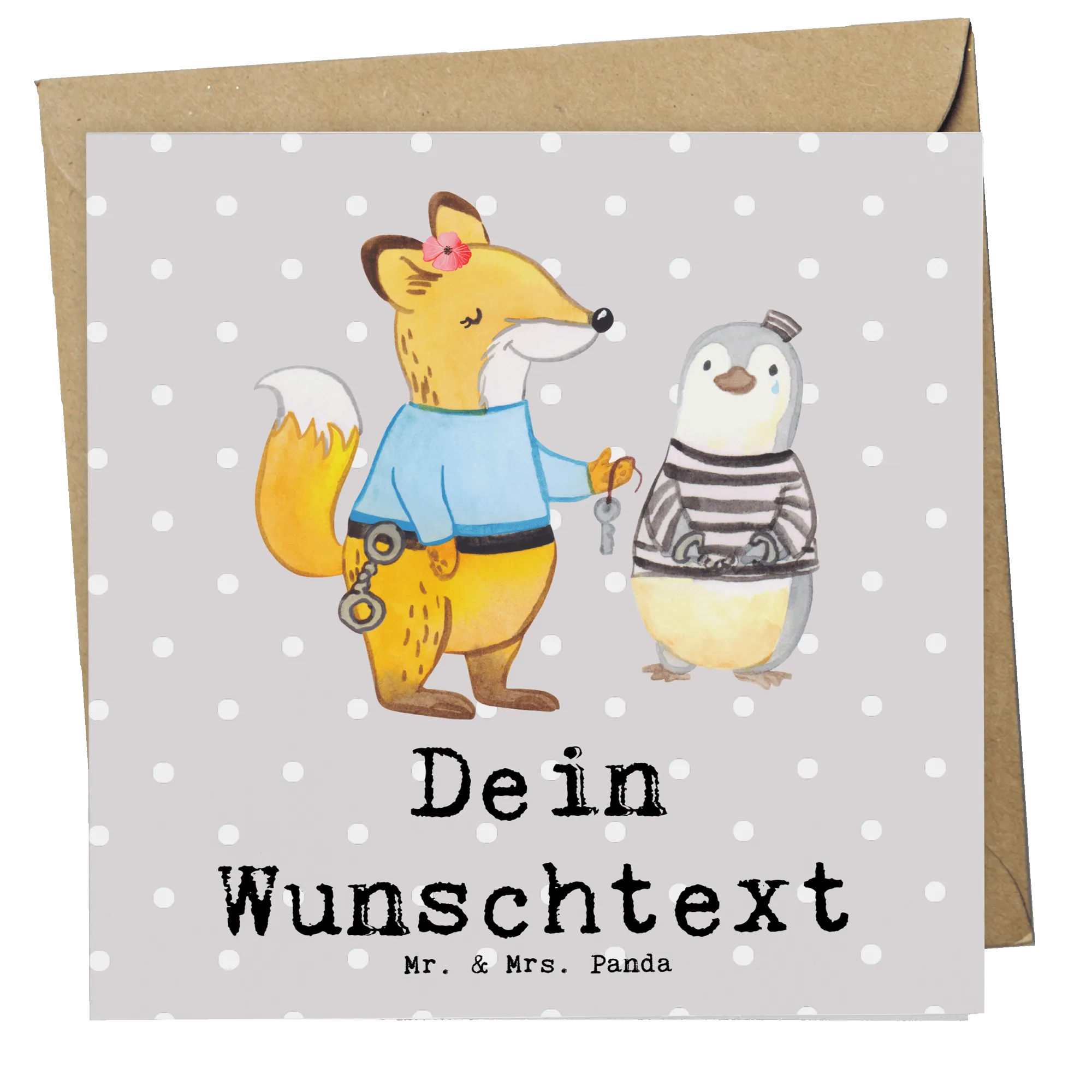 Verabschiedungen, Jubiläen oder einfach um Danke zu sagen - die Karte passt immer! Die personalisierte Karte erlaubt es dir, einen Wunschnamen oder Wunschtext hinzuzufügen, was sie zu einem ganz persönlichen Geschenk macht. Die Vorderseite ist mit einem entzückenden Design einer Justizvollzugsbeamtin verziert, die ihren Job ernst nimmt, und das siehst du mit dem süßen, weiblichen Fuchs, der einen Pinguin in Handschellen legt. Dieser liebevolle Touch wird sicherlich ein Lächeln auf jedes Gesicht zaubern!
