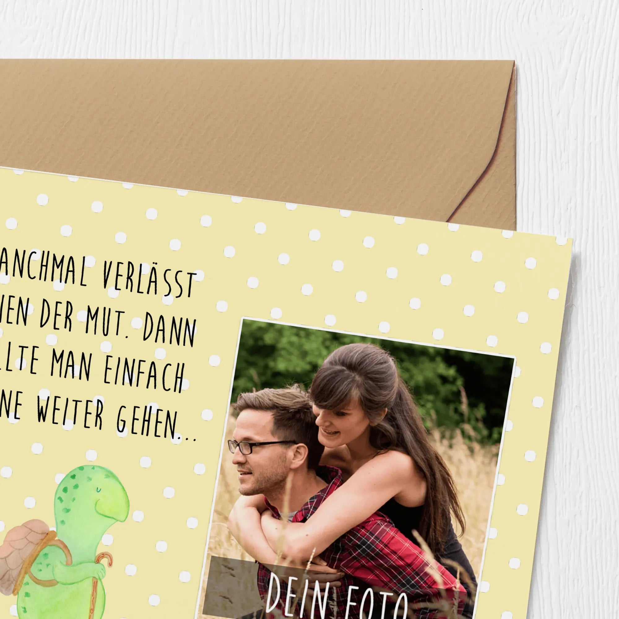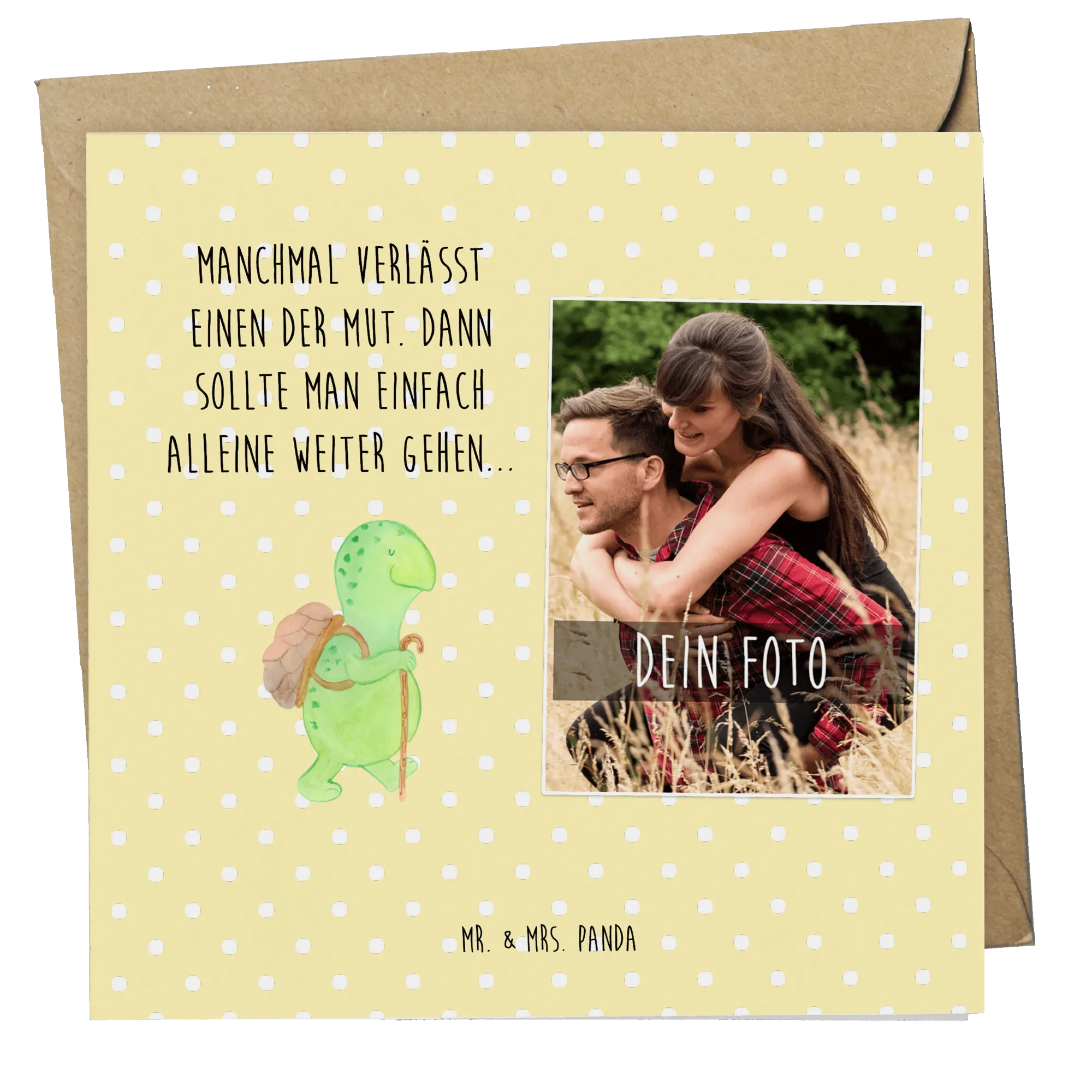 Die personalisierte Foto Deluxe Karte mit dem bezaubernden Motiv "Schildkröte Wanderer" von Mr. & Mrs. Panda ist das perfekte Geschenk für all jene, die ein wenig Motivation und Inspiration in ihrem Leben benötigen. Diese zauberhafte Karte bietet nicht nur Platz für dein persönliches Foto, sondern ist auch mit einem herzerwärmenden Spruch ausgestattet: "Manchmal verlässt einen der Mut. Dann sollte man einfach alleine weiter gehen..."