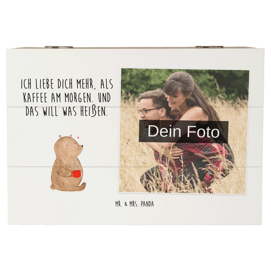 Entdecke die perfekte Geschenkidee mit der personalisierten Foto Holzkiste von Mr. & Mrs. Panda! Diese wunderschöne Kiste ist ideal, um besondere Erinnerungen, Fotos oder andere Schätze sicher aufzubewahren. Mit dem zauberhaften Motiv des Bären mit Morgenkaffee und dem liebevollen Slogan 'Ich liebe dich mehr, als Kaffee am Morgen. Und das will was heißen.' wird sie nicht nur zum praktischen Aufbewahrungsort, sondern auch zum emotionalen Liebesbeweis.