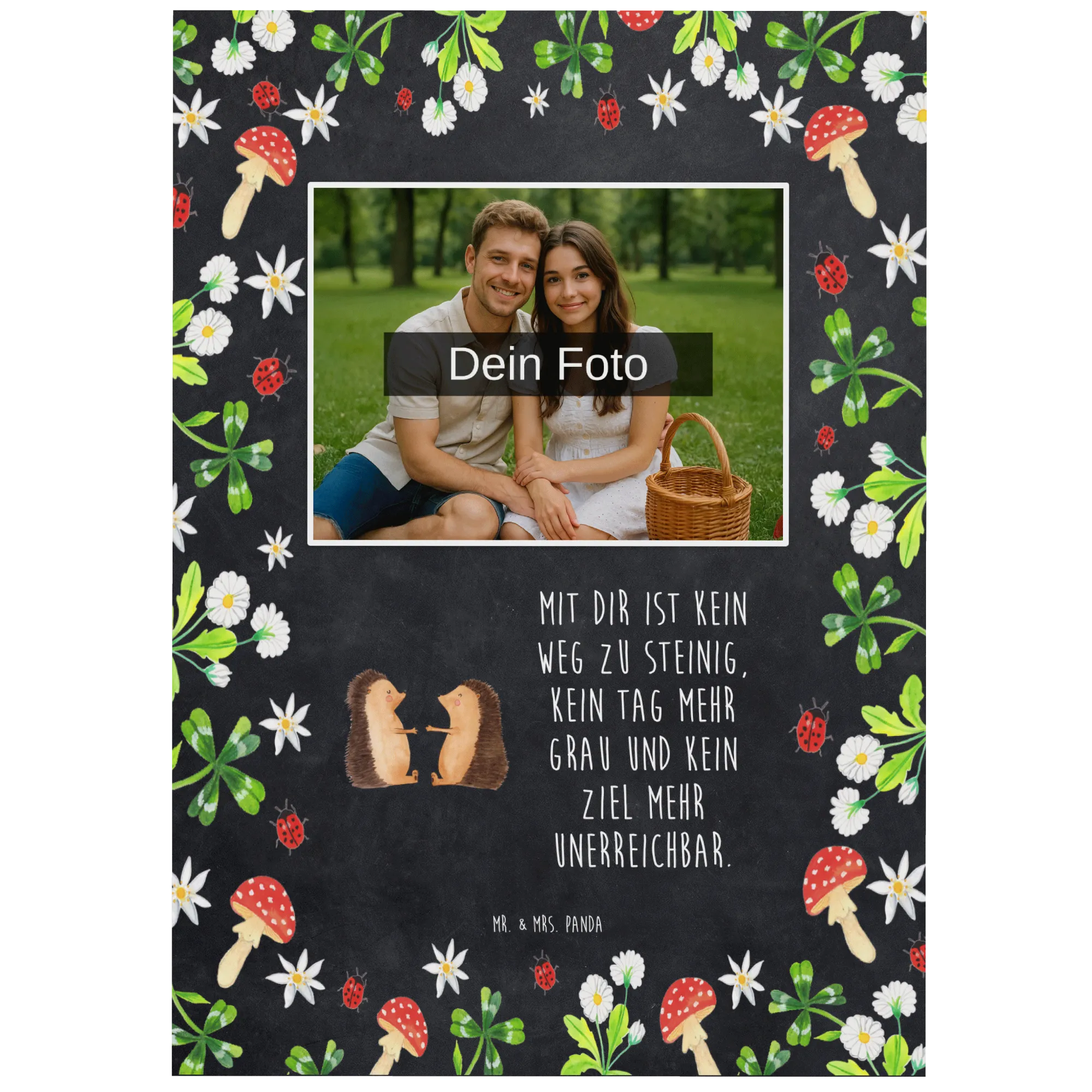 Die personalisierte Foto Postkarte "Igel Liebe" von Mr. & Mrs. Panda ist das perfekte Geschenk für Verliebte, Verlobte und frisch verheiratete Paare. Mit einem niedlichen Motif und dem liebevollen Spruch „Mit dir ist kein Weg zu steinig, kein Tag mehr grau und kein Ziel mehr unerreichbar“ weckt sie die süßesten Gefühle und zaubert jedem ein Lächeln ins Gesicht.