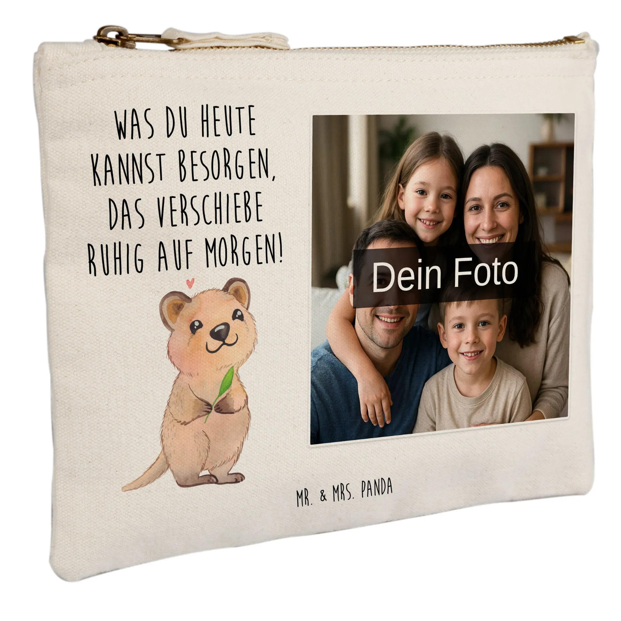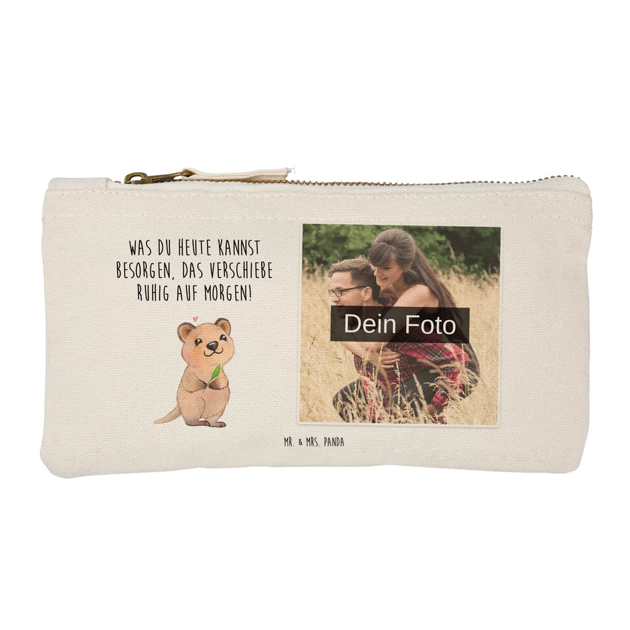 Mit der personalisierten Foto Schminktasche von Mr. & Mrs. Panda bringst du deinen persönlichen Stil perfekt zur Geltung! Diese hochwertige Tasche aus 100% weicher Baumwolle ist in den Größen 20 x 15 cm, 25 x 20 cm und 30 x 25 cm erhältlich. Sie lässt sich ganz nach deinem Geschmack mit deinem Wunschfoto bedrucken. Perfekt für die Aufbewahrung deiner Kosmetikartikel, für Stifte oder zum Sammeln von Belegen. Die tollen Designs und Sprüche schenken dir immer ein Lächeln! Dank der umsäumten Innennähte bleibt die Form auch bei intensivem Gebrauch erhalten. Pflege sie am besten mit einer lauwarmen Handwäsche und genieße lange Freude an deinem einzigartigen Accessoire!