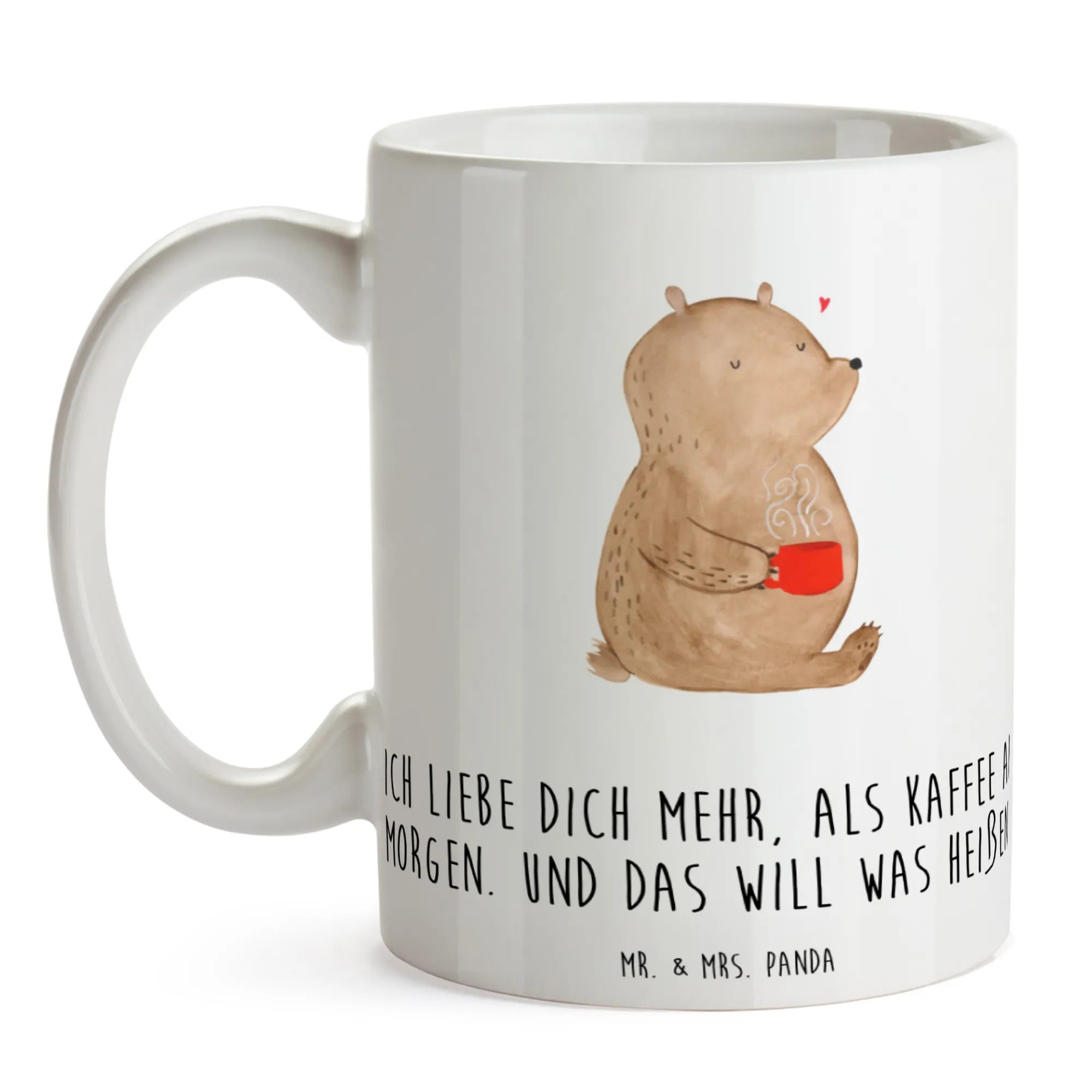 Die personalisierte Foto Tasse mit dem niedlichen Motiv 'Bär Morgenkaffee' von Mr. & Mrs. Panda ist das perfekte Geschenk für alle, die ihrer Liebe einen ganz besonderen Ausdruck verleihen möchten. Egal, ob zum Valentinstag, Jahrestag, Hochzeitstag oder als liebevolles Mitbringsel für die Freundin oder den Partner – diese Keramiktasse bringt Freude und Herzenswärme in den Alltag. Der liebevoll gestaltete Bär genießt seinen Kaffee mit einem roten Becher, während ihm ein kleines Herz über den Kopf schwebt. Der Spruch 'Ich liebe dich mehr, als Kaffee am Morgen. Und das will was heißen.' passt perfekt für all jene, die die Zweisamkeit bei einer Tasse Kaffee zelebrieren möchten.