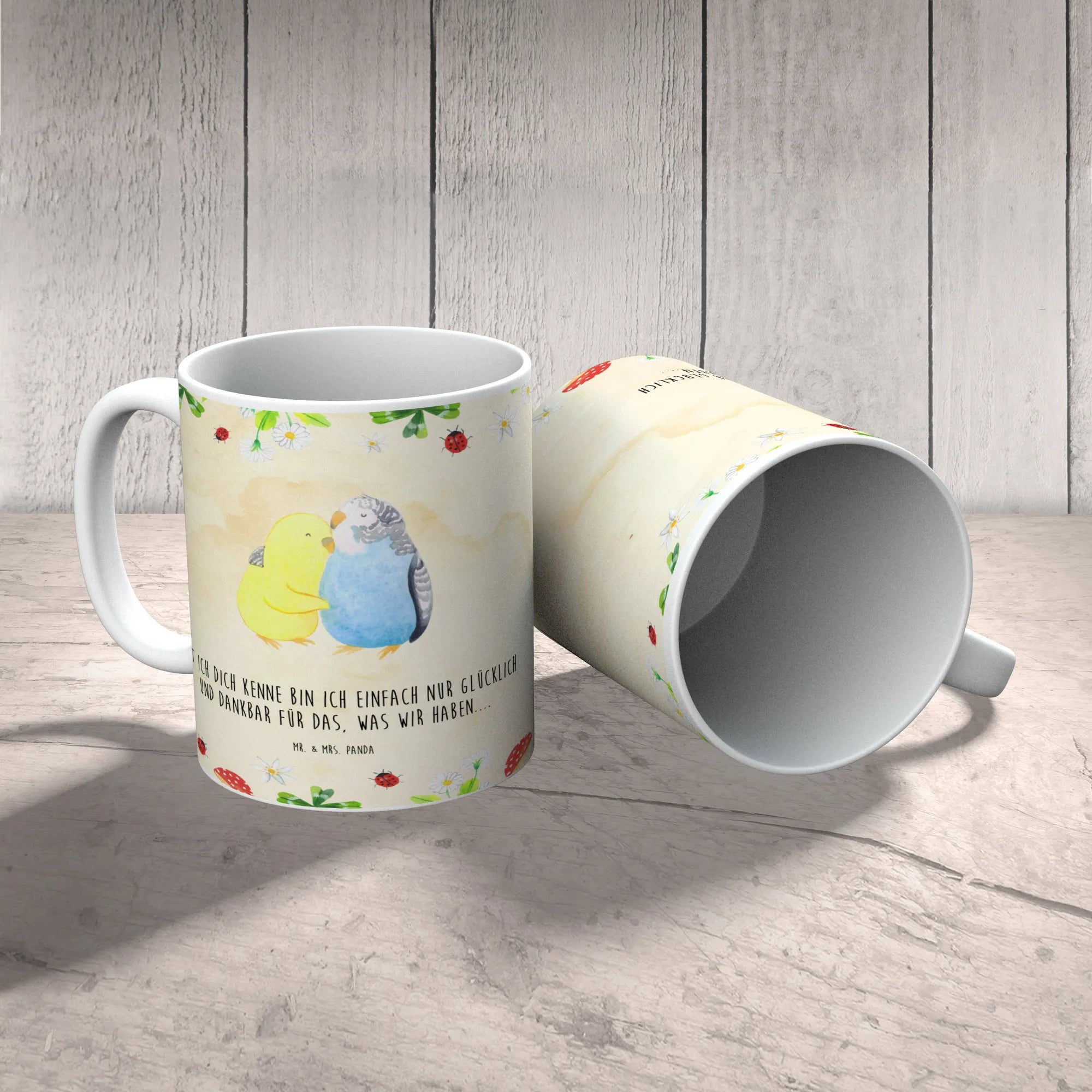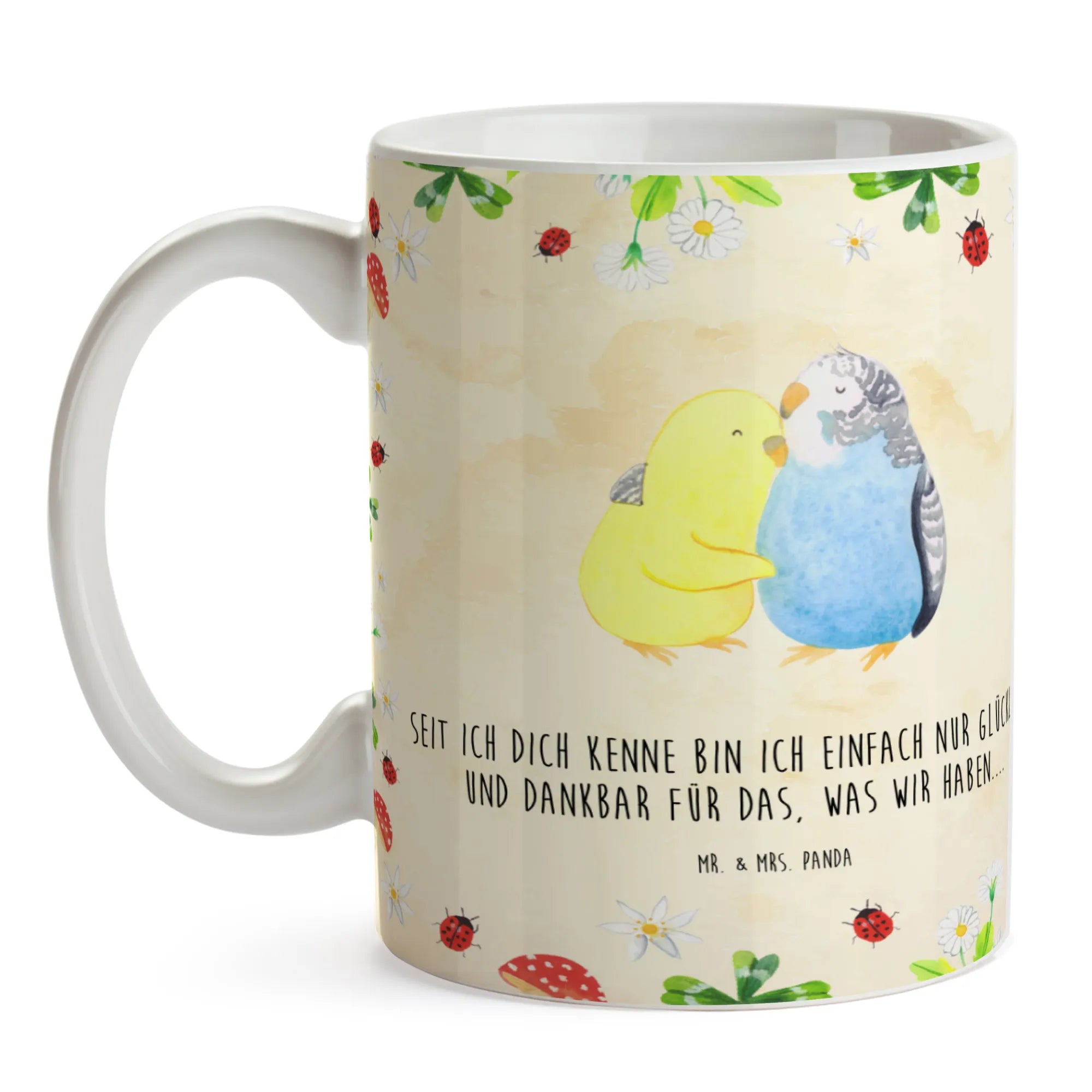 Suchst du nach einem ganz besonderen Geschenk für deinen Partner oder deine Partnerin? Dann ist die personalisierte Foto Tasse mit dem Motiv "Wellensittich Liebe" aus der Kollektion Liebe von Mr. & Mrs. Panda genau das Richtige!