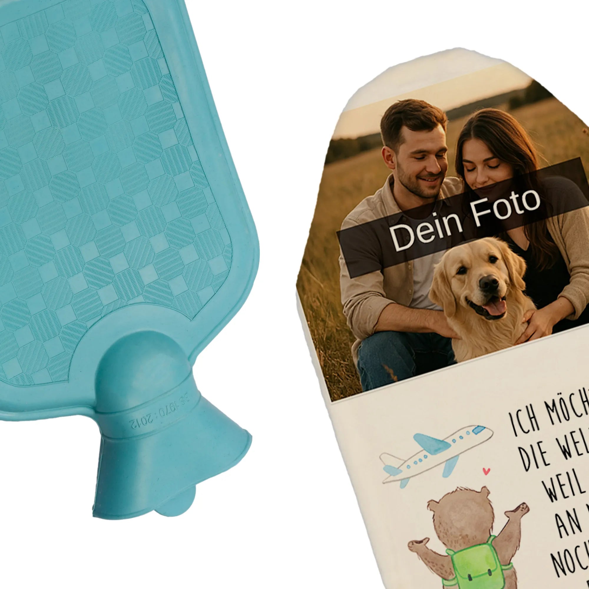 Die personalisierte Foto Wärmflasche mit dem süßen Bären im Flugzeug-Motiv ist das perfekte Geschenk für deine Liebsten. Egal ob zum Valentinstag, Jahrestag, Hochzeitstag oder einfach als liebevolles Mitbringsel – diese Wärmflasche sorgt für stundenlange mollige Wärme und viel Freude.