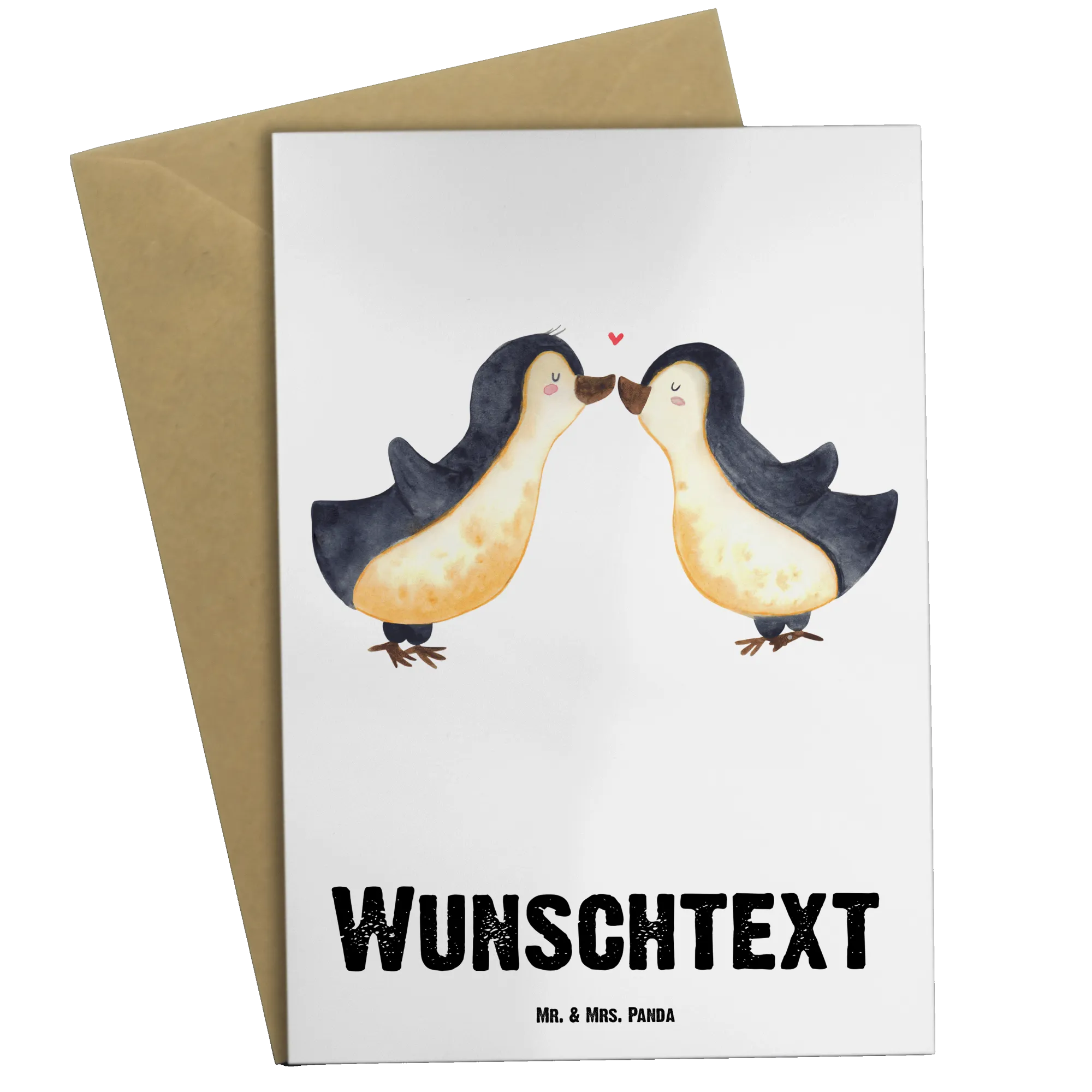 Wenn du auf der Suche nach dem perfekten Geschenk für deine/n Liebste/n bist, dann ist die personalisierte Grußkarte mit dem entzückenden Motiv 'Pinguine Kuss' aus der Liebe-Kollektion von Mr. & Mrs. Panda genau das Richtige! Diese wunderschöne und einzigartige Grußkarte ist mehr als nur ein Stück Papier – sie ist ein kleines Liebesgeständnis, das von Herzen kommt. Auf der Vorderseite begrüßen dich zwei niedliche Pinguine, die sich innig küssen und damit ein Gefühl von Zärtlichkeit und Verbundenheit vermitteln. Die sanften Farben und die liebevoll handgezeichneten Details machen diese Karte zu einem echten Schatz.