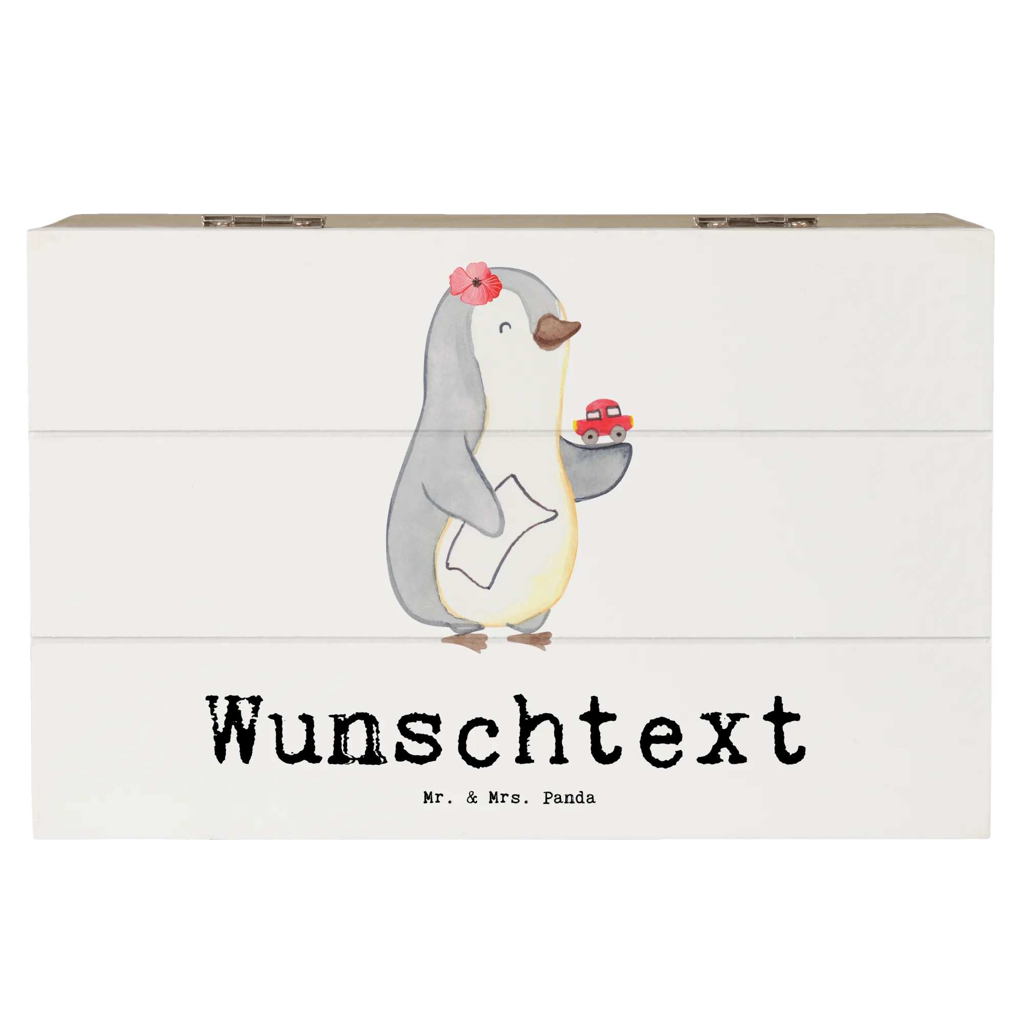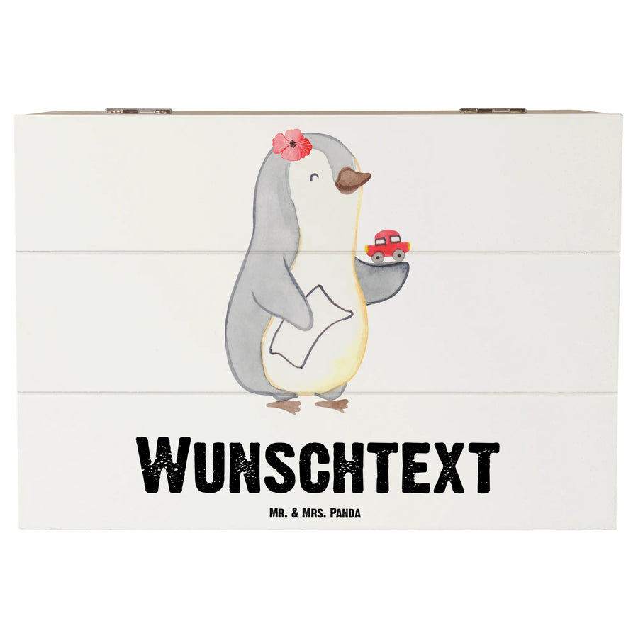 Der süße Pinguin auf dem Deckel, der mit einem kleinen Spielzeugauto und Unterlagen in der Hand abgebildet ist, bringt nicht nur ein Lächeln ins Gesicht, sondern macht die Kiste auch einzigartig und persönlich.