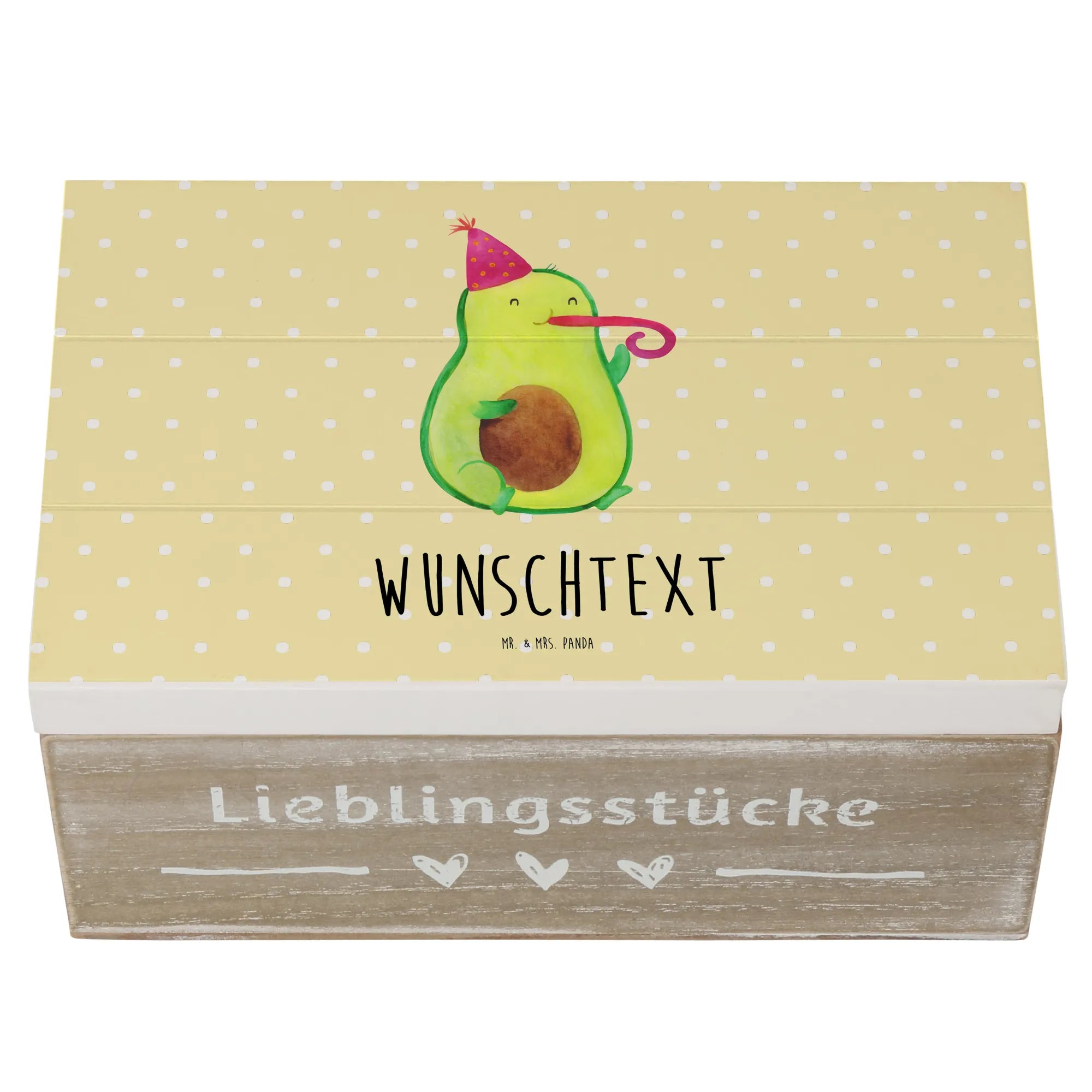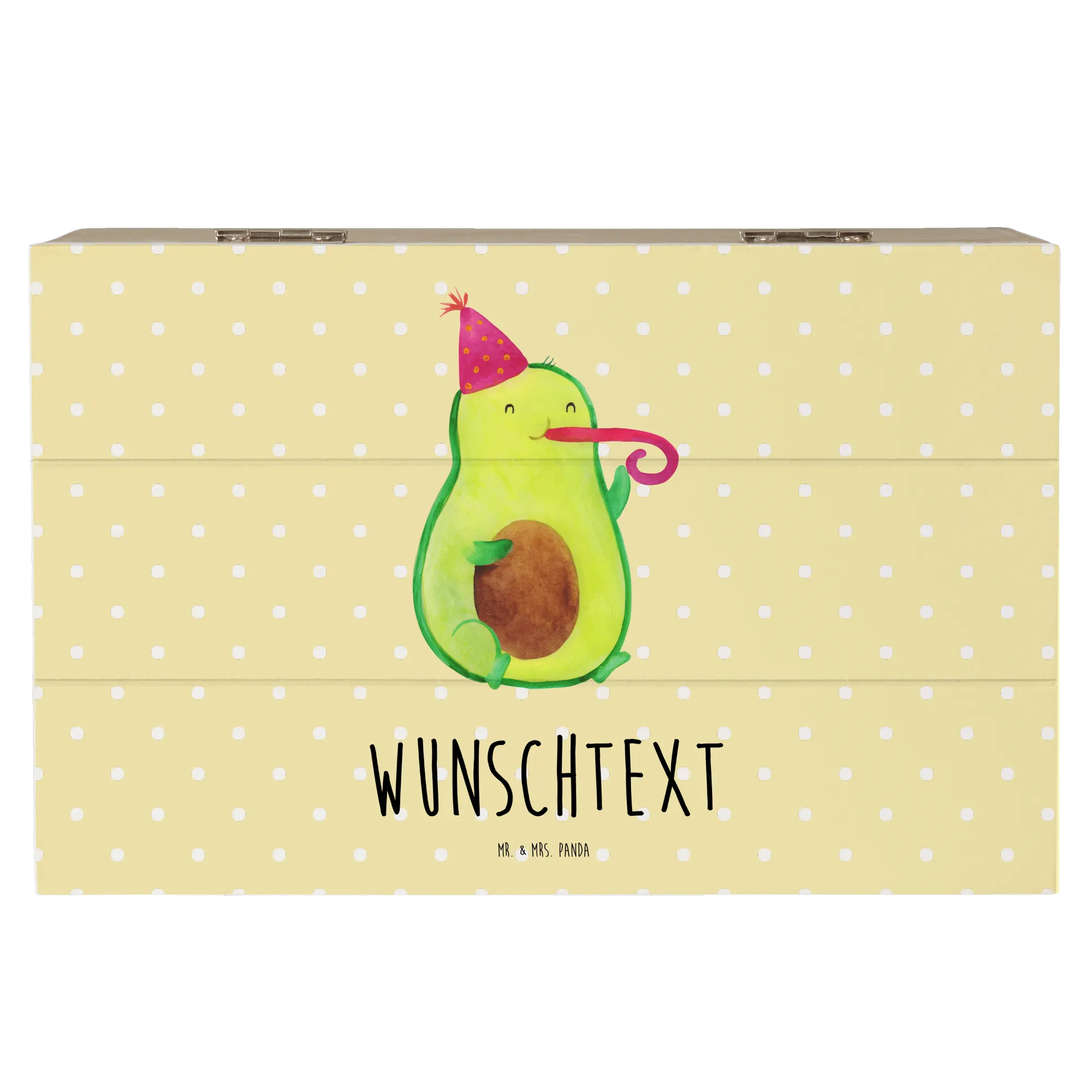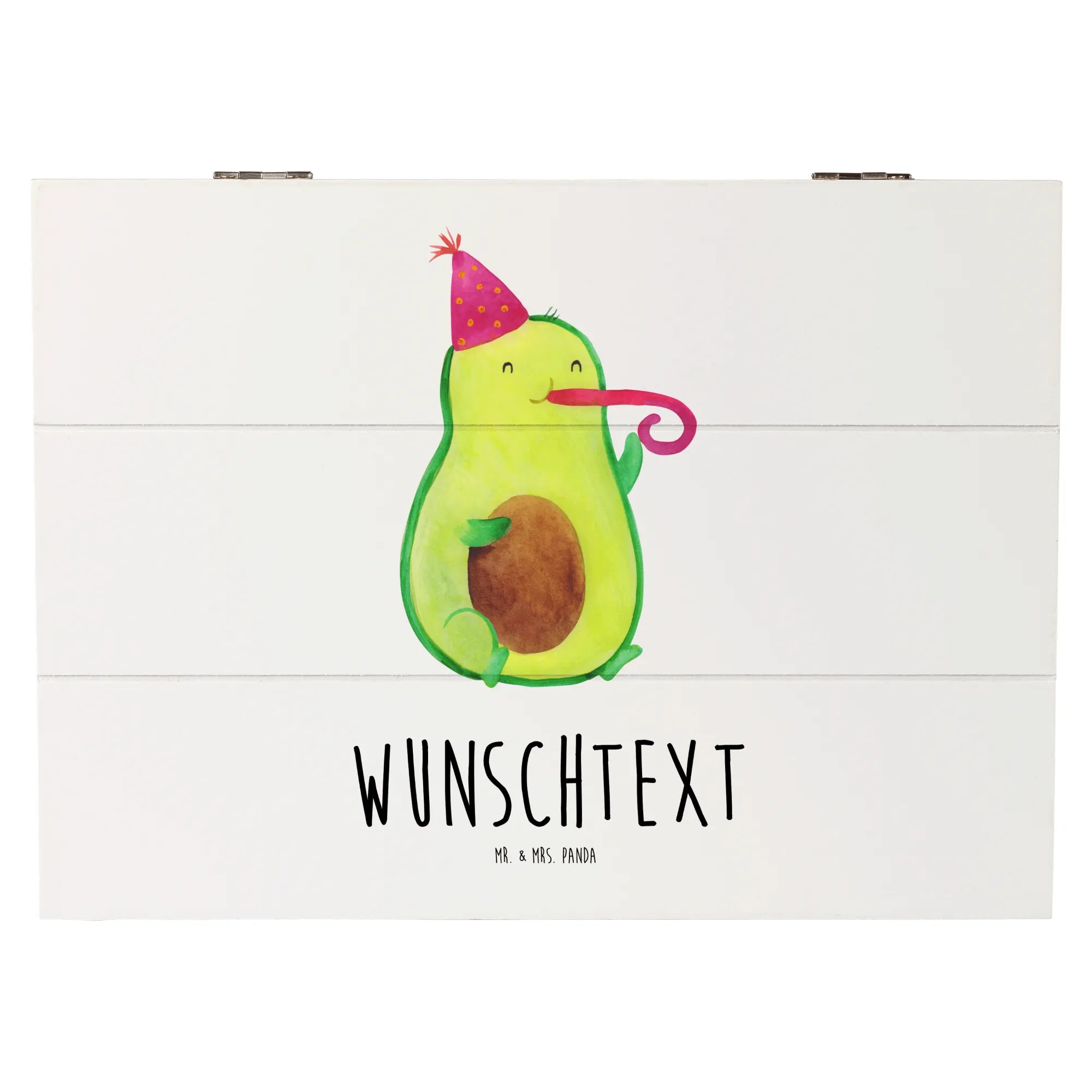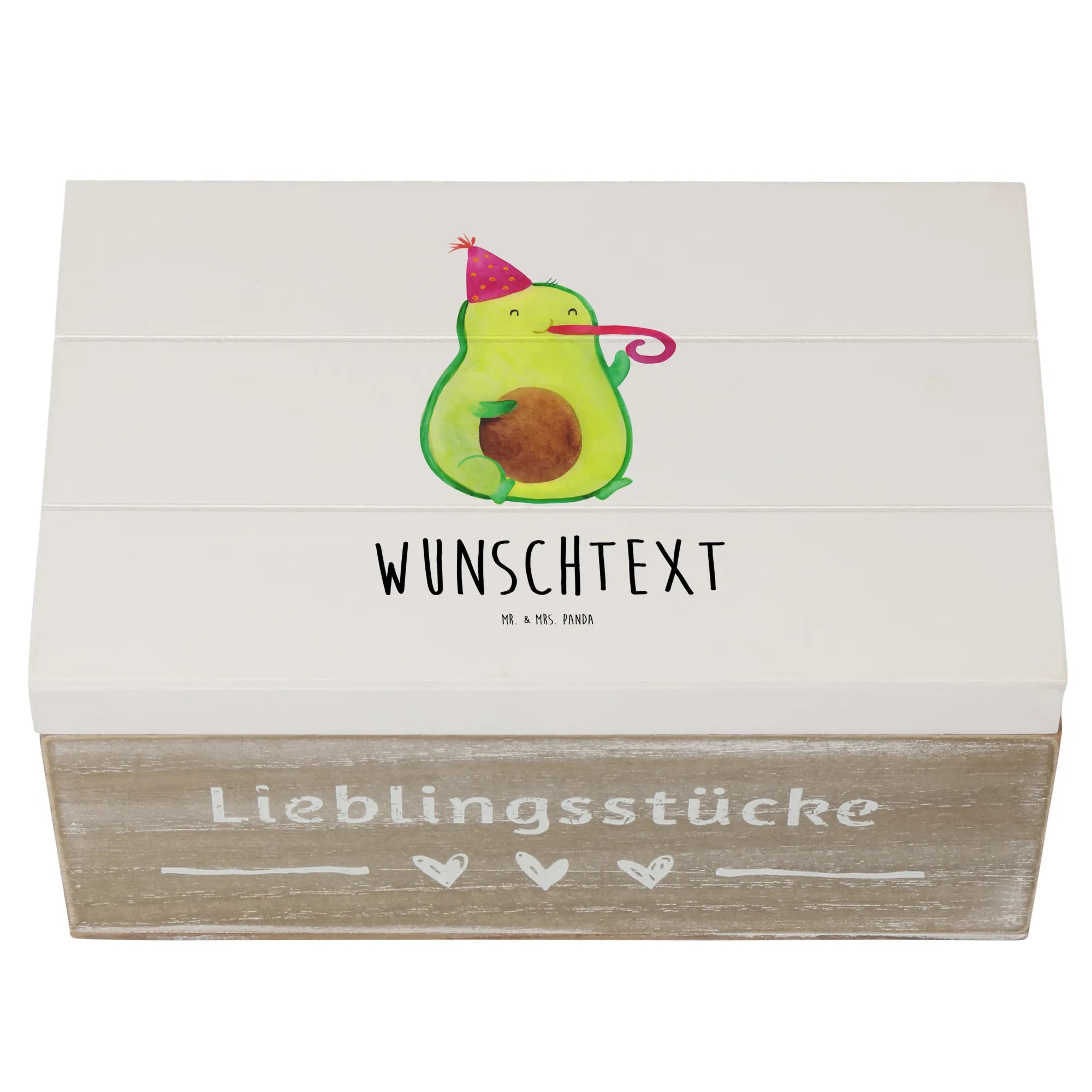 Die personalisierte Holzkiste mit dem fröhlichen Avocado-Motiv "Partyhupe" von Mr. & Mrs. Panda ist das perfekte Geschenk für alle, die das Leben in vollen Zügen genießen!
