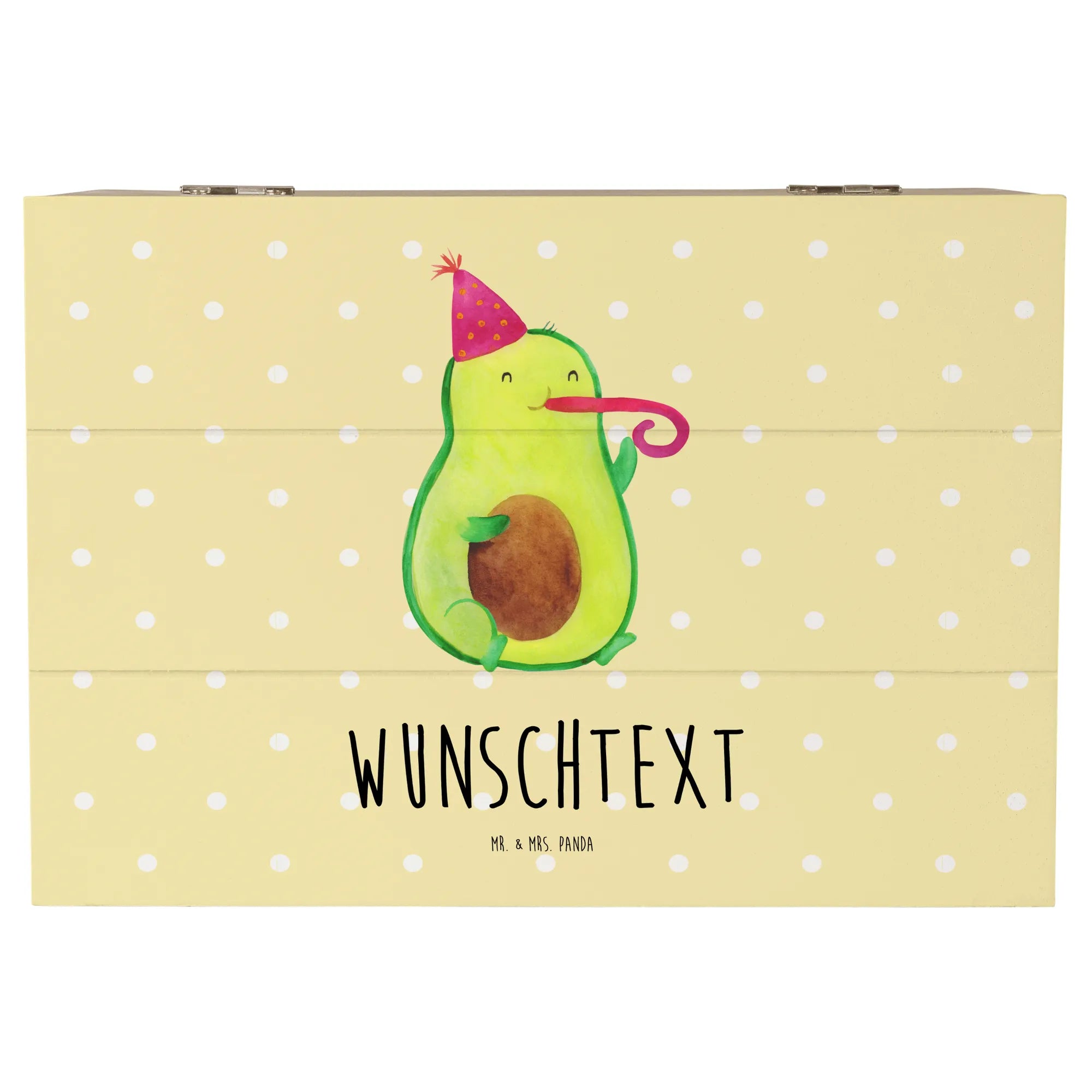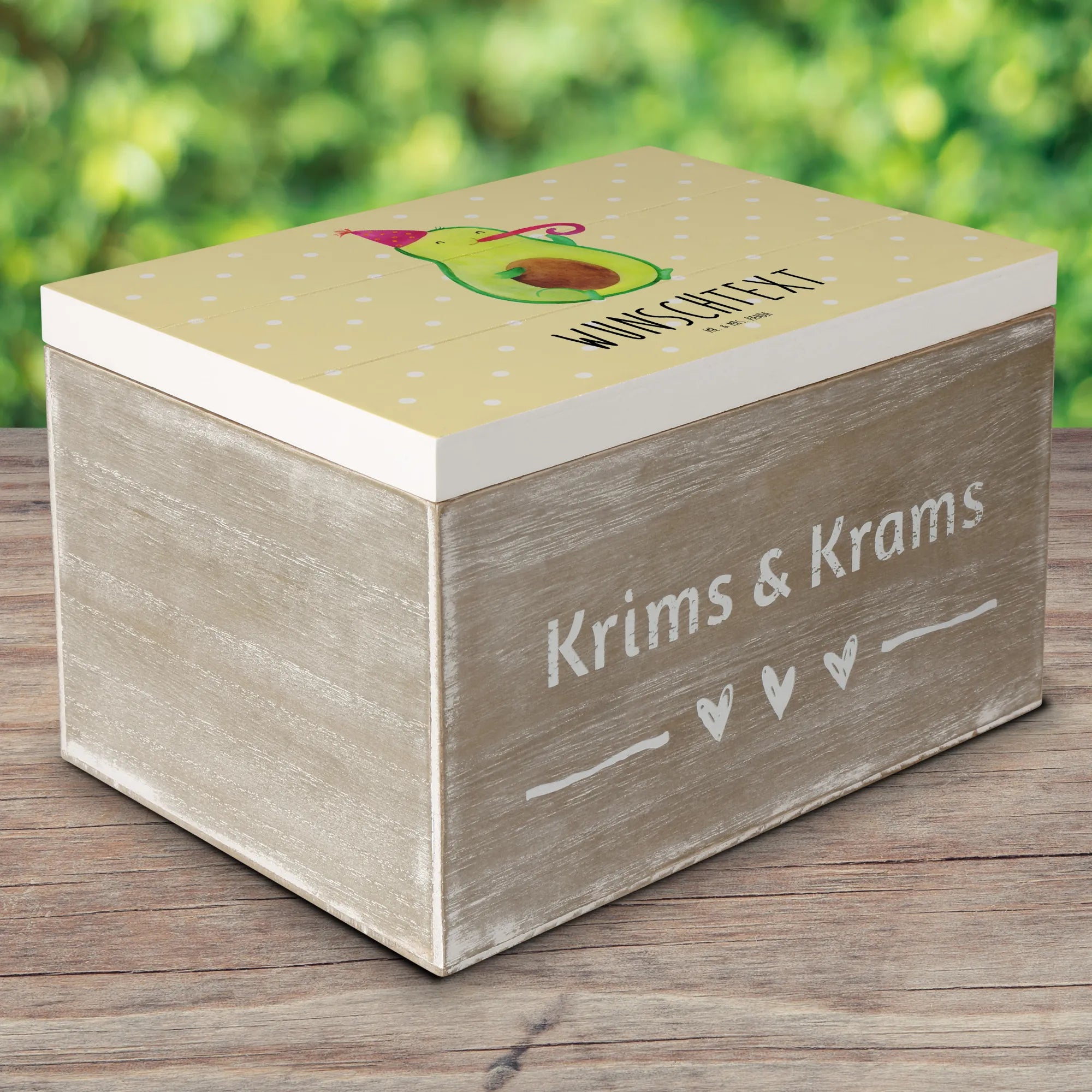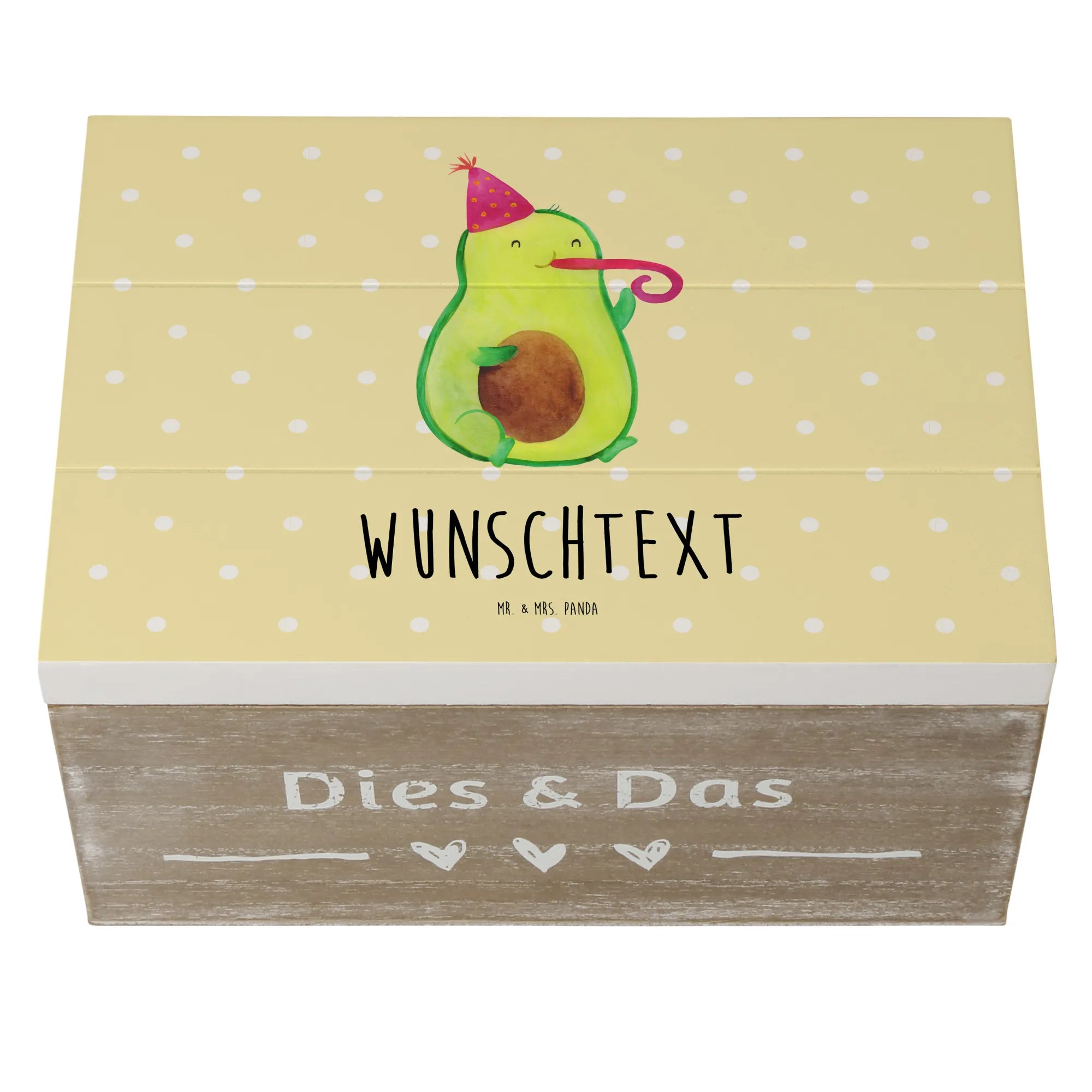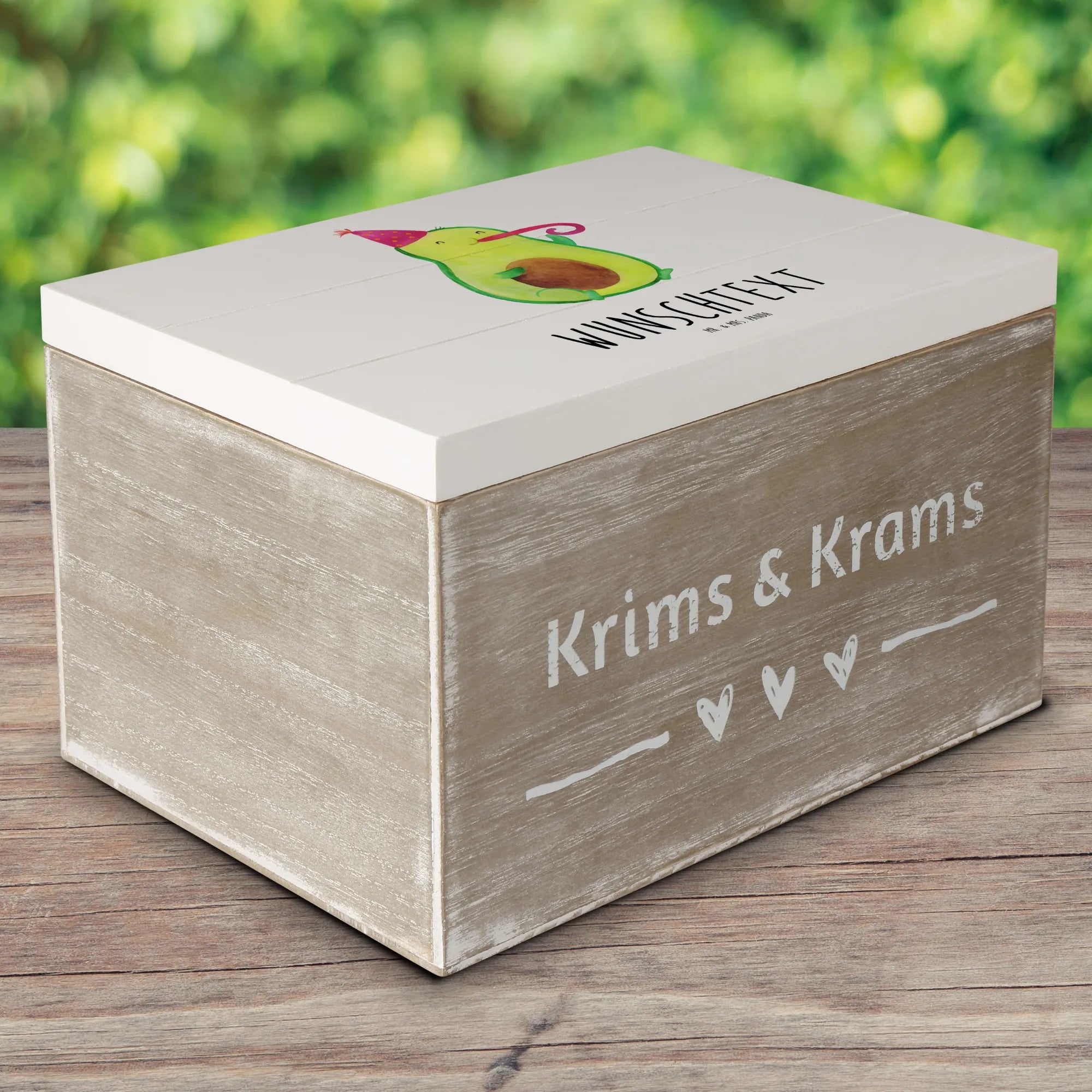 Die personalisierte Holzkiste mit dem fröhlichen Avocado-Motiv "Partyhupe" von Mr. & Mrs. Panda ist das perfekte Geschenk für alle, die das Leben in vollen Zügen genießen!