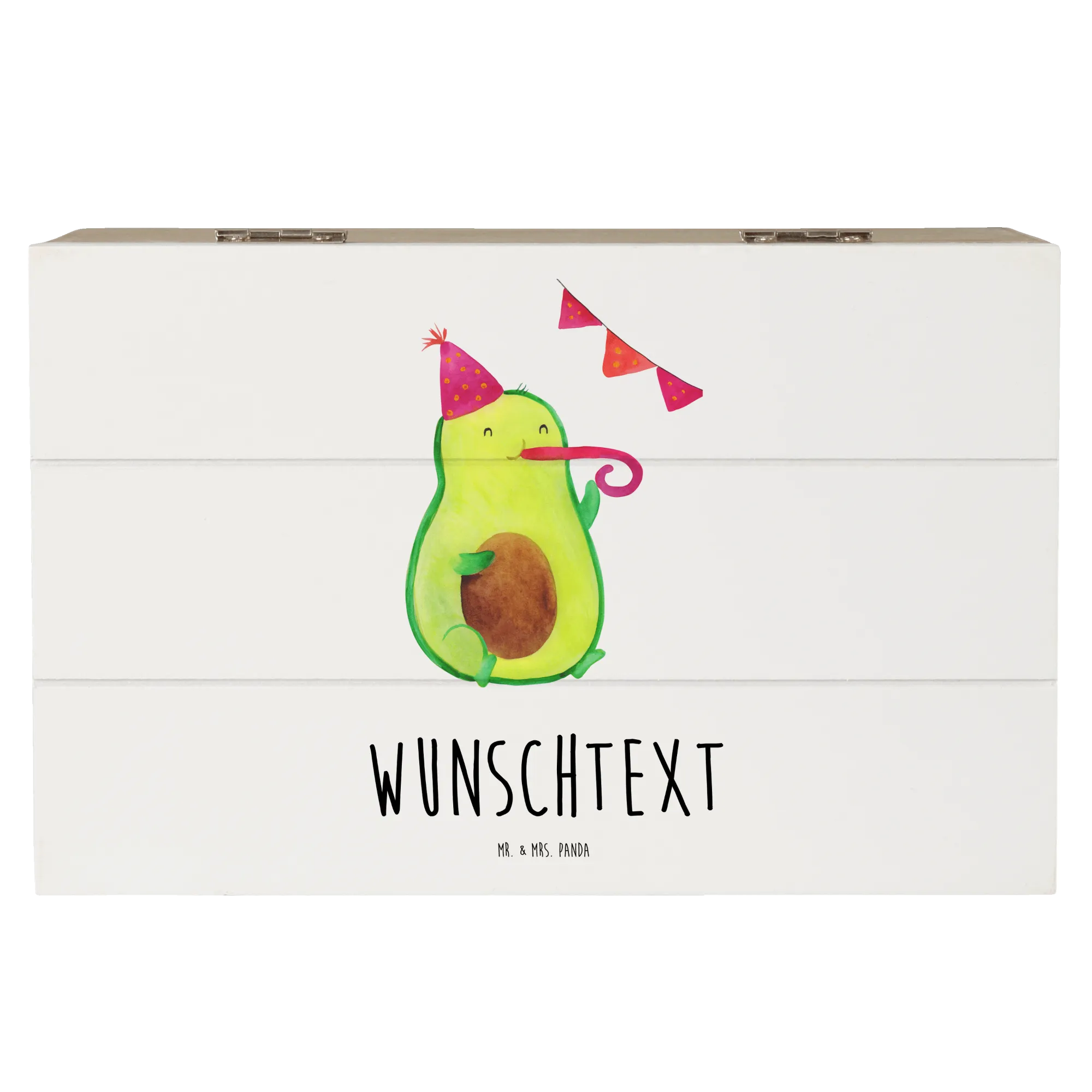 Die personalisierte Holzkiste 'Avocado Party Time' von Mr. & Mrs. Panda ist wie gemacht für alle, die das Leben lieben! Mit einem fröhlichen Avocado-Motiv, das einen Partyhut trägt und fröhlich in eine Partypfeife pustet, bringt sie Freude in jeden Raum.