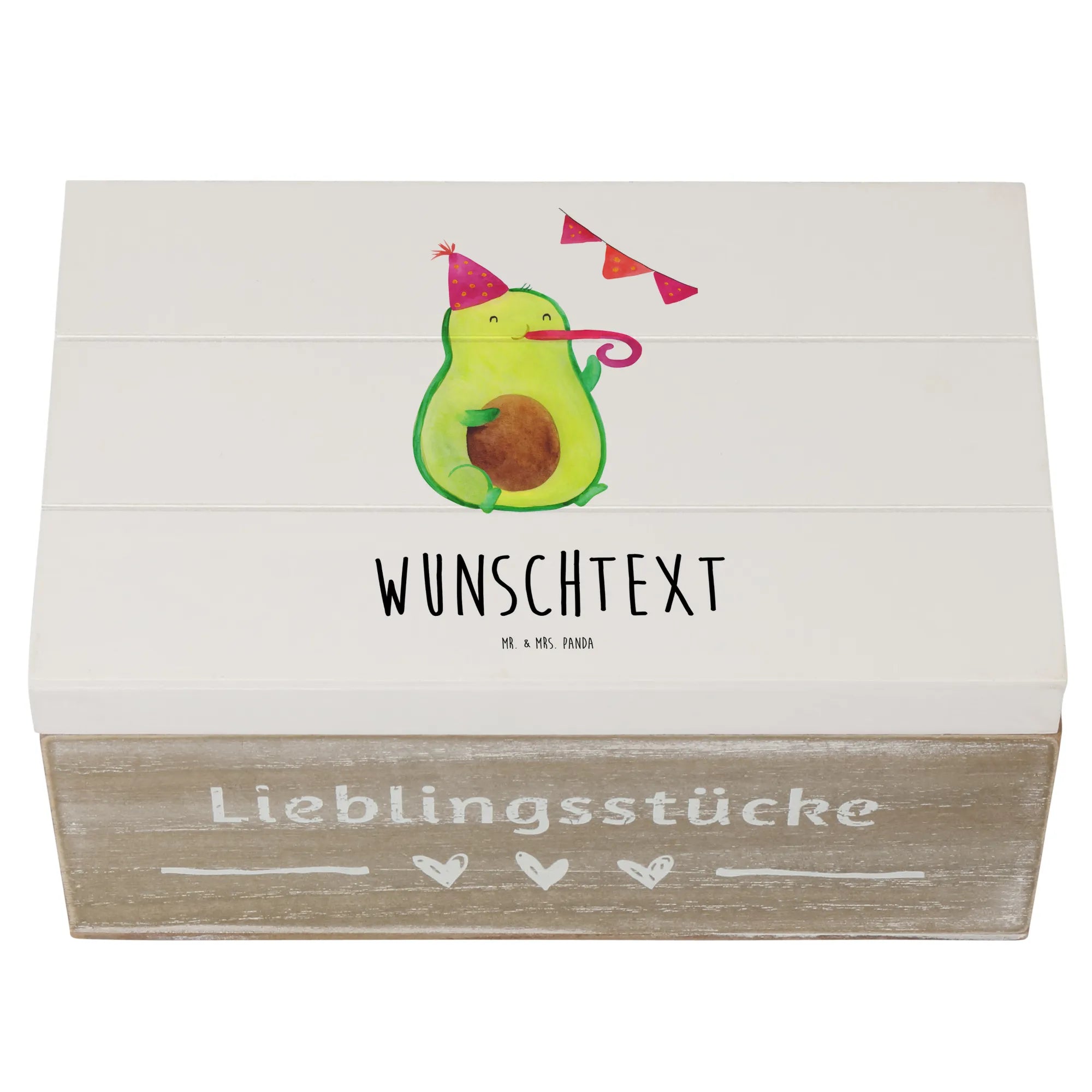 Die personalisierte Holzkiste "Avocado Party Time" von Mr. & Mrs. Panda ist DAS perfekte Geschenk für alle, die das Leben mit einer Prise Spaß und Kreativität würzen möchten. Sie eignet sich ideal als Aufbewahrungsort für all die kleinen Schätze, die Du im Laufe der Zeit gesammelt hast – sei es für Deine besten Erinnerungen, Fotos von besonderen Momenten oder auch für die kleinen Dinge, die für Dich eine große Bedeutung haben. Diese wunderschöne Kiste ist nicht nur äußerst praktisch, sondern auch von handgezeichneten, fröhlichen Avocado-Motiven geschmückt, die das Herz jedes Avocado-Liebhabers höher schlagen lassen. Die süße, kleine Avocado, die mit einem Partyhut und einer Partypfeife ausgestattet ist, bringt garantiert jeden zum Lächeln!