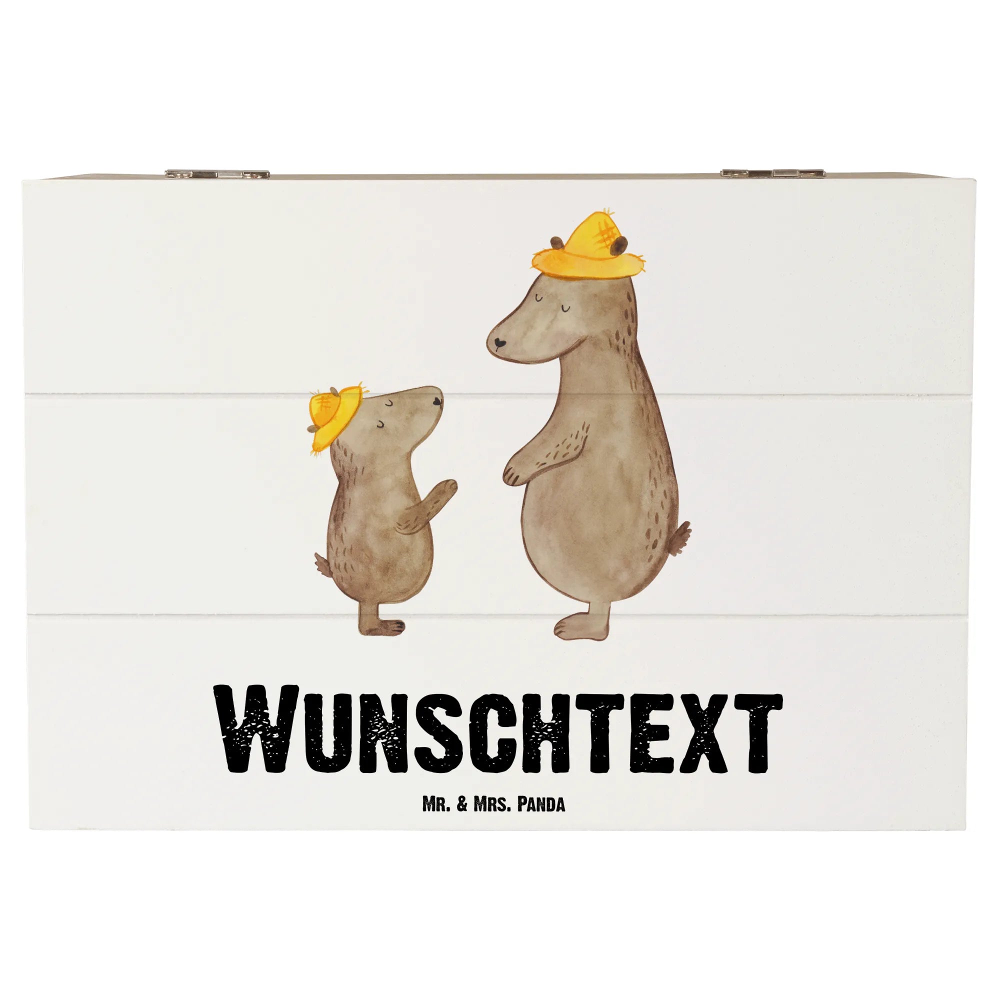 Das entzückende Motiv zeigt einen großen Bären mit Hut, der auf einen kleinen Bären blickt, der ebenfalls einen kleinen Hut trägt. Dies vermittelt eine herzliche Botschaft und macht die Kiste zu einem ganz besonderen Geschenk für stolze Väter. Die Einschlagscharniere ermöglichen ein einfaches Öffnen und Schließen der Kiste, sodass sie auch bei häufigem Gebrauch lange Freude bereitet. Diese persönliche Holzkiste ist nicht abschließbar, kann jedoch wunderbar als dekorative Box verwendet werden.