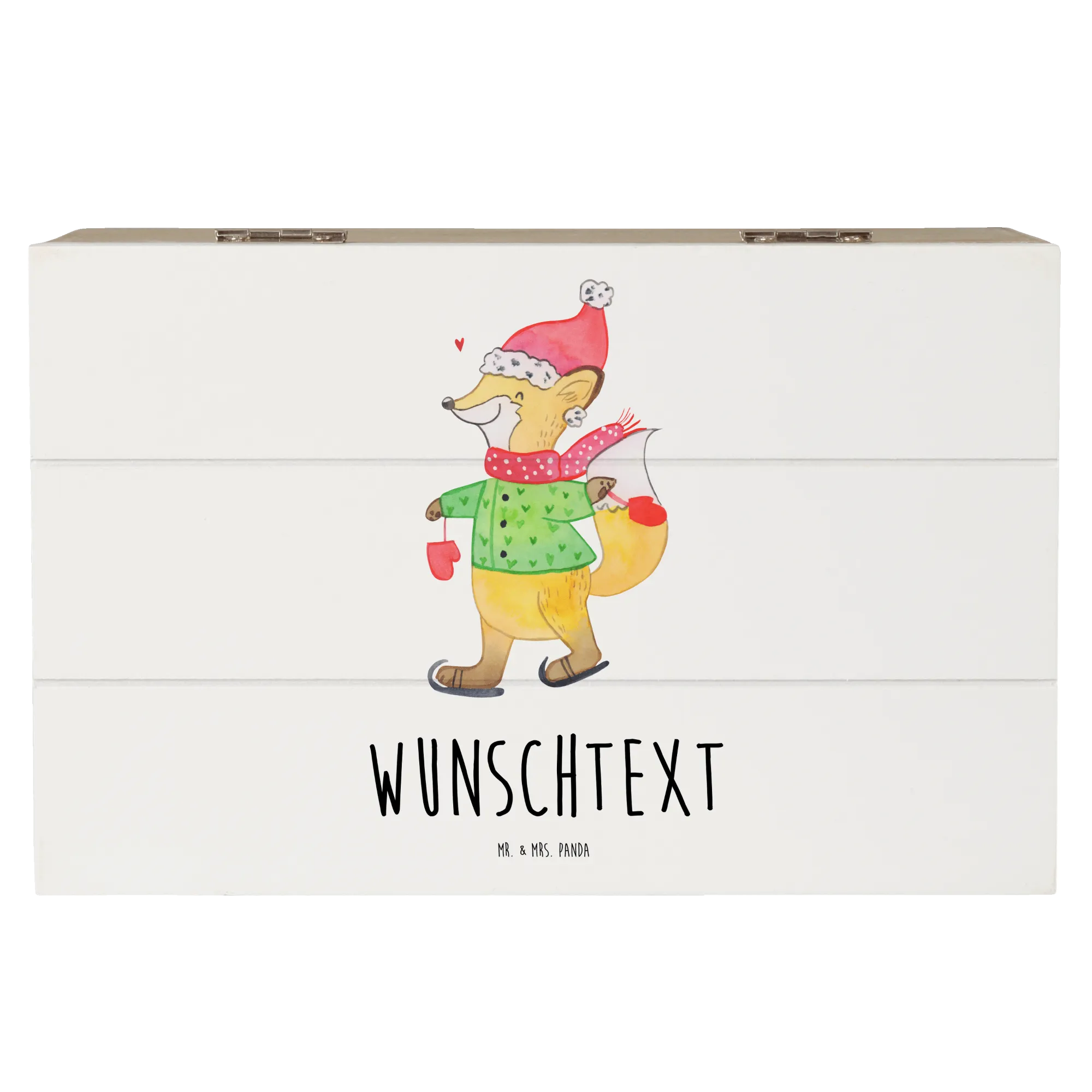 Die personalisierten Holzkiste Fuchs Schlittschuhe von Mr. & Mrs. Panda ist die perfekte Geschenkidee für die kalte Jahreszeit! Mit einem fröhlich wirkenden Fuchs, der Schlittschuhe trägt, zaubert diese Kiste nicht nur zum Fest der Liebe, sondern das ganze Jahr über ein Lächeln in jedes Gesicht. Diese wunderschöne Holzkiste ist personalisierbar mit deinem Wunschtext oder Wunschnamen und eignet sich ideal als Erinnerungsbox für deine kleinen Schätze oder als Dekokiste für hyggelige Abende.