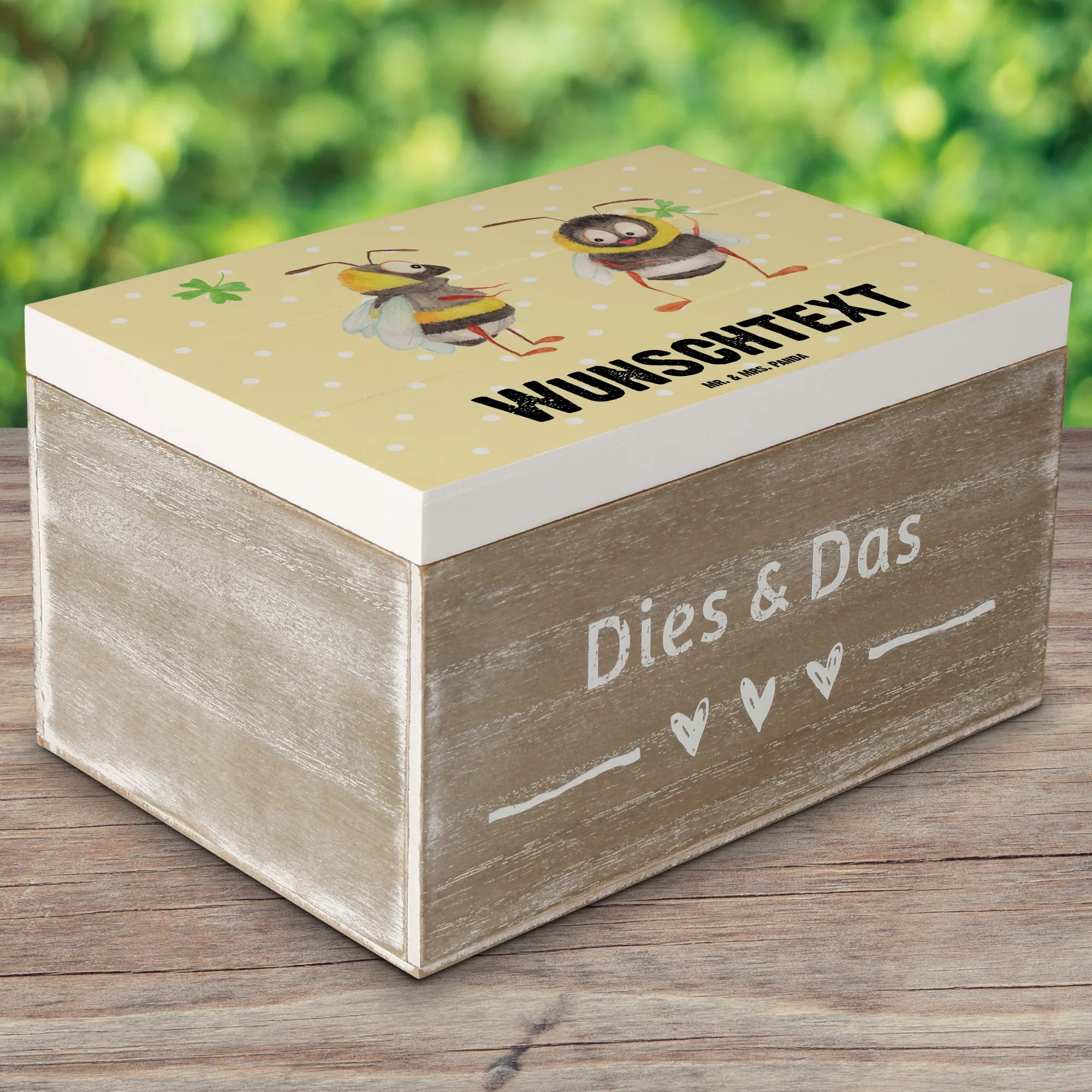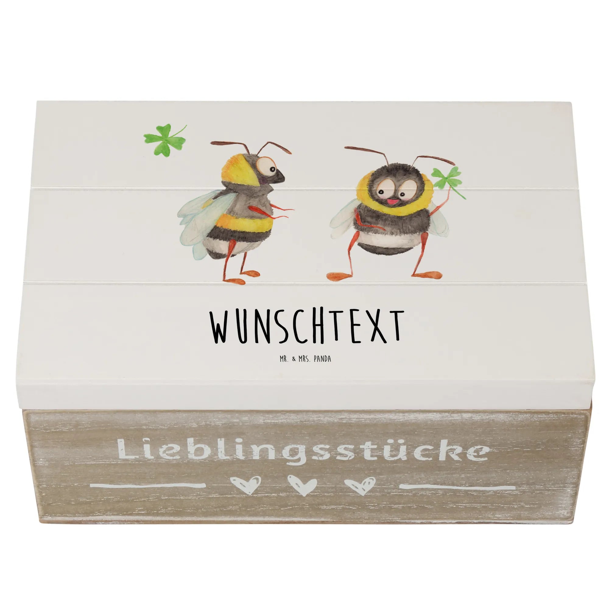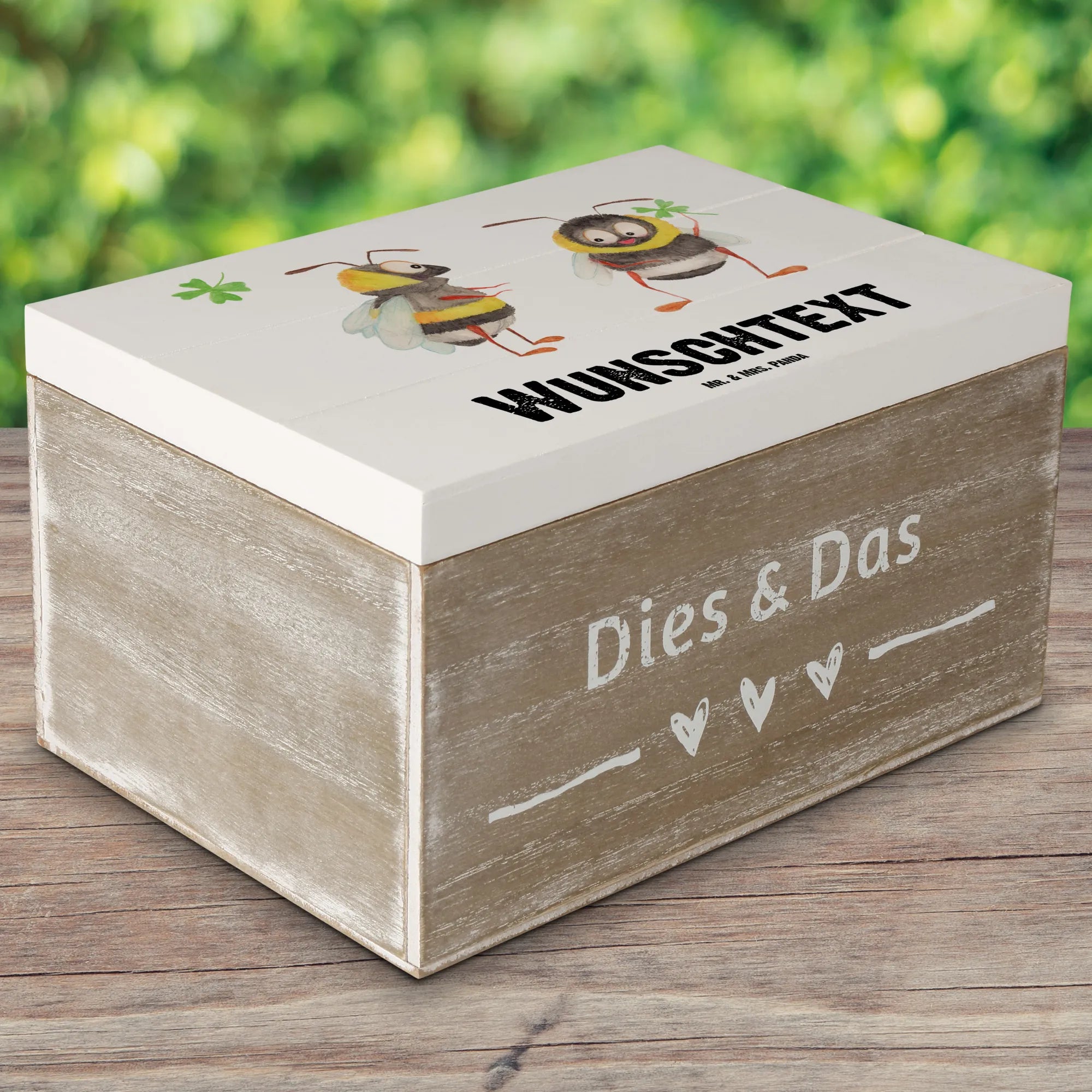 Wenn Du auf der Suche nach einem ganz besonderen Geschenk bist, dann ist die personalisierte Holzkiste mit dem bezaubernden Motiv der Hummeln mit Kleeblatt aus der Small World Kollektion von Mr. & Mrs. Panda genau das Richtige für Dich!