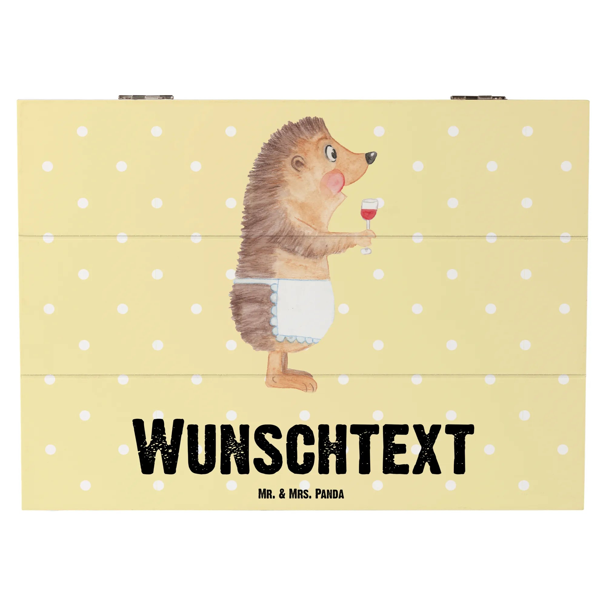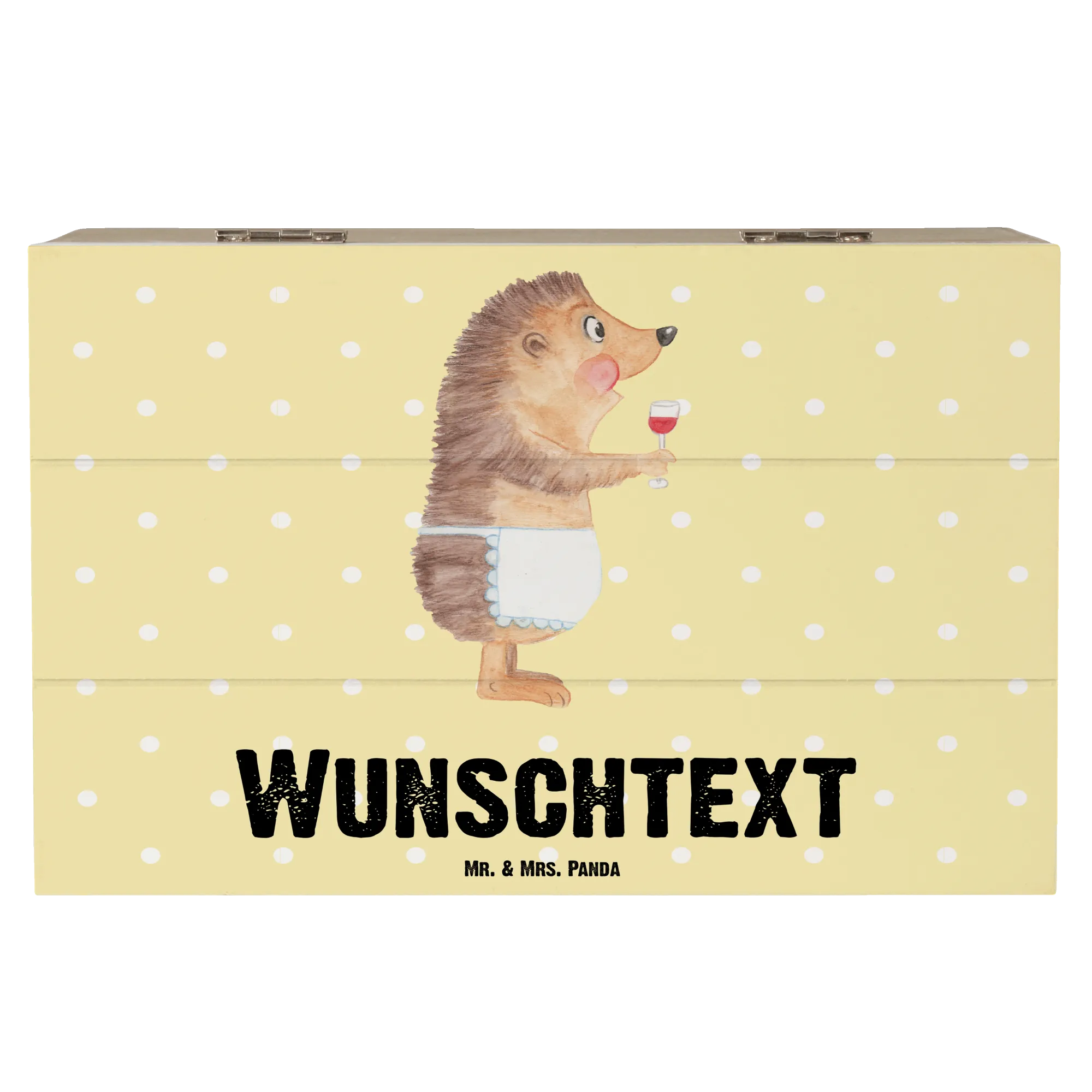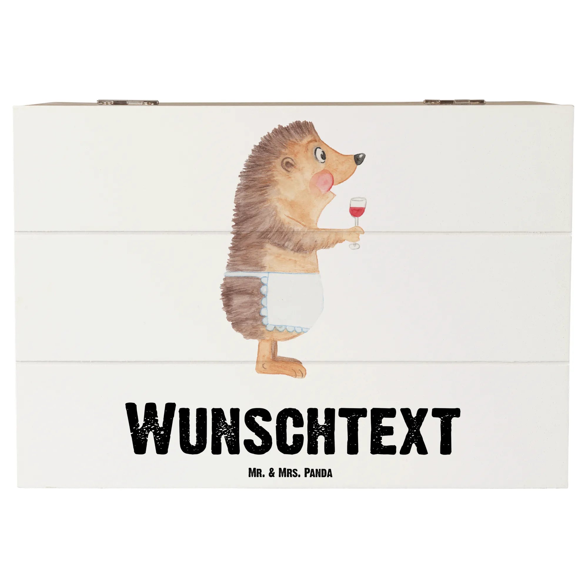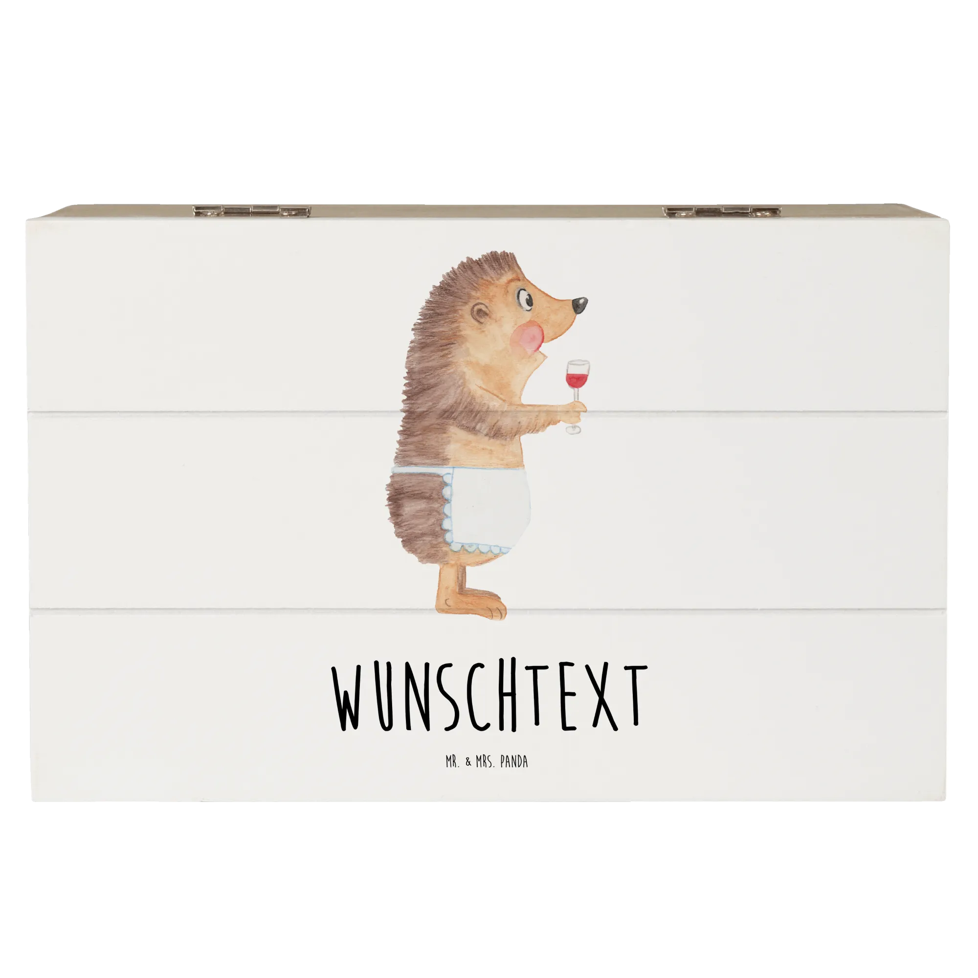 Entdecke die zauberhafte personalisierte Holzkiste mit dem tollen Motiv "Igel mit Wein" von Mr. & Mrs. Panda!