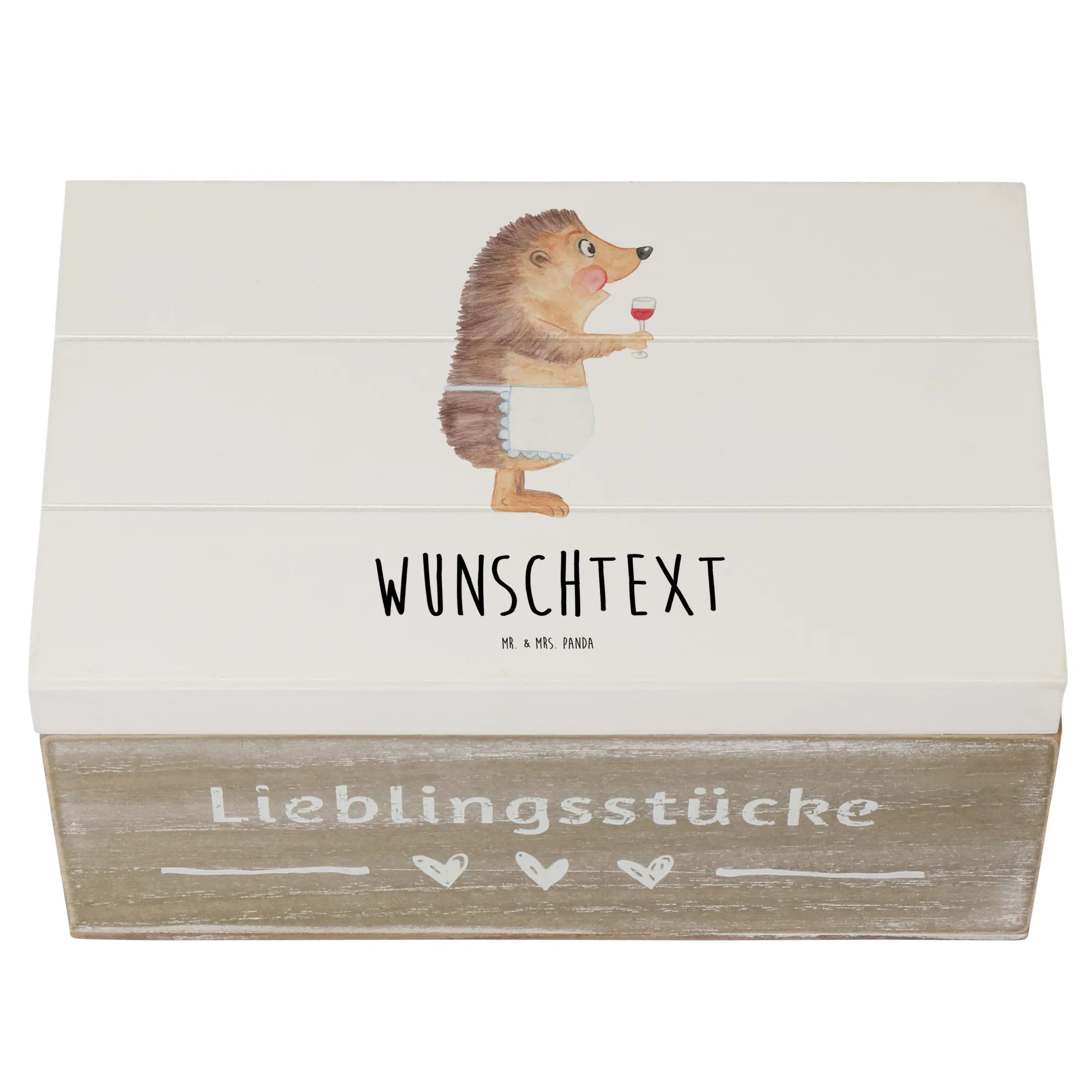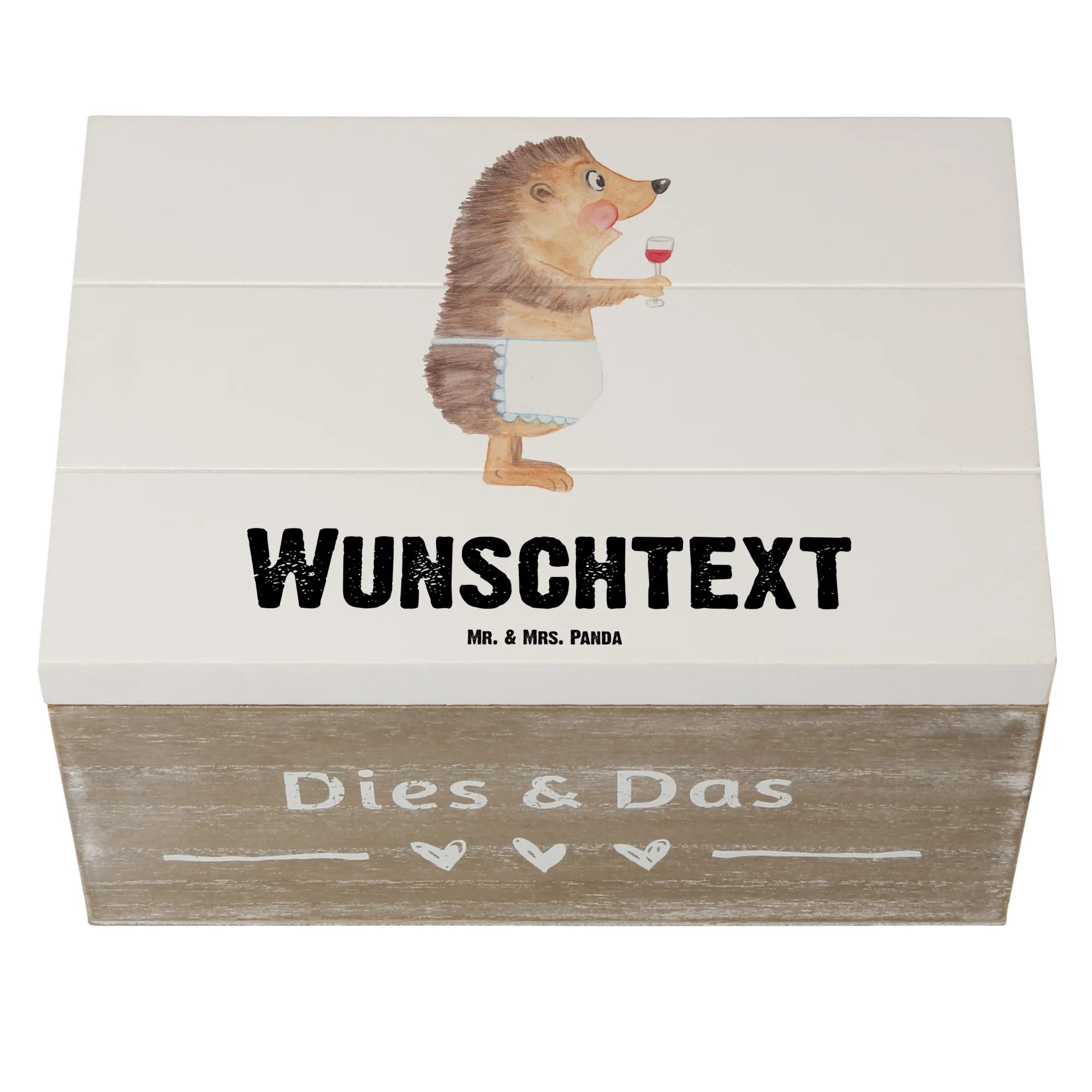 Entdecke die bezaubernde personalisierte Holzkiste mit dem liebevollen Motiv "Igel mit Wein" aus der beliebten Small World Kollektion von Mr. & Mrs. Panda!