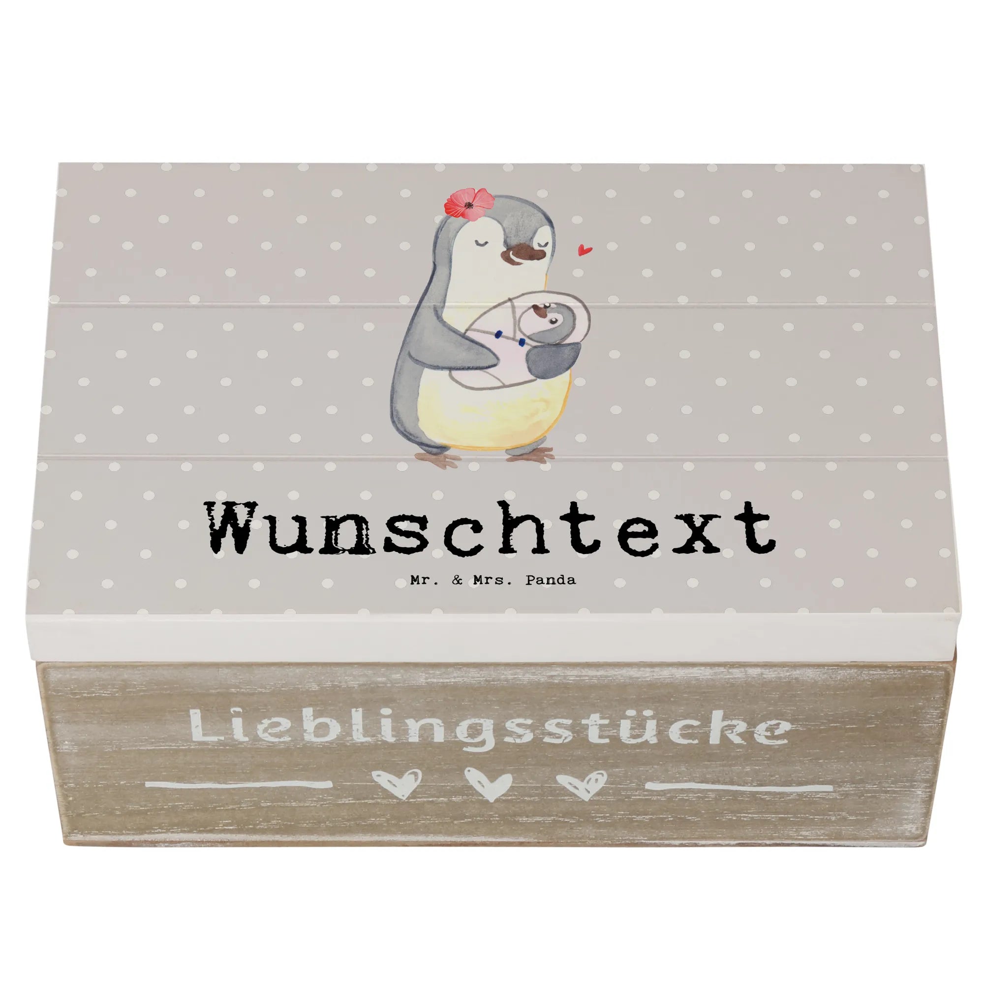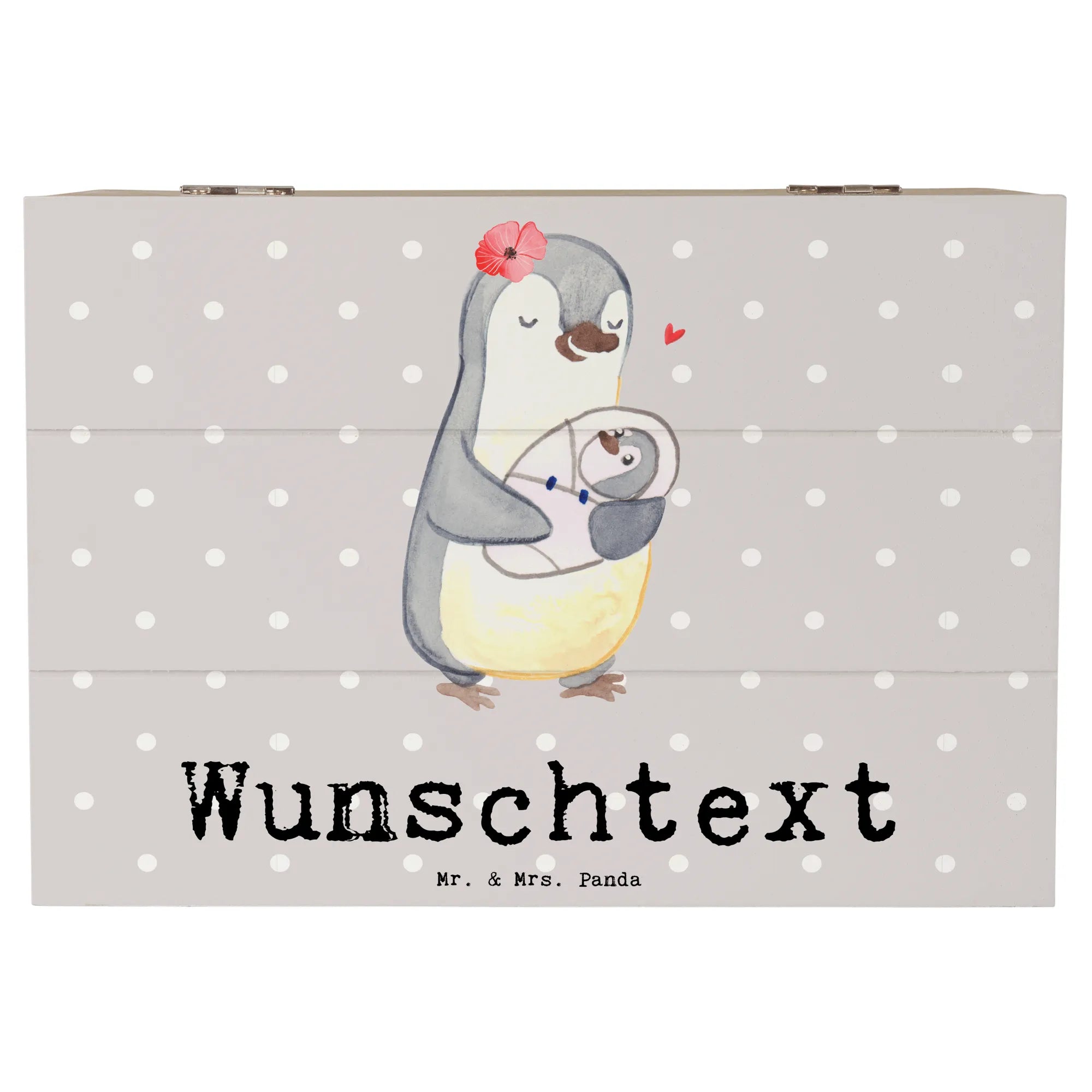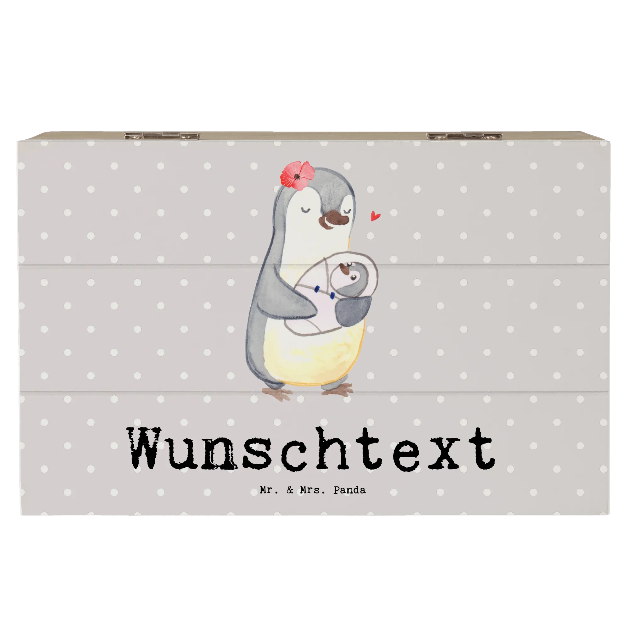 Und das Beste: Die Kiste ist personalisiertbar mit deinem eigenen Wunschtext oder Namen, was sie zu einem einzigartigen und unvergesslichen Geschenk macht. Das süße Motiv einer Krippenerzieherin, die einen kleinen Pinguin im Arm hält, bringt ein Lächeln auf die Gesichter der Beschenkten.