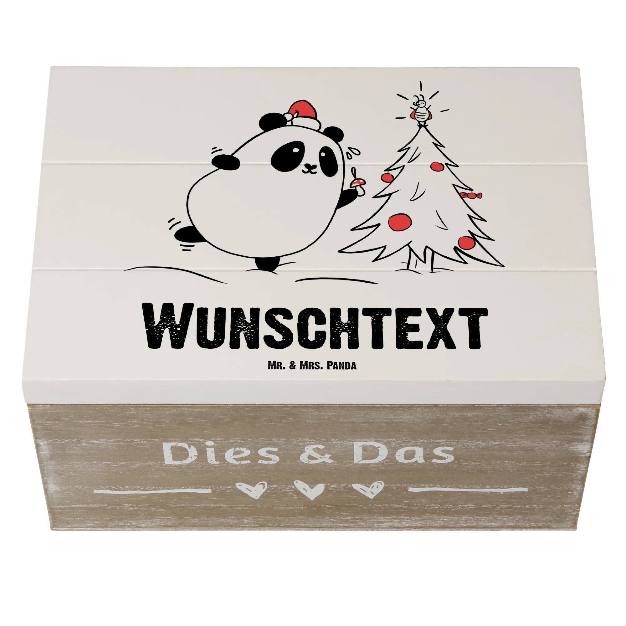 Die Kiste ist liebevoll aus stabiler Holzfaser gefertigt und überzeugt durch ihr einzigartiges Design, das von der talentierten Mrs. Panda handgezeichnet wurde. Geziert mit einem süßen Panda, der mit einer Nikolausmütze deinen Weihnachtsbaum schmückt, und einem fröhlichen Marienkäfer als Spitze, bringt sie gute Laune und festlichen Flair in dein Zuhause.