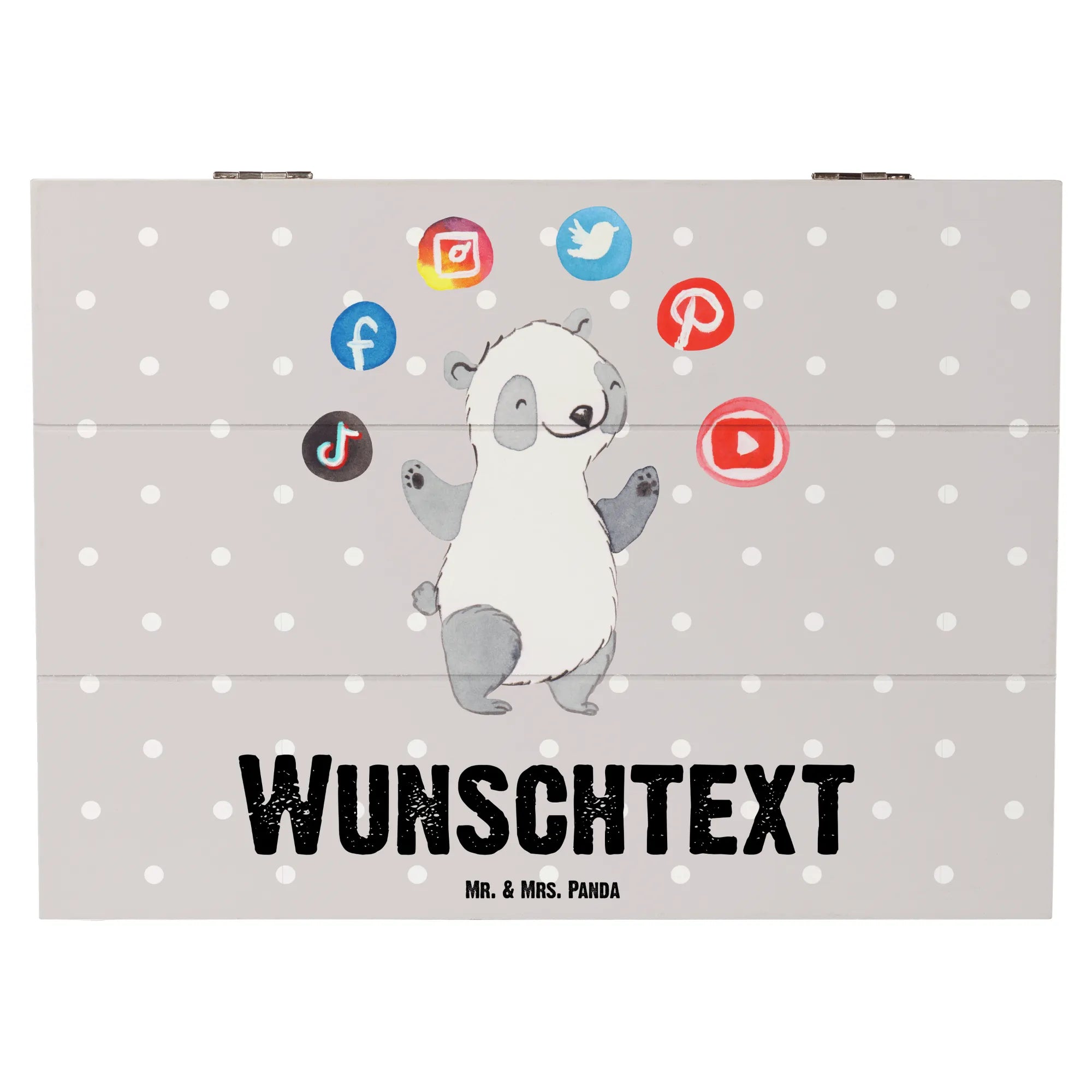 Die Kiste wird aus hochwertiger Premium Hartfaser gefertigt und besticht mit einem niedlichen Panda, der fröhlich mit Social Media Icons jongliert. Zudem ist sie personalisierbar mit deinem Wunschtext oder Wunschnamen, sodass du das Geschenk ganz individuell gestalten kannst.