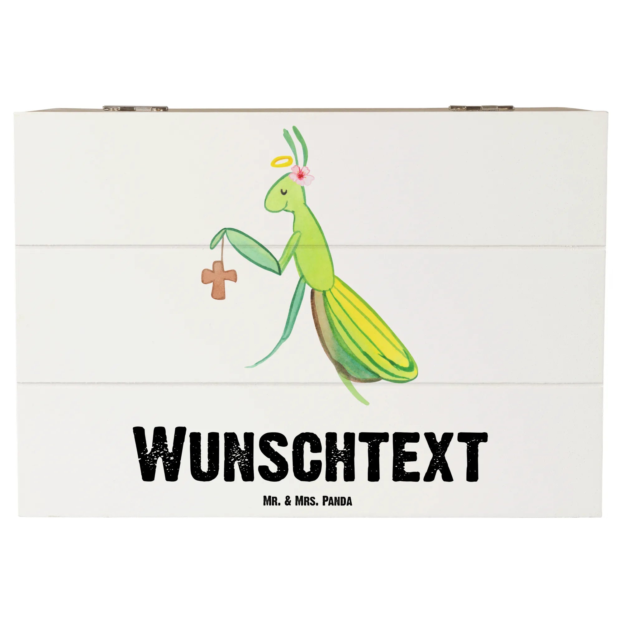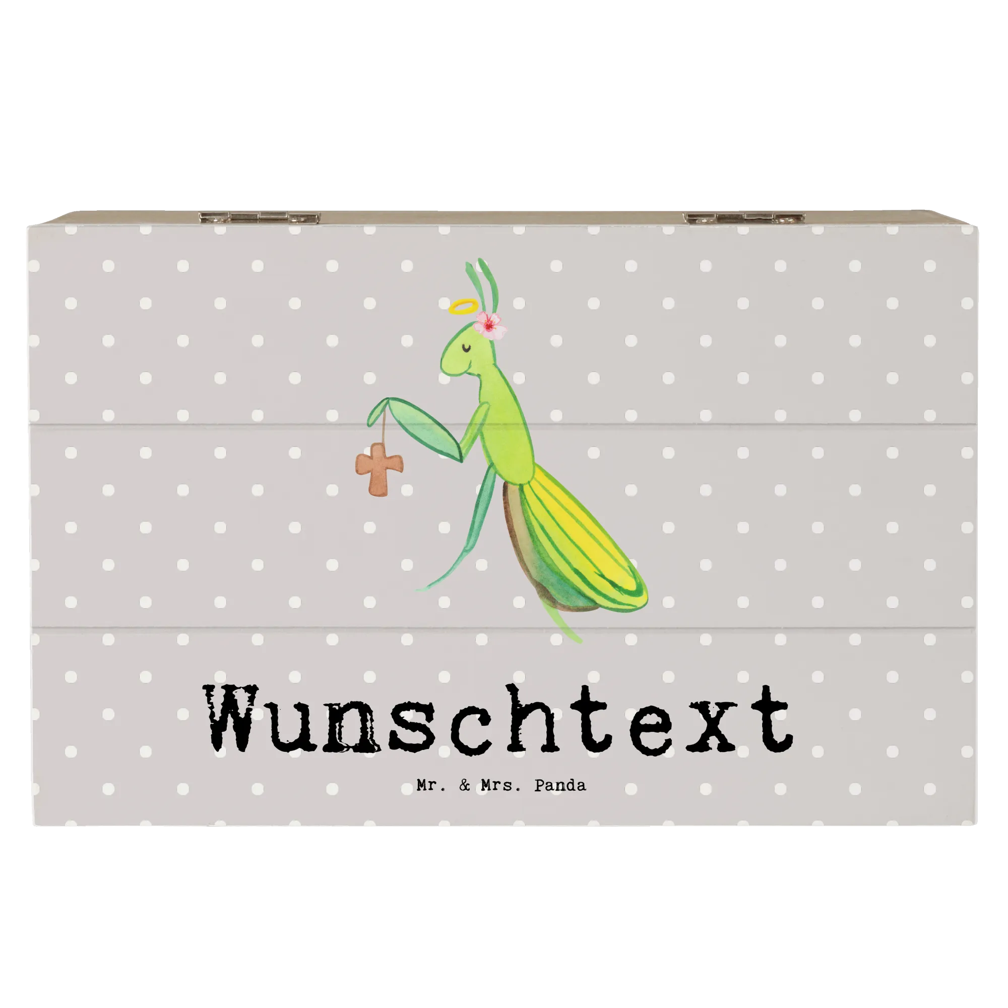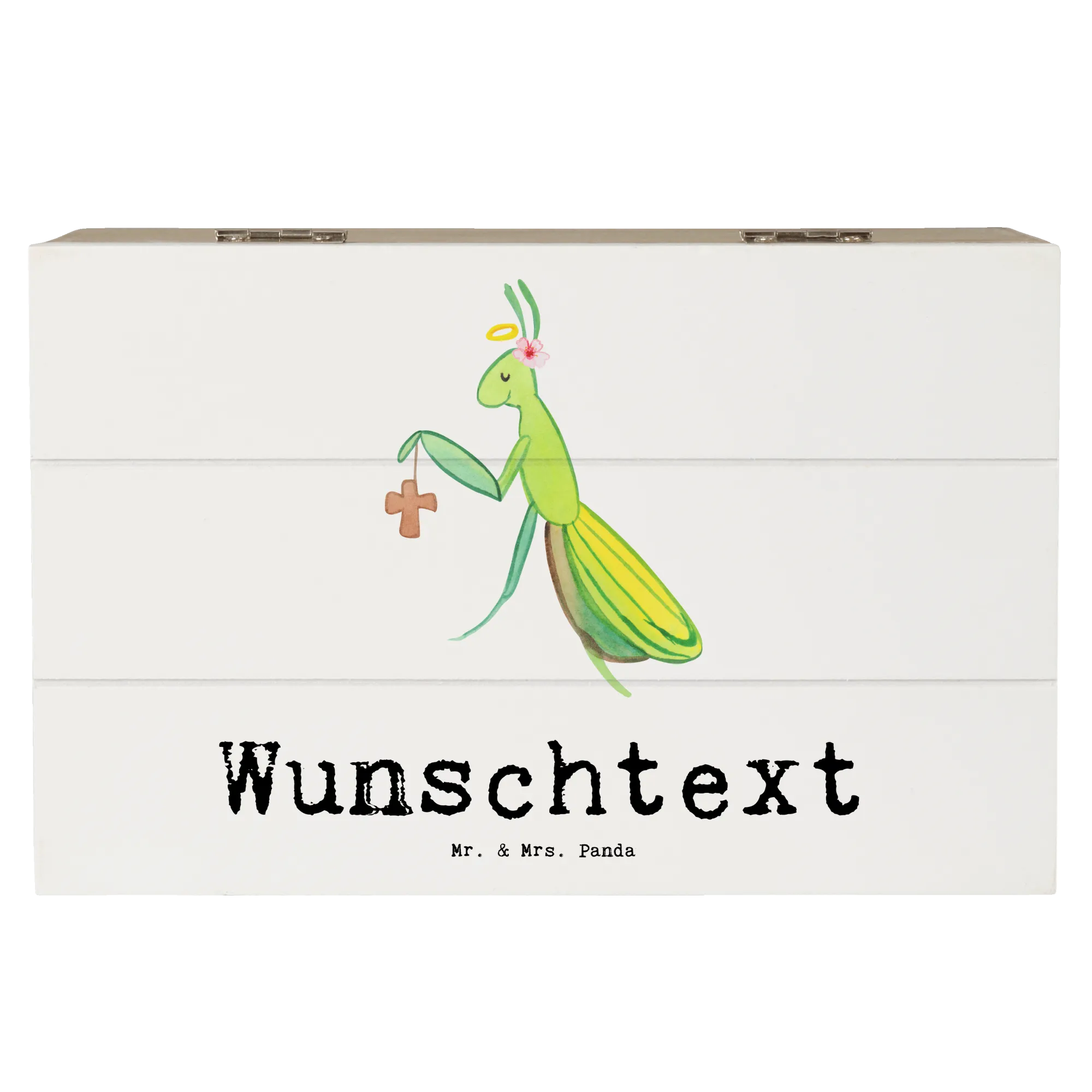 Die süße Gottesanbeterin mit einem Kreuz und dem Slogan „Du bist nur ein halber Mensch, wenn du keine Religionslehrerin bist“ verleihen der Kiste einen charmanten und humorvollen Touch. Diese Holzkiste ist ideal, um Dankeschön zu sagen, sei es zum Berufsabschluss, Jubiläum oder einfach nur so.