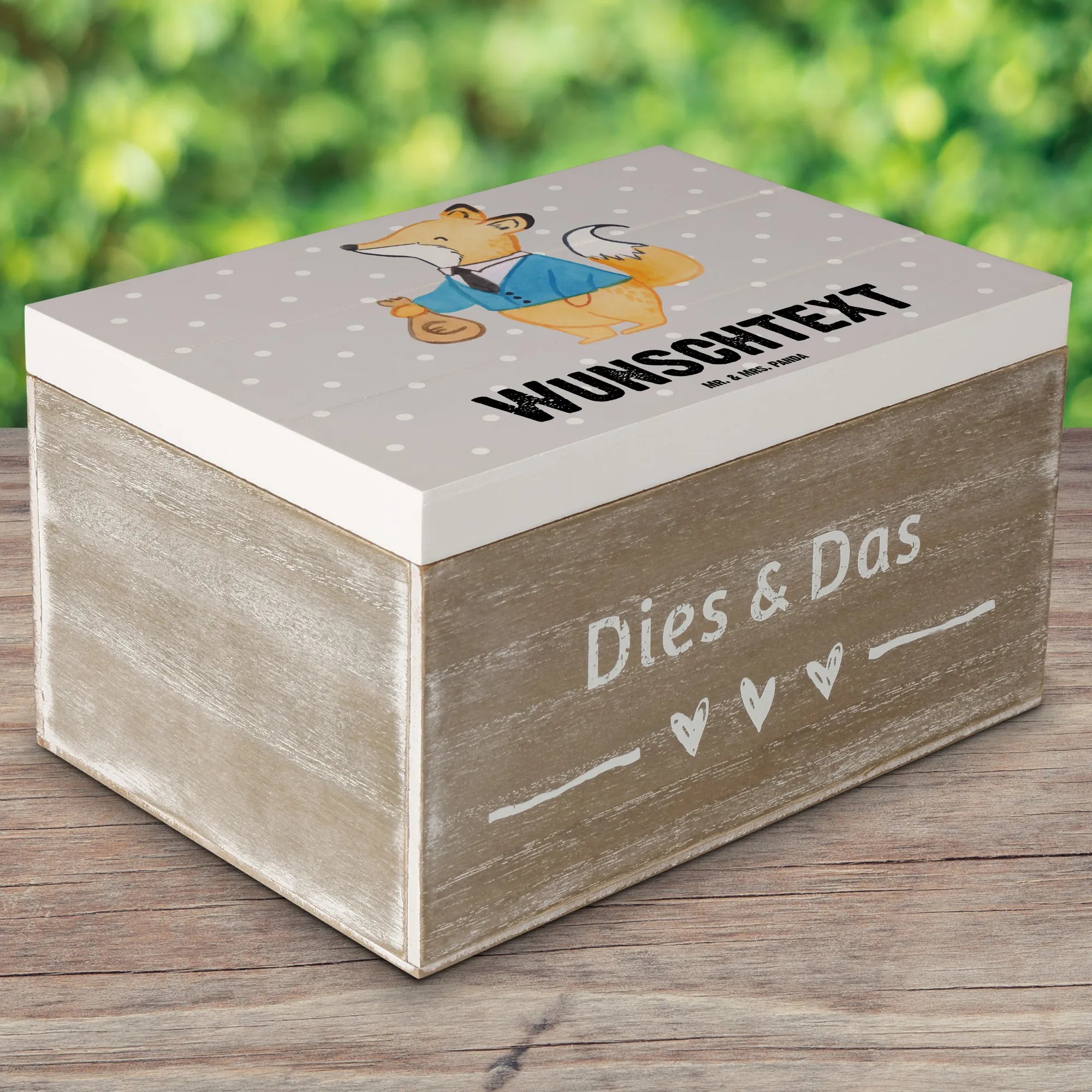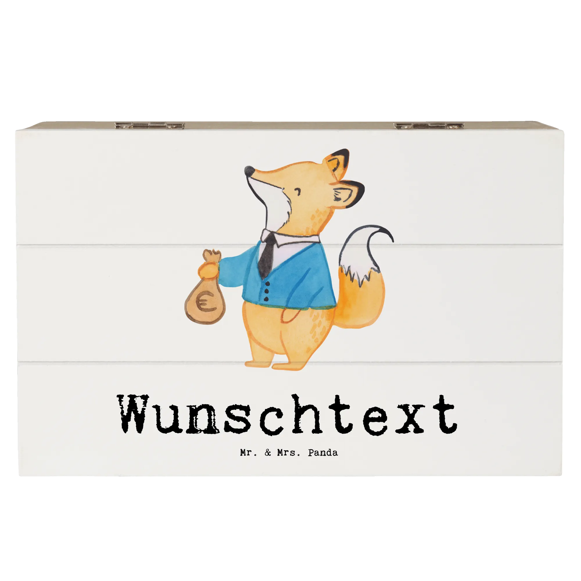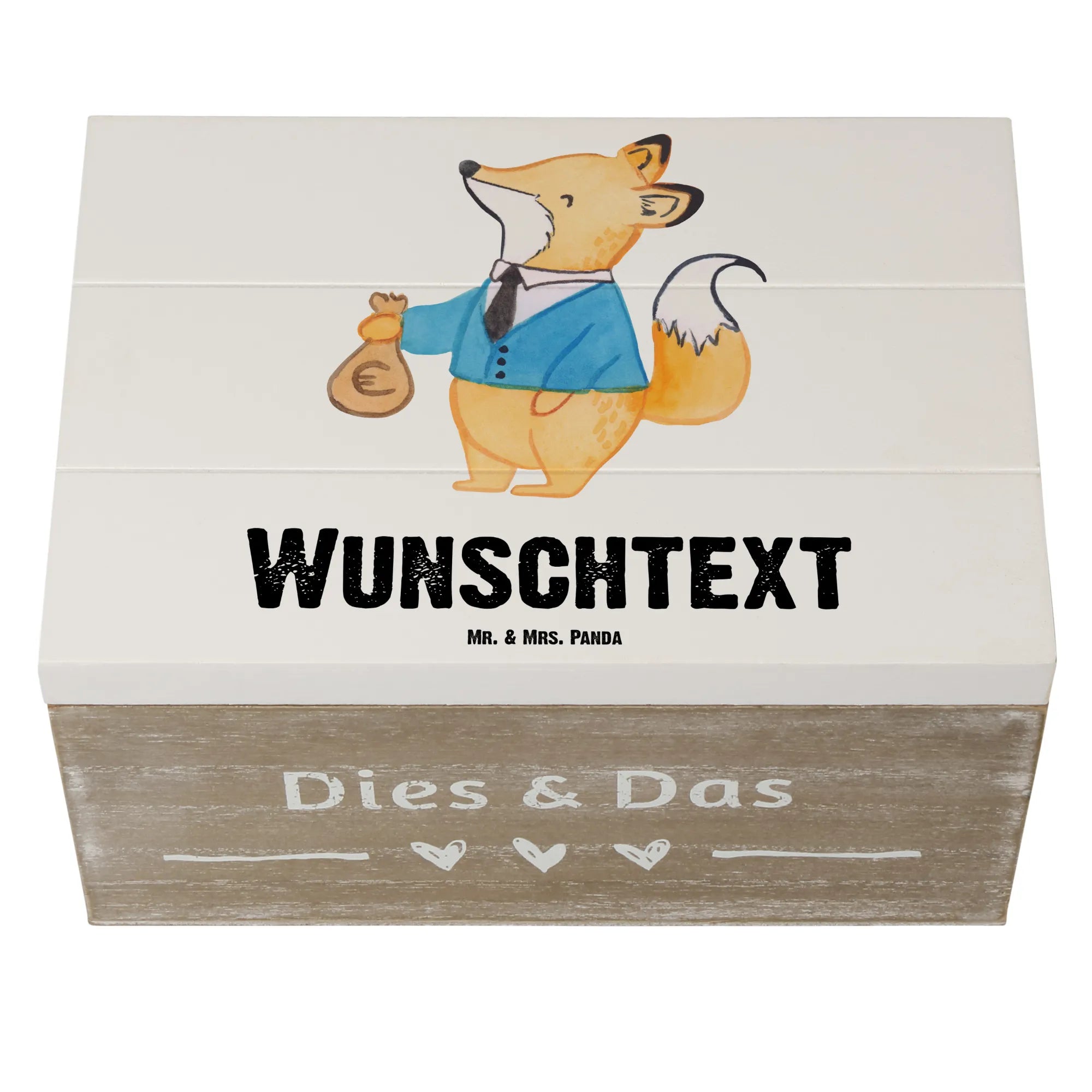 Entdecke die wunderschöne personalisierte Holzkiste "Steuerberater mit Herz" von Mr. & Mrs. Panda! Diese einzigartige Kiste ist nicht nur ein perfekter Aufbewahrungsort für all deine Schätze, sondern auch ein ganz persönliches Geschenk für deine Lieblingssteuerberater oder die Kollegin im Büro. Mit dem süßen Motiv eines Fuchses in schickem Anzug, der mit einem Säckchen Geld posiert, ist diese Kiste ein echter Blickfang.