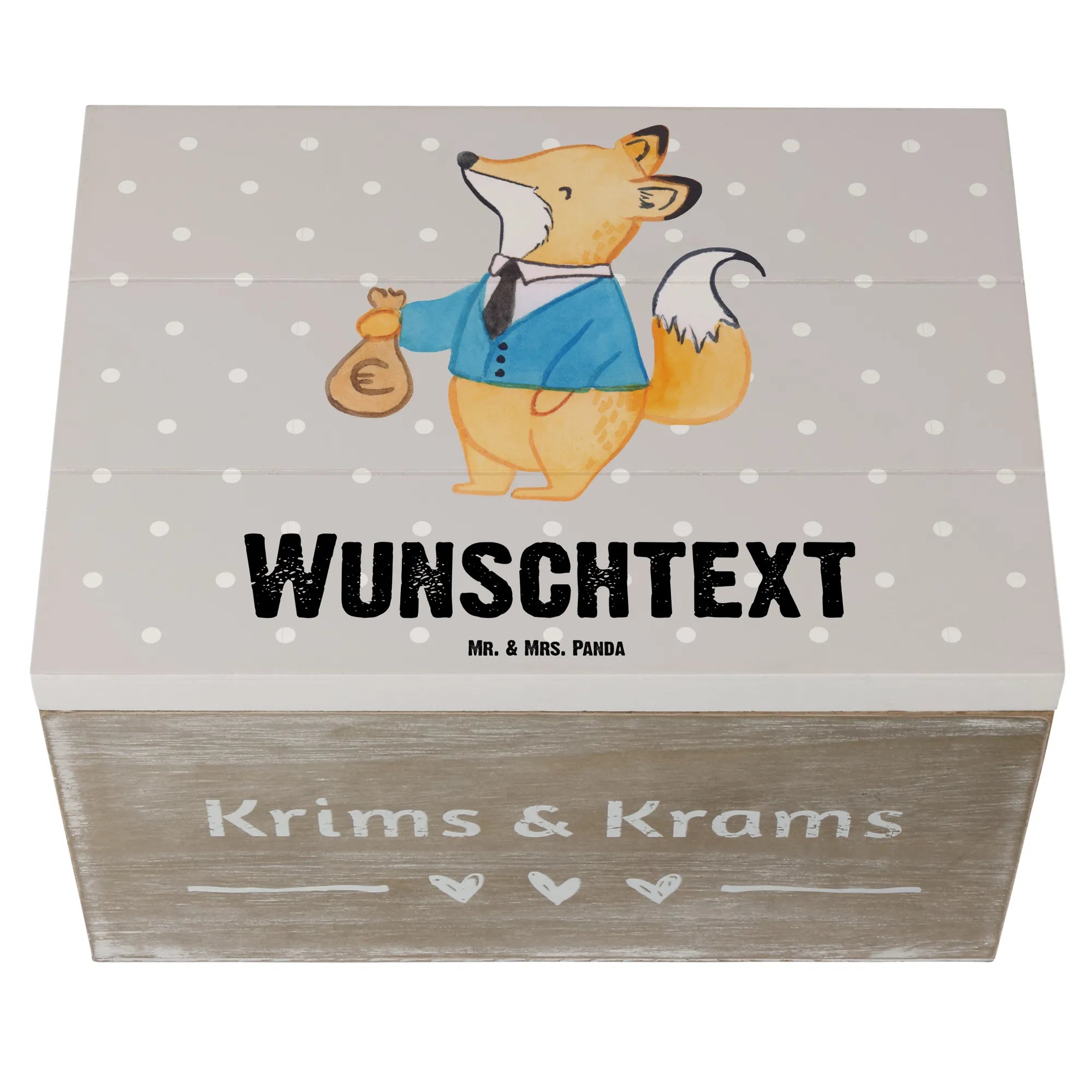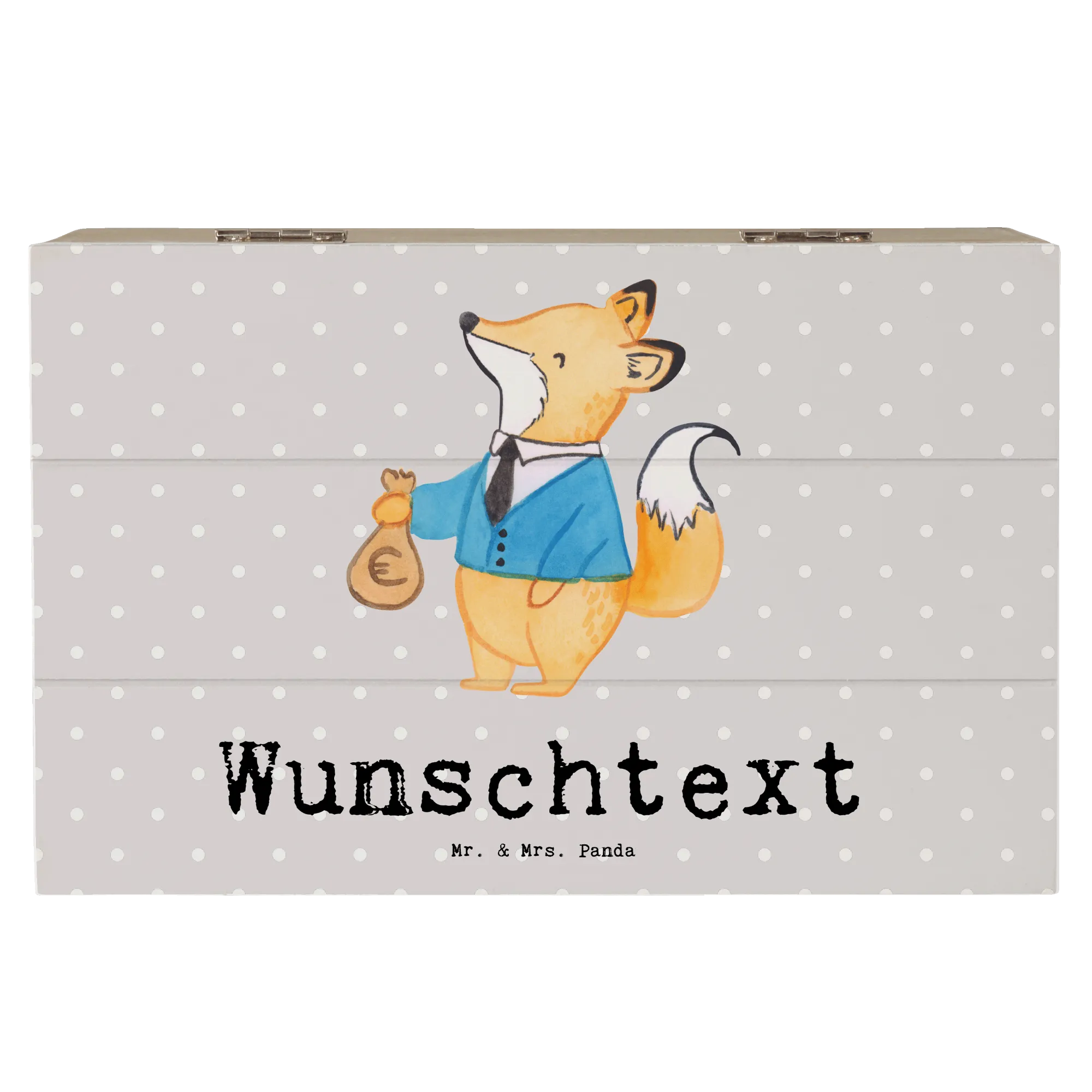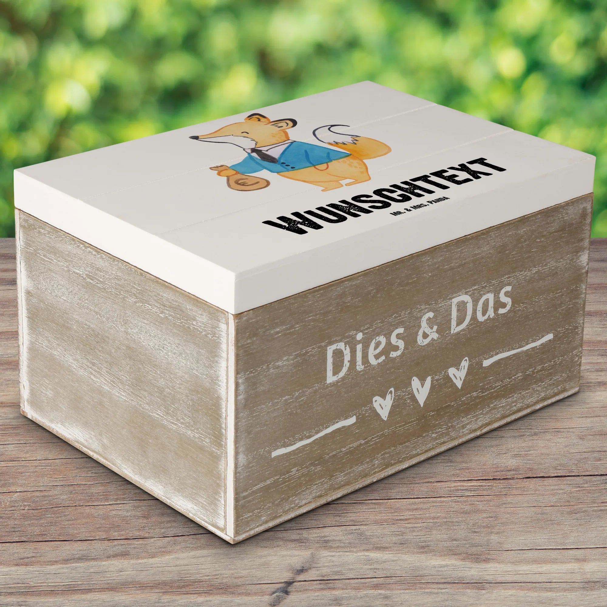 Entdecke die wunderschöne personalisierte Holzkiste "Steuerberater mit Herz" von Mr. & Mrs. Panda! Diese einzigartige Kiste ist nicht nur ein perfekter Aufbewahrungsort für all deine Schätze, sondern auch ein ganz persönliches Geschenk für deine Lieblingssteuerberater oder die Kollegin im Büro. Mit dem süßen Motiv eines Fuchses in schickem Anzug, der mit einem Säckchen Geld posiert, ist diese Kiste ein echter Blickfang.
