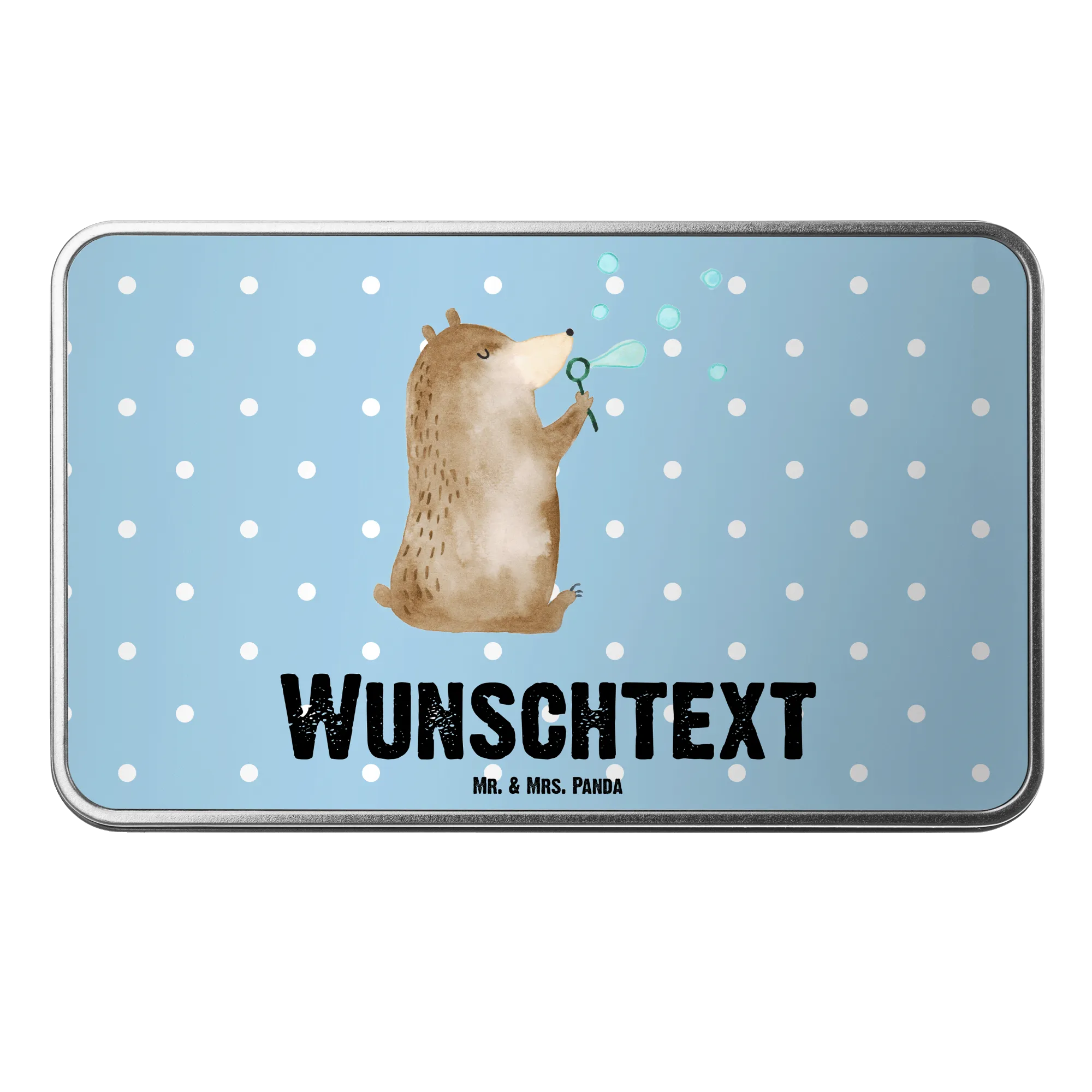 Die personalisierte Metalldose von Mr. & Mrs. Panda ist das perfekte Geschenk für große und kleine Bärenliebhaber. Diese wunderschöne, rechteckige Dose wird mit einem zauberhaften Bären-Motiv mit Seifenblasen bedruckt und bringt Freude in jeden Haushalt. Du kannst die Dose zudem mit deinem Wunschnamen oder Wunschtext personalisieren, sodass sie noch individueller wird. Der süße Bär auf der Dose zeigt mit seinen großen, strahlenden Augen, wie viel Freude es bereitet, Seifenblasen in die Luft zu blasen.