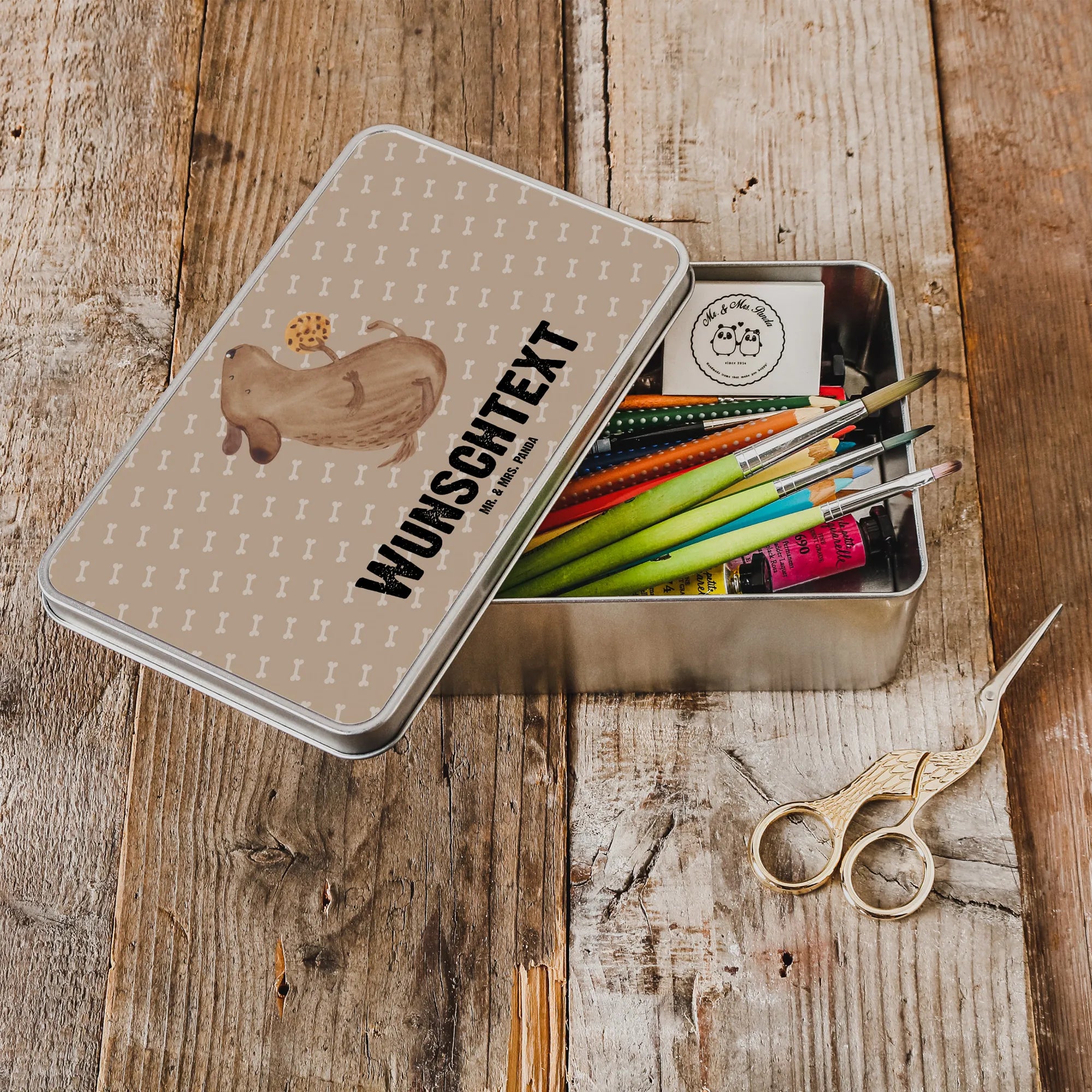 Die Personalisierte Metalldose mit dem niedlichen Hundekeks-Motiv aus der Hunde Kollektion von Mr. & Mrs. Panda ist das perfekte Geschenk für jeden Hundeliebhaber. Diese wunderschöne, rechteckige Metalldose ist nicht nur funktional, sondern auch ein echter Hingucker in Deiner Küche oder im Wohnbereich.