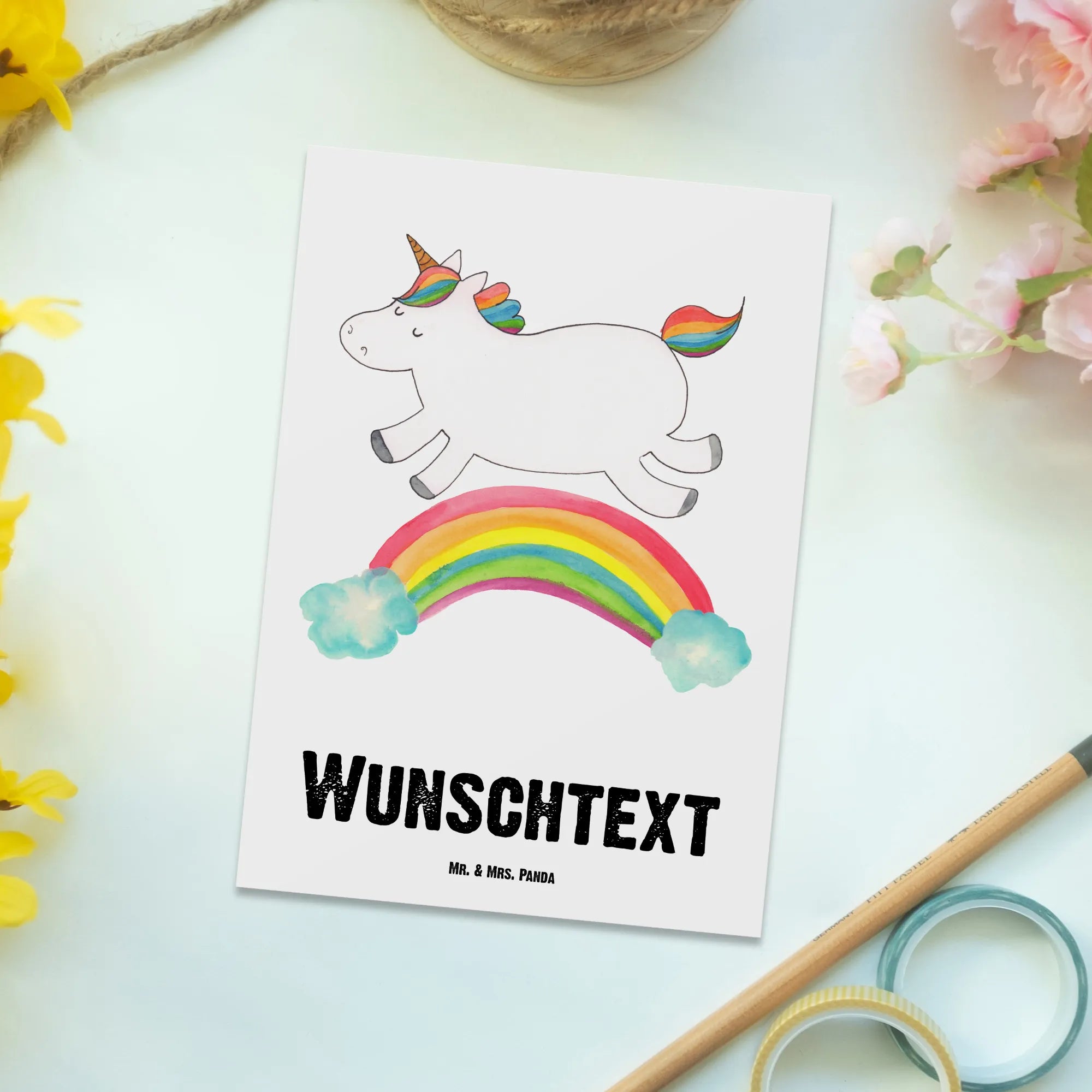 Schnapp dir jetzt deine personalisierte Postkarte mit dem beliebten Einhornmotiv und mache einen besonderen Menschen in deinem Leben glücklich. Jedes Motiv in unserer Einhorn-Kollektion wurde liebevoll von Mrs. Panda handgezeichnet, wodurch jede Karte zu einem Unikat wird. Diese bezaubernde Karte ist nicht nur traumhaft schön, sondern bringt auch eine Portion Einhornpower in den Alltag. Bestelle dir deine eigene Einhorn-Postkarte und zaubere jedem ein Lächeln ins Gesicht.