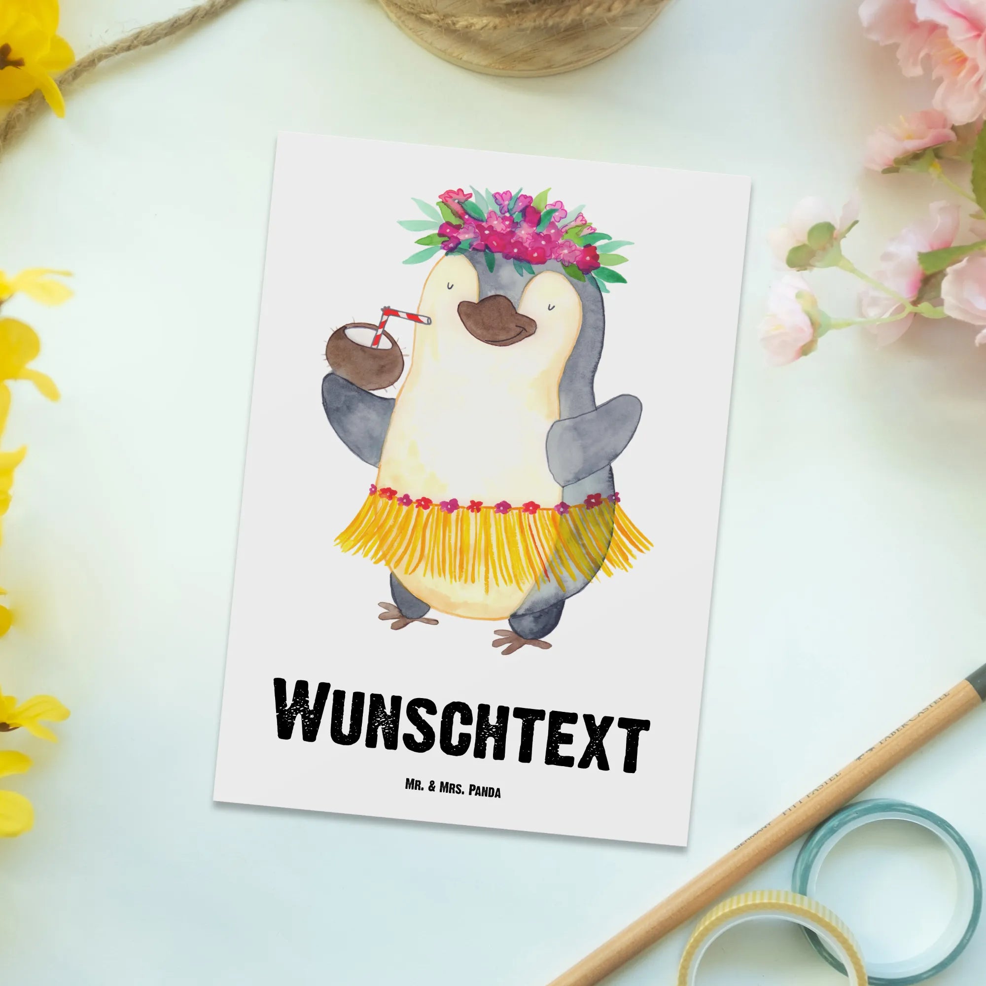Die Pinguin-Kollektion von Mr. & Mrs. Panda bringt kreative, handgezeichnete Motive und lebensfrohe Sprüche in dein Leben. In dieser Kollektion findest du überall niedliche Pinguine, die mit ihren charmanten Details Herzen erobern. Egal, ob im Urlaub oder im Alltag - mit dieser Karte schenkst du Freude und ganz individuelle Glücksmomente. Lass den Pinguin mit Kokosnuss deine Botschaft überbringen und zaubere ein Lächeln auf die Gesichter deiner Liebsten – denn ein bisschen Freude tut jedem gut!