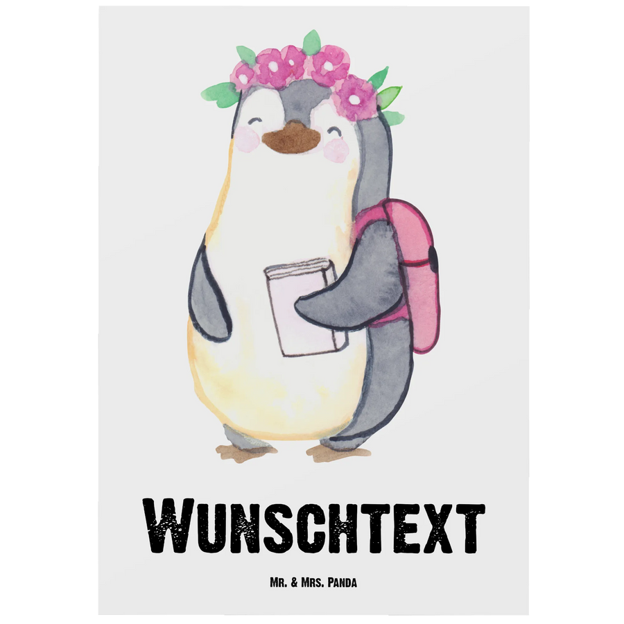 Die süße, handgezeichnete Figur eines weiblichen Pinguins mit Rucksack repräsentiert den Geist der Studentin und erinnert daran, wie wichtig Bildung und der Weg dorthin sind.