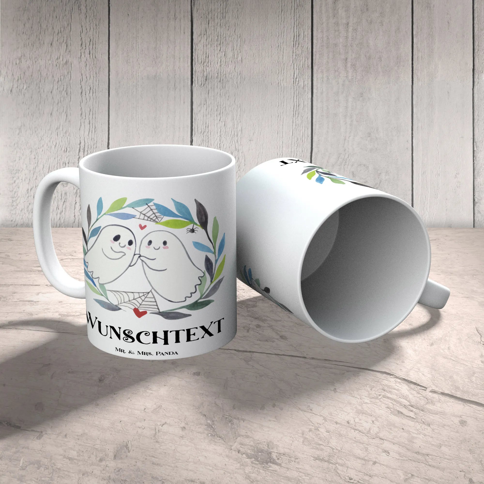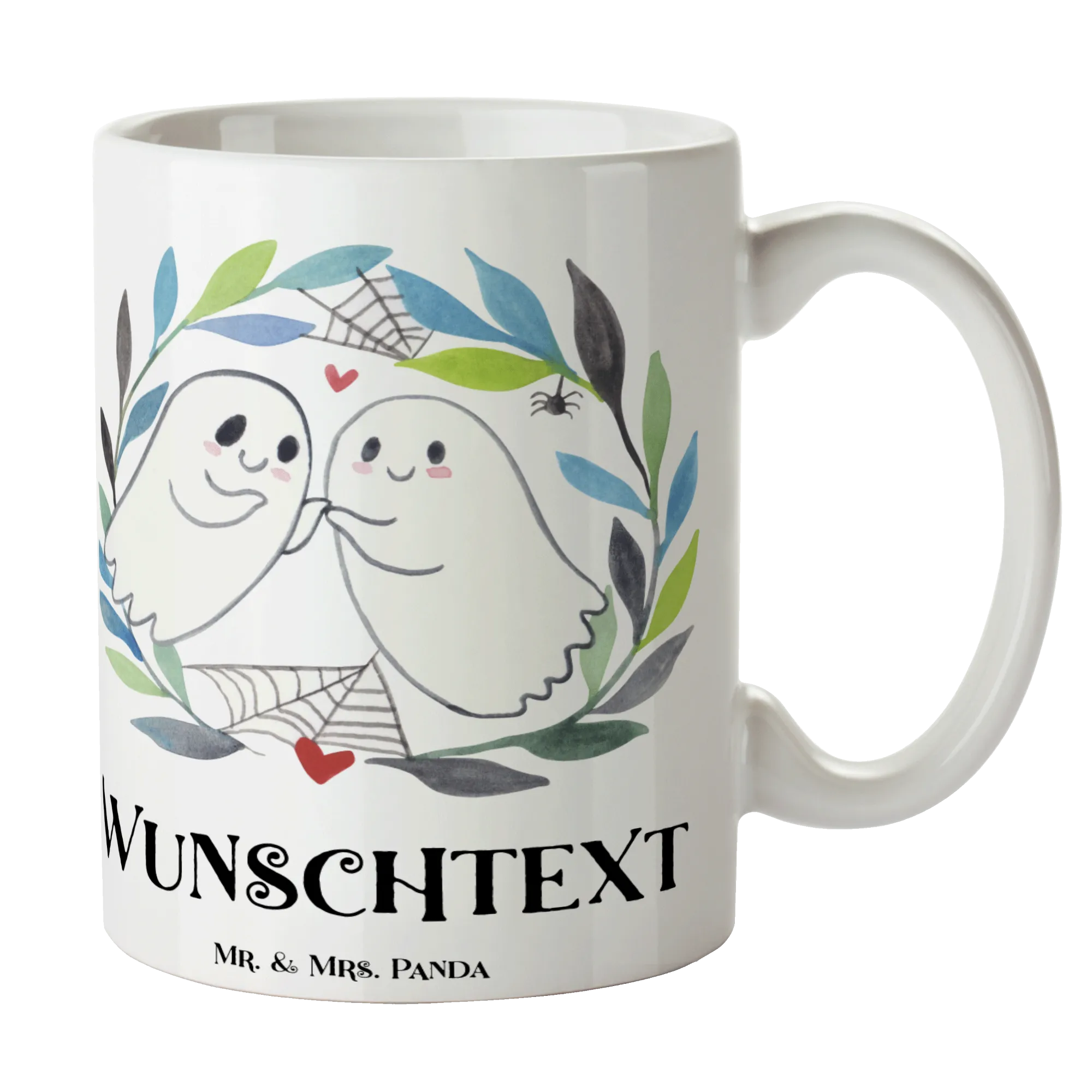Das bezaubernde Design zeigt ein süßes Gespensterpaar, das sich liebevoll in die Augen schaut und somit die perfekte Verbindung zwischen Romantik und Halloween herstellt. Umrahmt von einer wunderschönen blauen und grünen Blättergirlande sowie feinen Spinnweben, strahlt diese Tasse einen Hauch von Mystik aus.