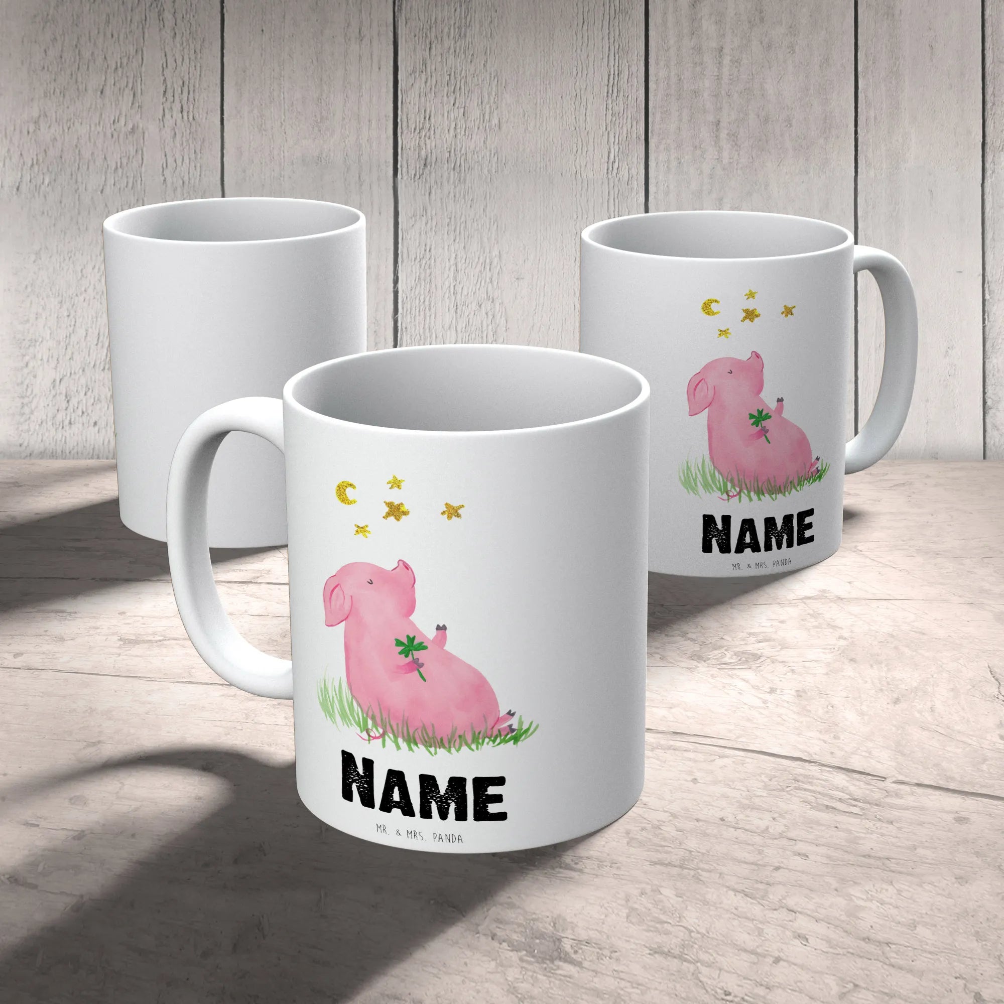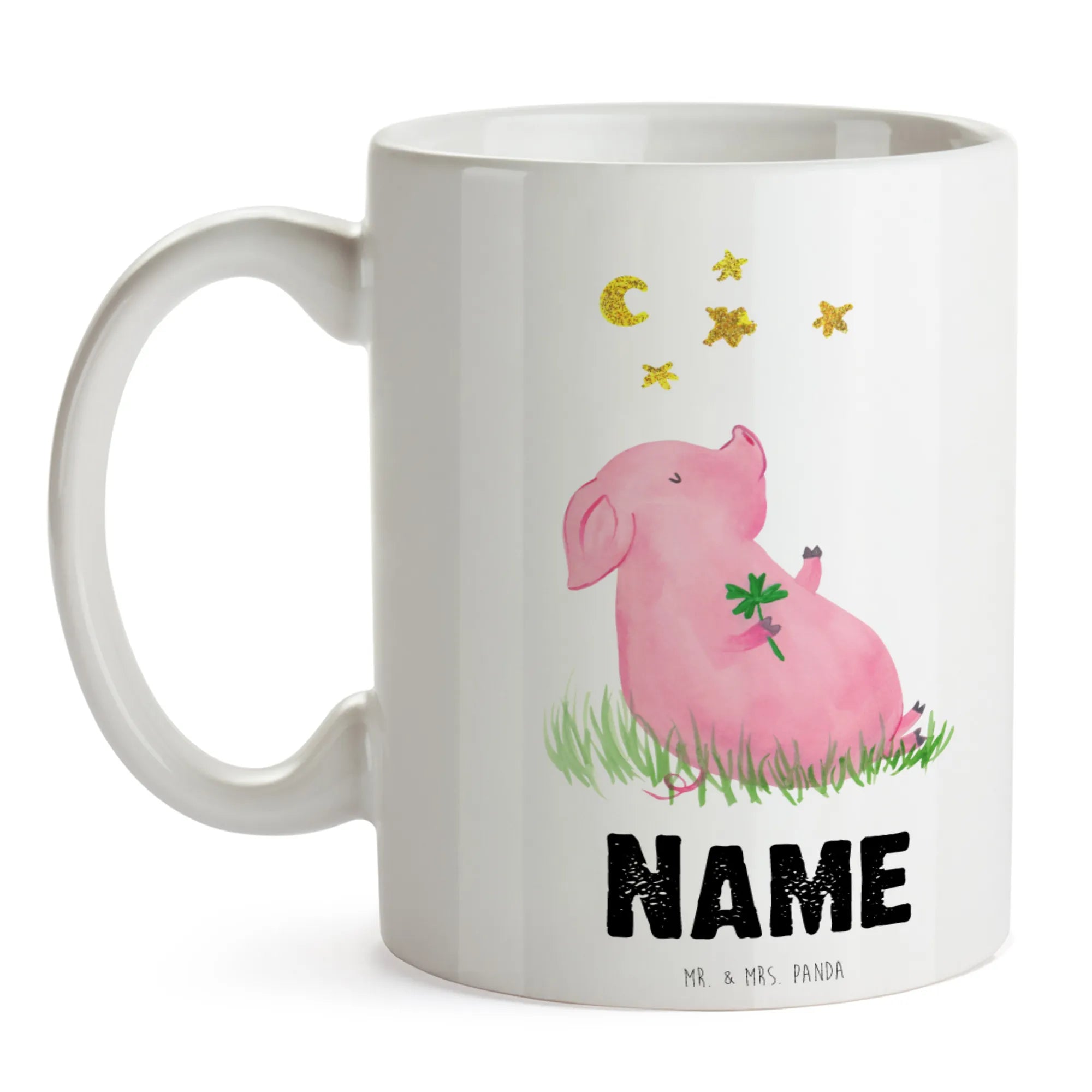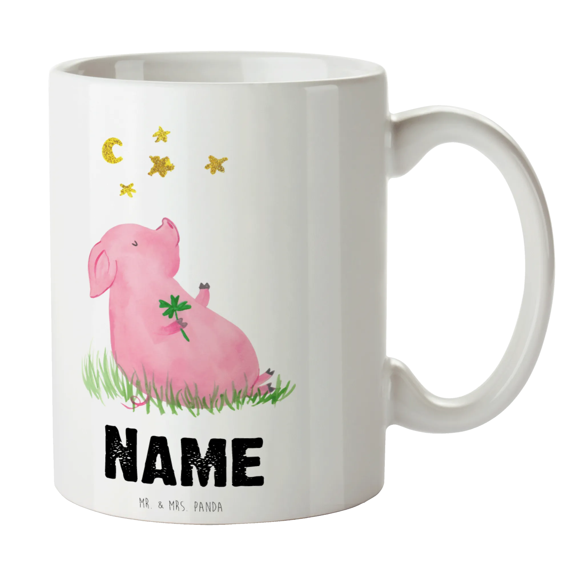 Entdecke die zauberhafte Welt der personalisierten Tassen von Mr. & Mrs. Panda! Die perfekte Geschenkidee für Dich und Deine Liebsten – insbesondere für alle Träumer und Glücksjäger! Unsere wunderschöne personalisierbare Tasse mit dem süßen Glücksschwein-Motiv aus der Small World Kollektion bringt ein Lächeln auf jedes Gesicht. Das schöne Motiv zeigt ein kleines Schweinchen, das ein Kleeblatt in der Hand hält, – das Symbol für Glück und positive Energie.