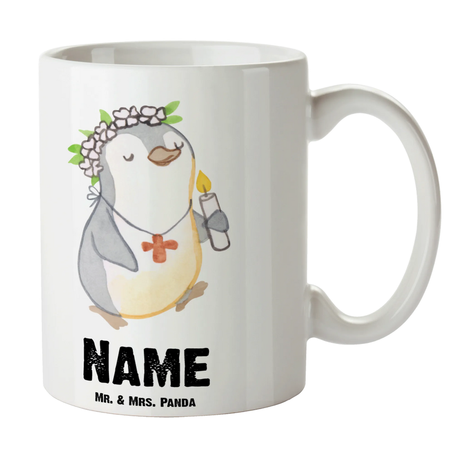 Die personalisierte Tasse "Pinguin Kommunion Mädchen" von Mr. & Mrs. Panda ist das perfekte Geschenk zur Kommunion! Hochwertig verarbeitet aus langlebiger Keramik, überzeugt diese Tasse durch ihr süßes Design eines Pinguin-Mädchens mit Blumen auf dem Kopf, einer goldenen Halskette mit einem Kreuz und einer Kerze in der Hand.